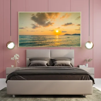 استمتع بجمال الغروب الساحر مع هذه اللوحة التي تجسد لحظة هادئة على شاطئ البحر. الألوان الدافئة والمياه المتلألئة تضفي لمسة من السكينة والأناقة على أي مساحة. اجعل من منزلك ملاذًا يعكس جمال الطبيعة وروح الهدوء.