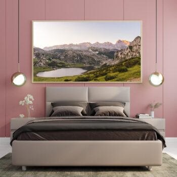 لوحة جبال – بحيرة هادئة – ألوان دافئة – مشمس – لوحات طبيعة – لوحات كانفاس