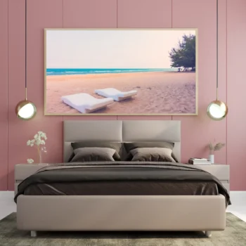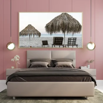 استمتع بجمال الطبيعة مع هذه اللوحة الفنية التي تجسد لحظة هادئة على الشاطئ، حيث يلتقي لون السماء الزاهي مع أمواج البحر المتلألئة. تضفي المظلة الوردية لمسة من الحيوية، مما يجعلها إضافة مثالية لأي مساحة تبحث عن لمسة من الأناقة والاسترخاء.
