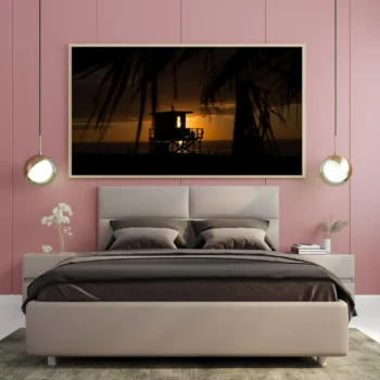 استمتع بجمال الغروب الساحر مع هذه اللوحة الفنية التي تلتقط لحظة هادئة على شاطئ البحر. تبرز silhouette برج المراقبة في تناغم رائع مع الألوان الدافئة للسماء، مما يضفي لمسة من السحر والهدوء على أي مساحة. أضف لمسة فنية مميزة إلى جدران منزلك مع هذه التحفة الفريدة.