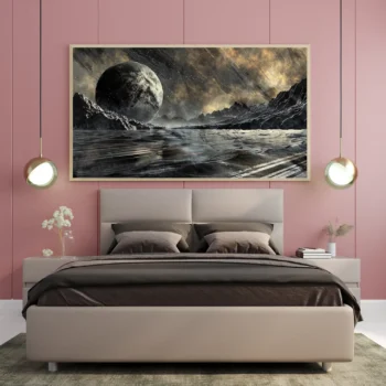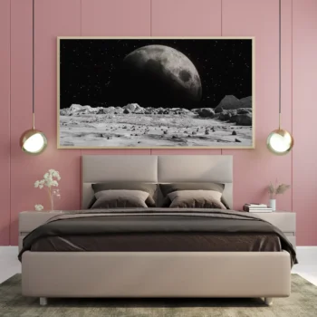 استمتع بجمال الفضاء مع هذه اللوحة الرائعة التي تبرز عظمة القمر في سماء الليل. تضفي تفاصيلها الدقيقة وألوانها المدهشة لمسة من السحر والغموض على أي مساحة، مما يجعلها خيارًا مثاليًا لعشاق الفلك والفن. اجعل من جدران منزلك لوحة تعبر عن شغفك بالكون.