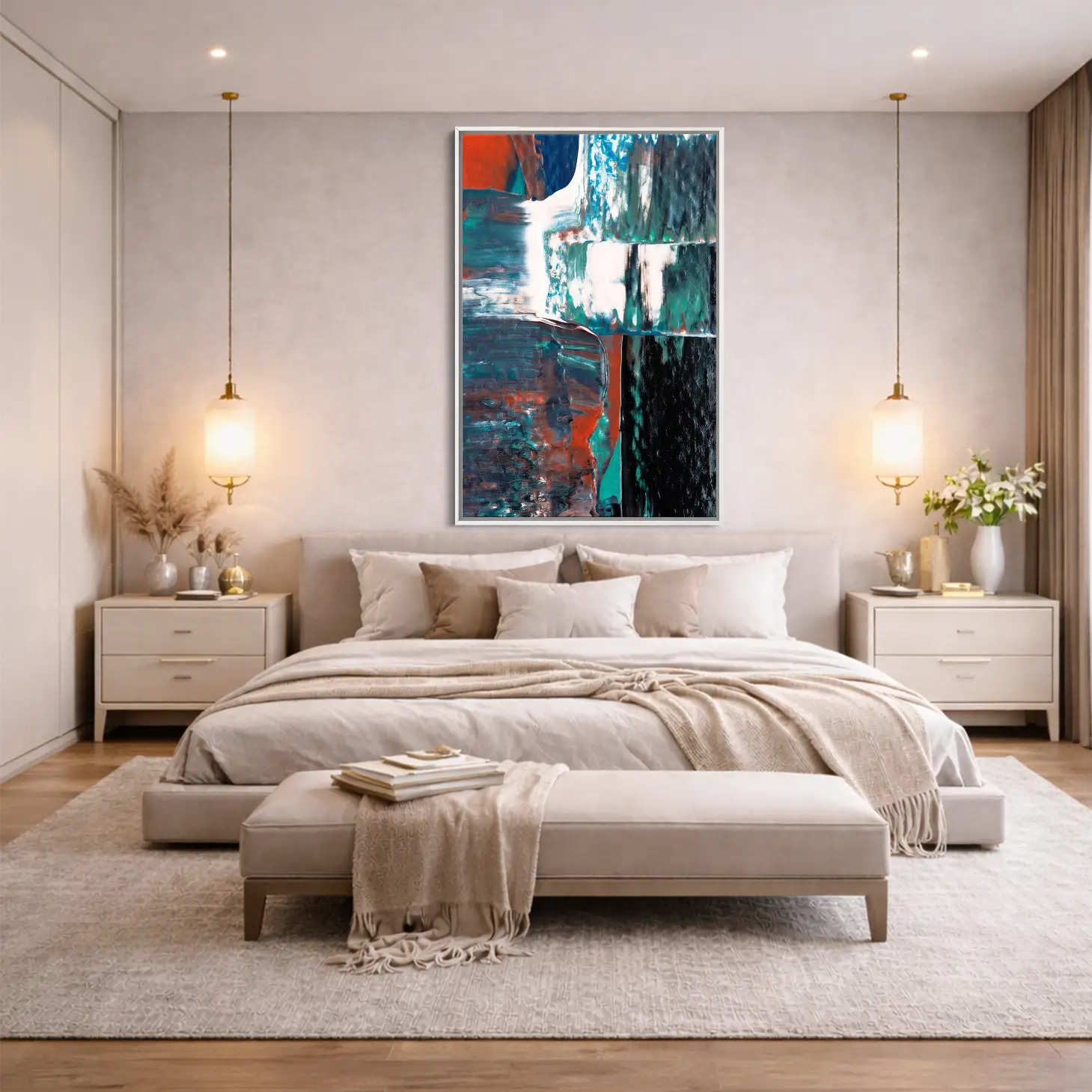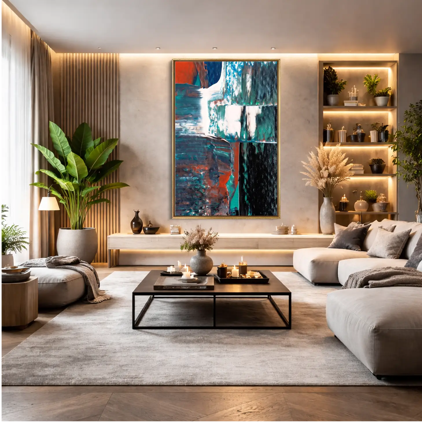 استمتع بجمال هذه اللوحة الفنية الفاخرة التي تجمع بين الألوان الدافئة والتصميم العصري، مما يضفي لمسة من الأناقة على أي مساحة. تتوفر بمقاسات متعددة وإطارات متنوعة، مما يجعلها خيارًا مثاليًا للتزيين أو كهدية تعبّر عن الذوق الرفيع في المناسبات الخاصة. اجعل من كل زاوية في منزلك لوحة فنية تنبض بالحياة والجمال.
