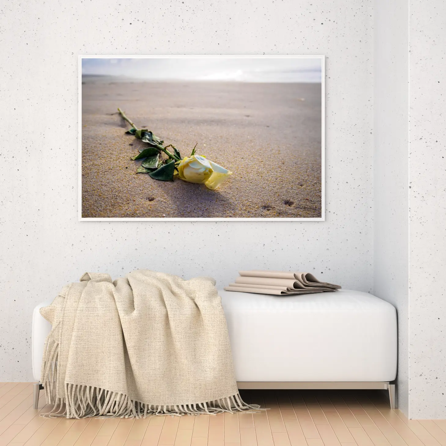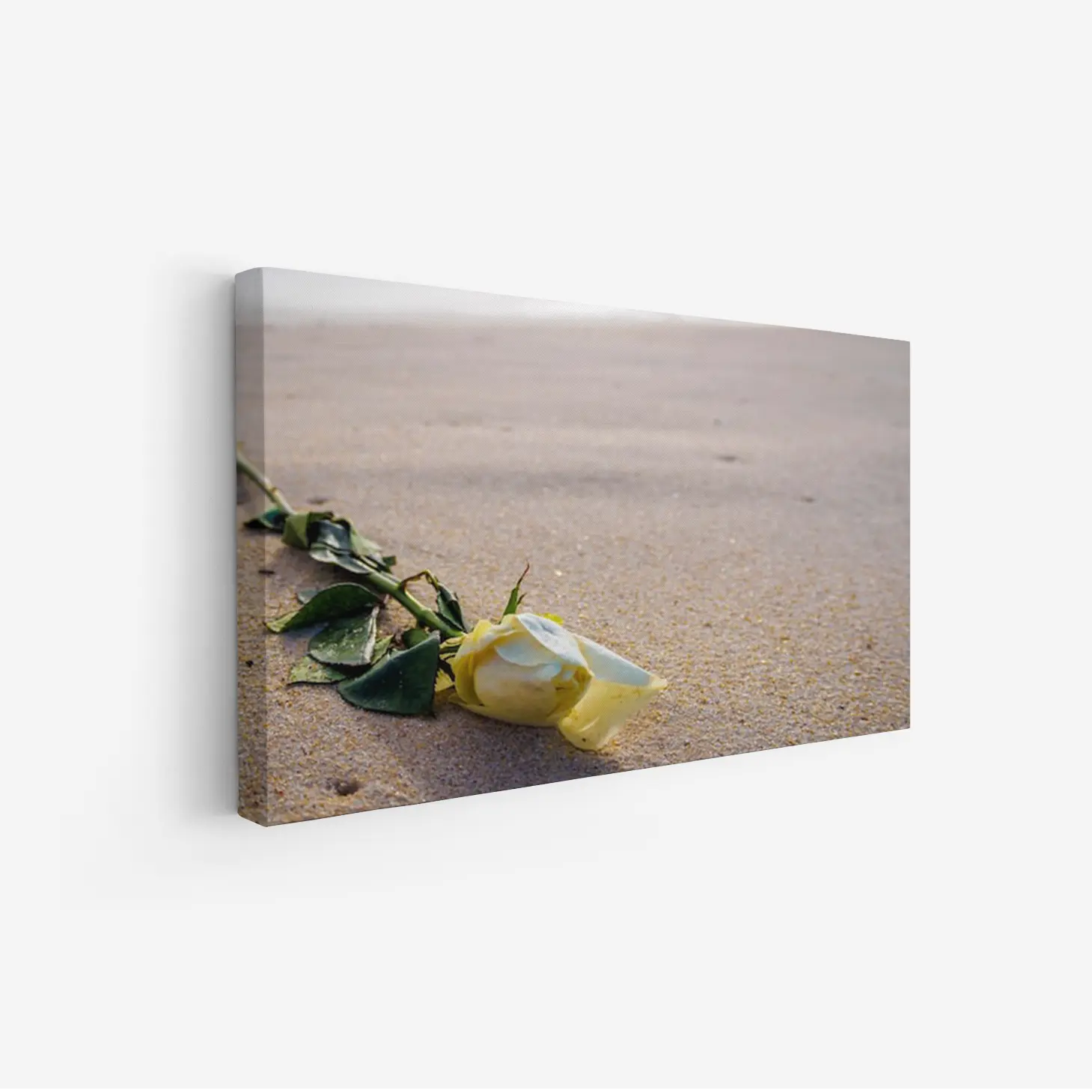 لوحات طبيعة تحمل وردة بيضاء على رمال الشاطئ، بألوان دافئة وجو هادئ. لوحات فنية عصرية، لوحات جدارية للمنزل، لوحات أنيقة.