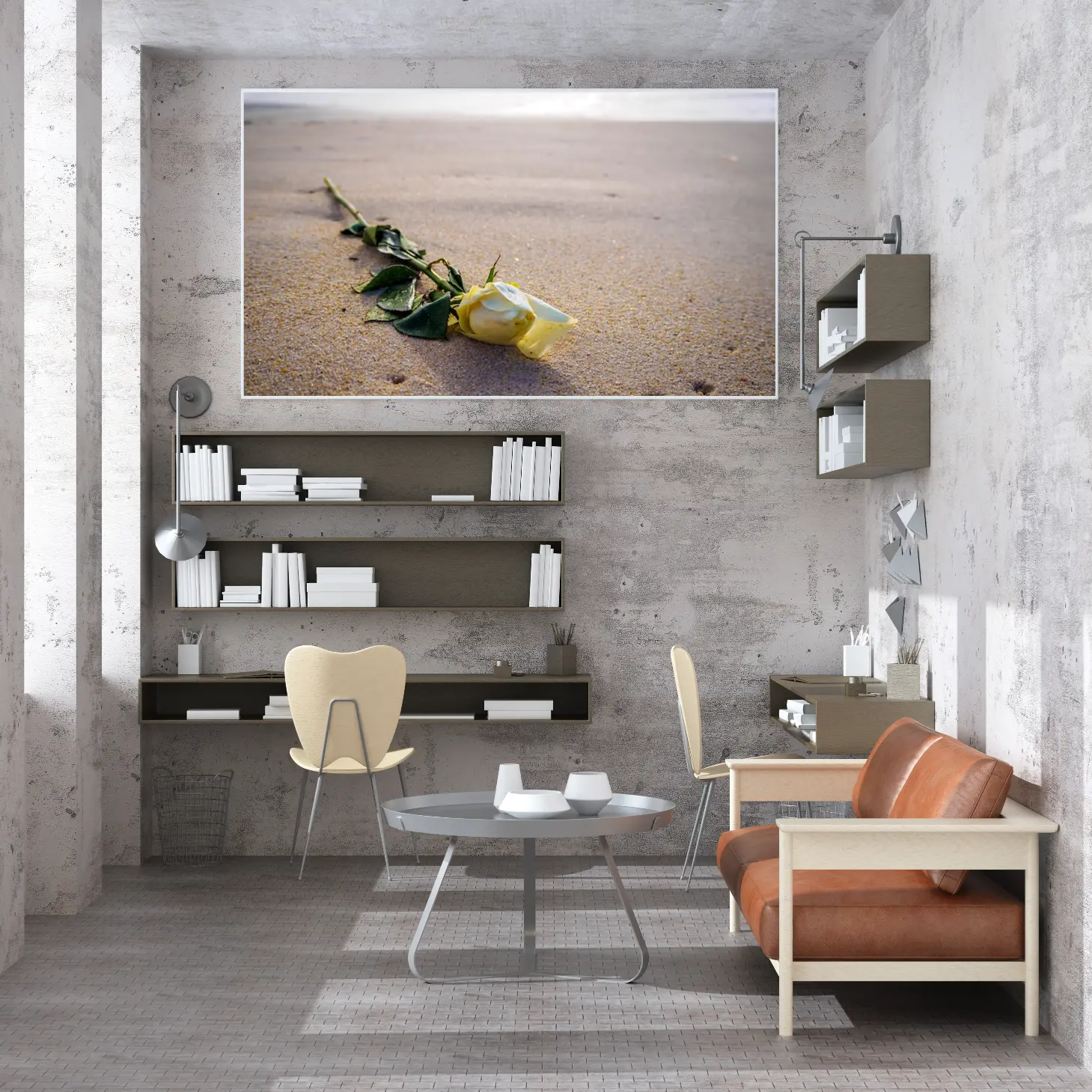 تعتبر هذه اللوحات جزءًا من فن الديكور المنزلي العصري، حيث تساهم في خلق أجواء مريحة ومليئة بالدفء. يمكن استخدامها في مختلف الأماكن، سواء كانت غرفة المعيشة أو غرفة النوم، لتضفي لمسة من الجمال الطبيعي. إن تباين الألوان بين الزهرة والرمال يخلق توازنًا بصريًا يجذب الأنظار ويعزز من جمالية المكان.