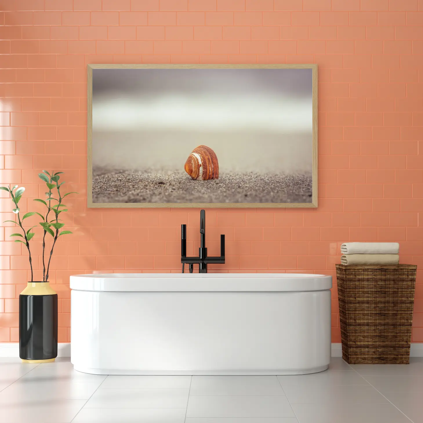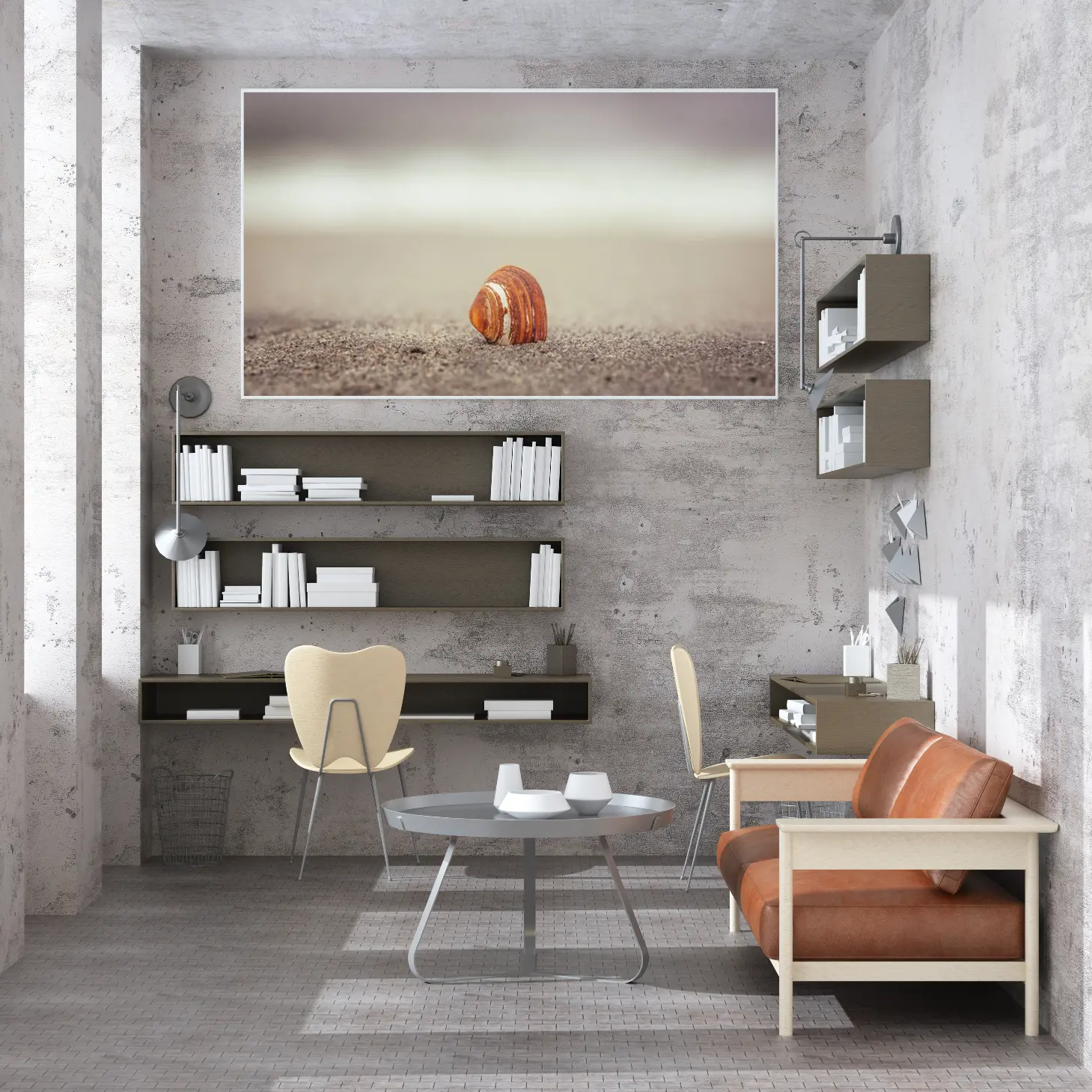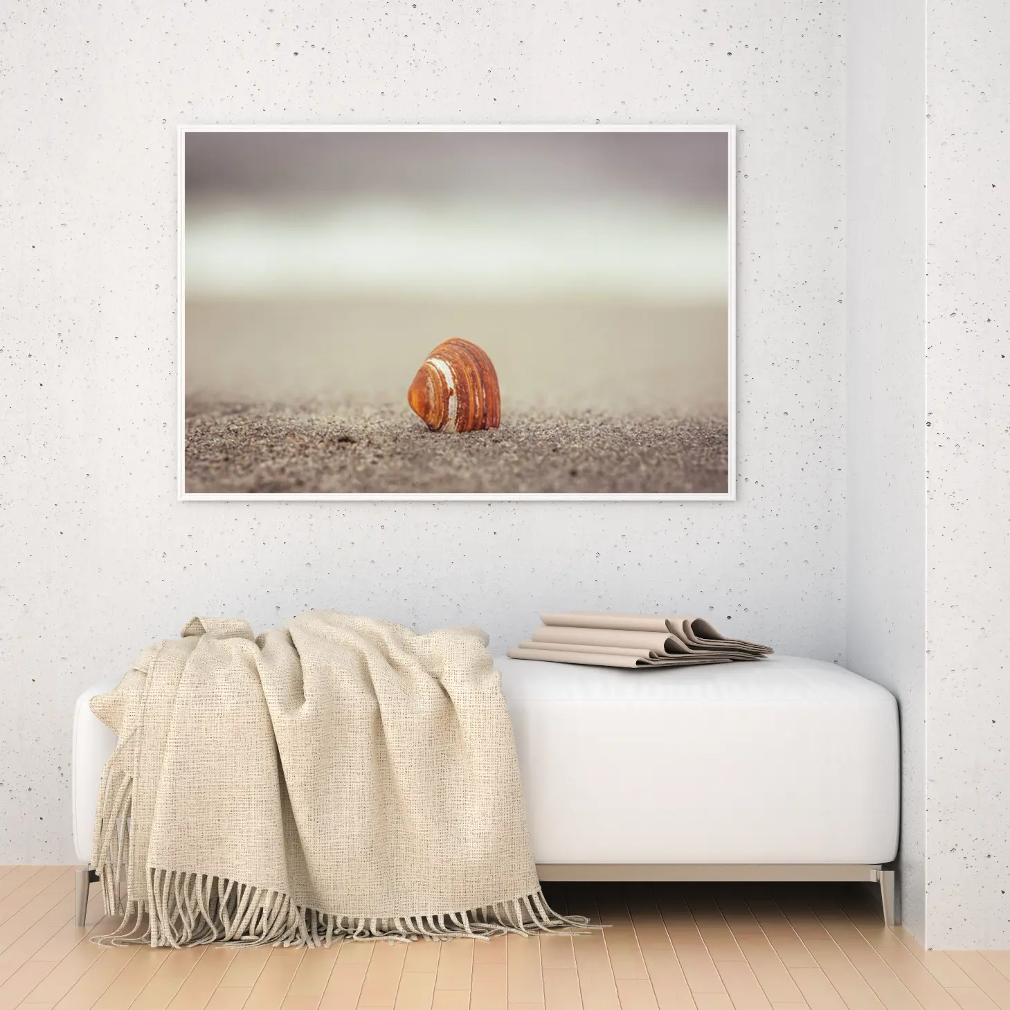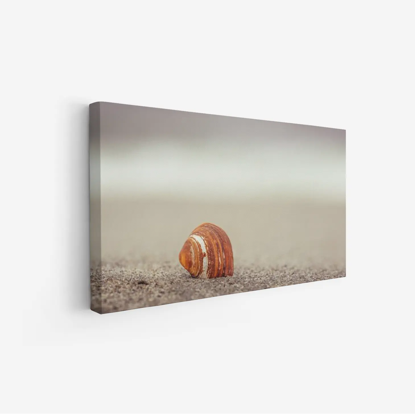 لوحات طبيعة تعكس جمال قشرة صدفة على الرمال بلون بني دافئ مع خلفية هادئة، لوحات جدارية للمنزل، لوحات فخمة.