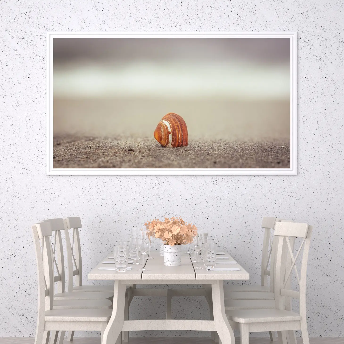استمتع بجمال الطبيعة مع هذه اللوحة الفنية الرائعة التي تبرز تفاصيل قشرة بحرية تتلألأ على رمال الشاطئ. تضفي الألوان الهادئة والأجواء الساكنة لمسة من السكينة والهدوء على أي مساحة، مما يجعلها خيارًا مثاليًا لإثراء ديكور منزلك.