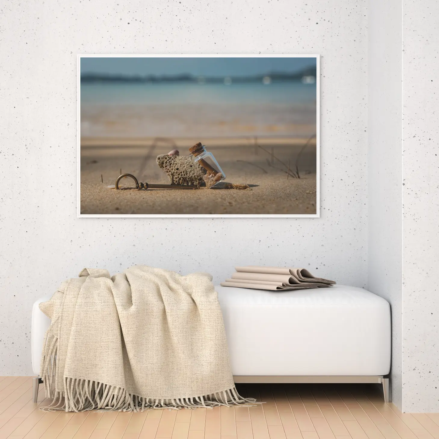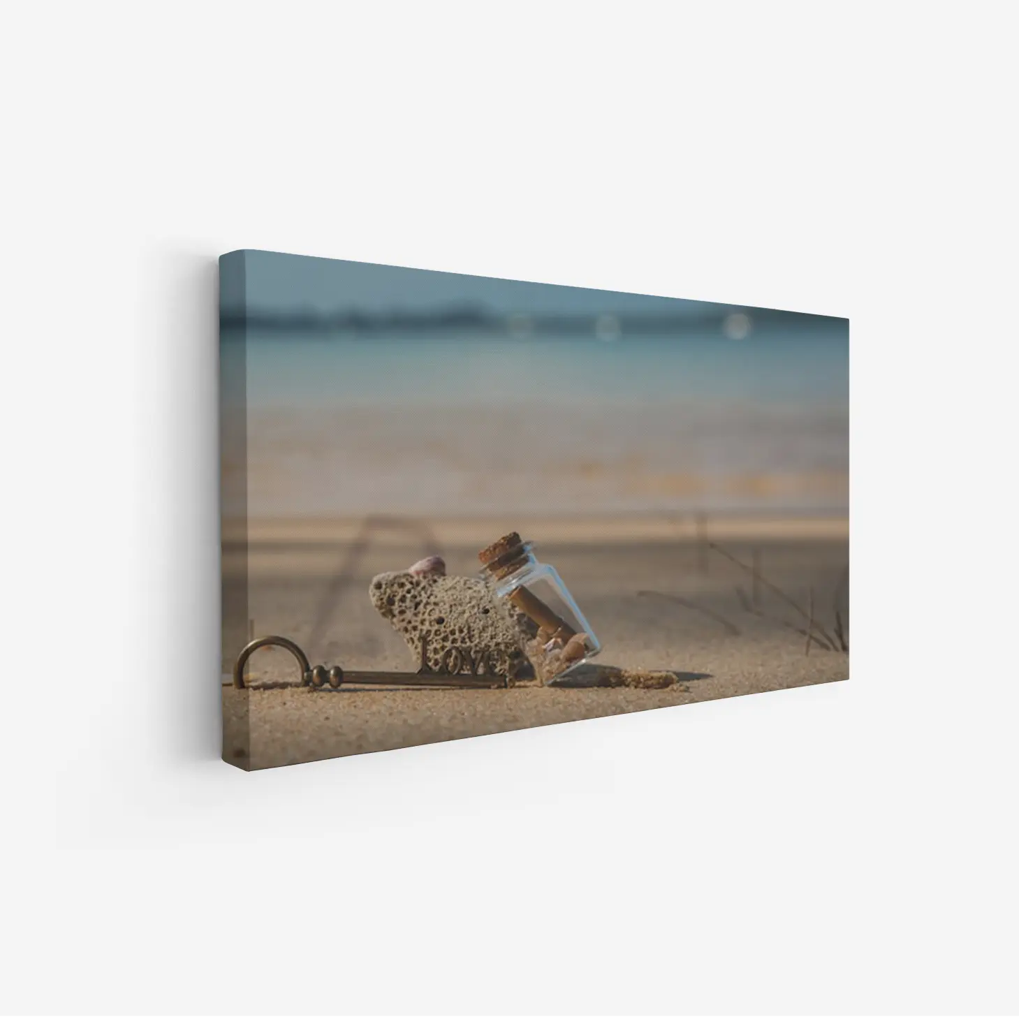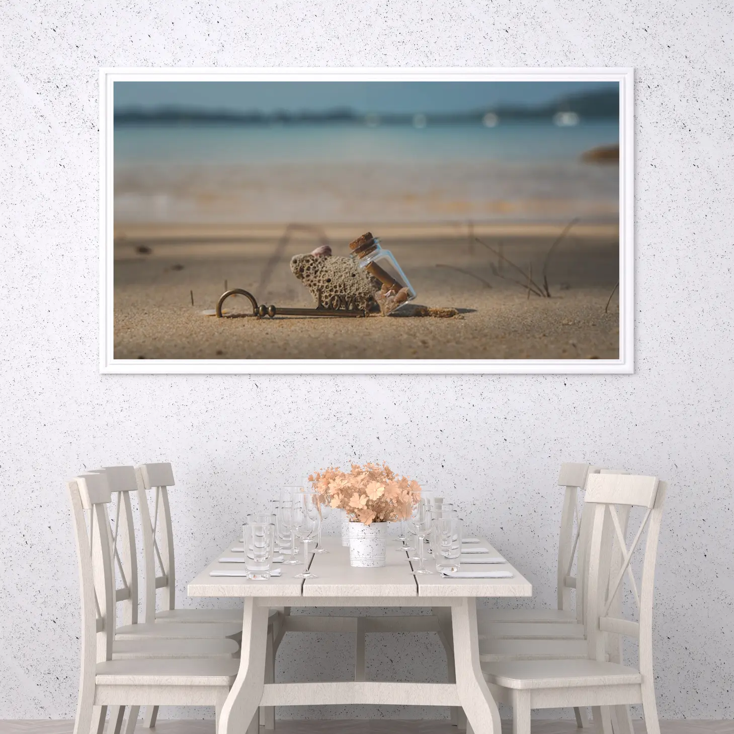 تجسد هذه اللوحات كانفاس روح البحر وجمال الطبيعة، حيث تلتقي عناصر فريدة لتخلق تجربة بصرية مدهشة. تتوسط المشهد قطعة من الحجر المرجاني، التي تضفي لمسة من الأصالة والعمق، بينما تتناغم مع زجاجة صغيرة تحتوي على رسائل مختبئة، مما يثير فضول المشاهد ويشجع على استكشاف القصص الكامنة وراءها. الألوان الهادئة التي تميز الخلفية تعكس صفاء السماء والماء، مما يخلق توازنًا مثاليًا بين العناصر.