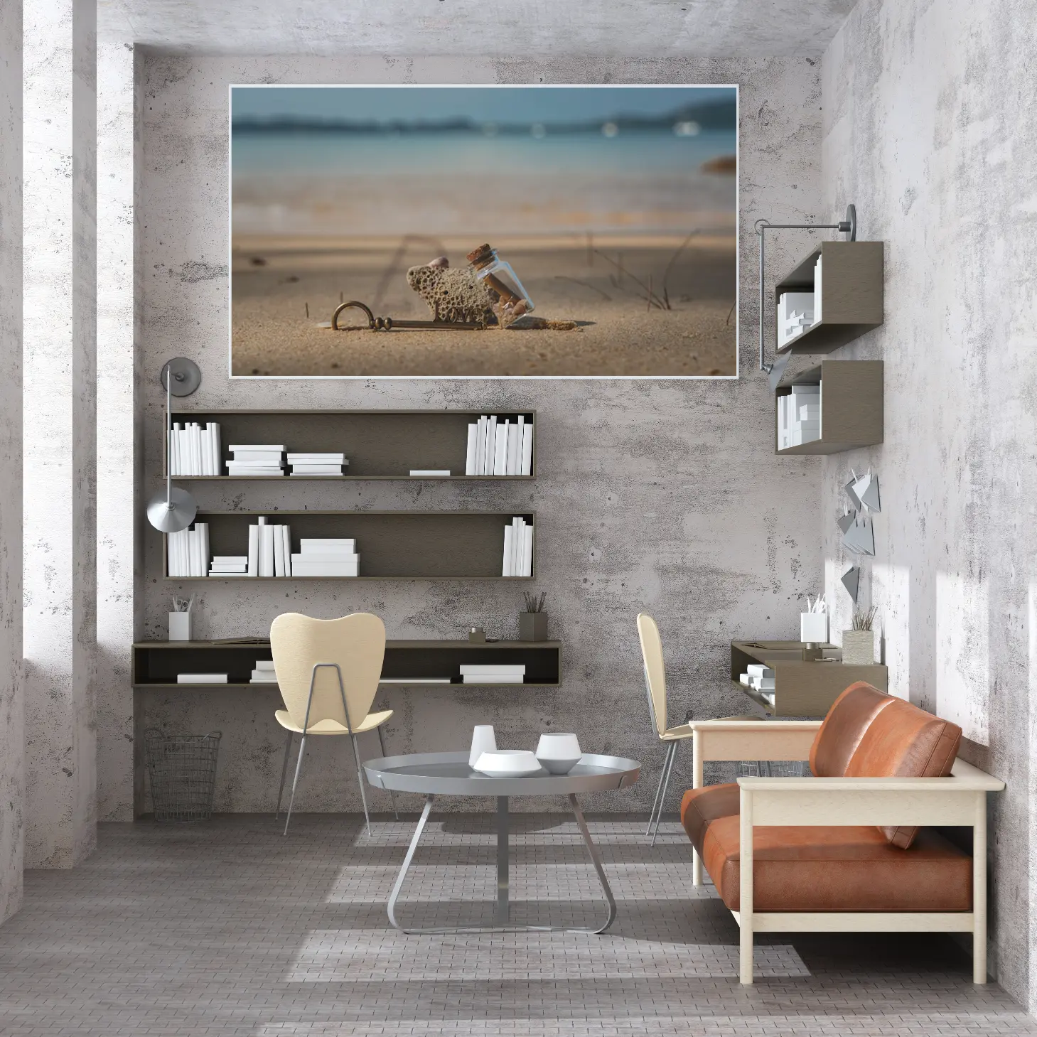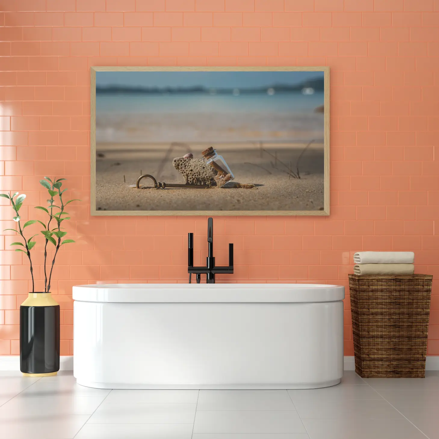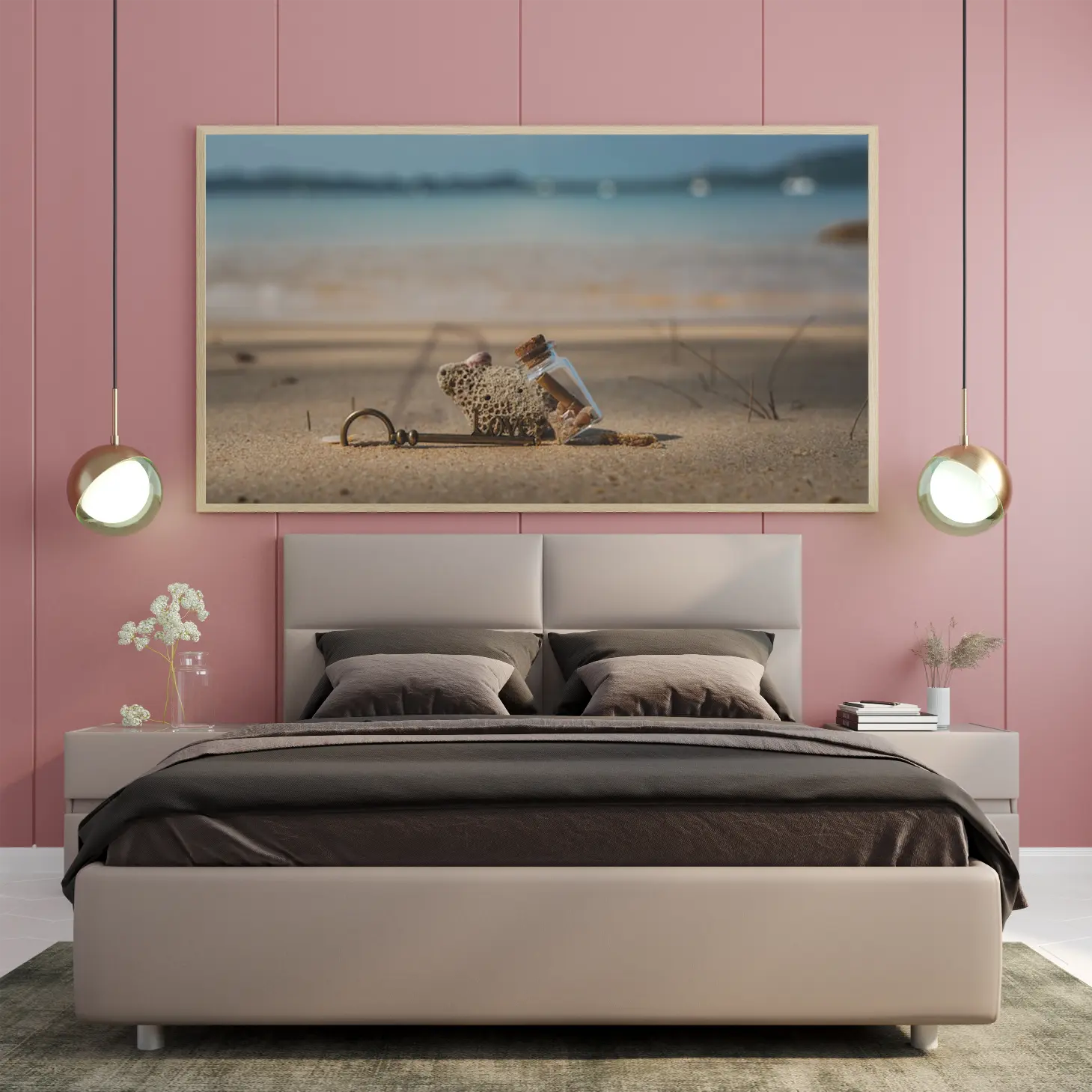 تجسد هذه اللوحات كانفاس روح البحر وجمال الطبيعة، حيث تلتقي عناصر فريدة لتخلق تجربة بصرية مدهشة. تتوسط المشهد قطعة من الحجر المرجاني، التي تضفي لمسة من الأصالة والعمق، بينما تتناغم مع زجاجة صغيرة تحتوي على رسائل مختبئة، مما يثير فضول المشاهد ويشجع على استكشاف القصص الكامنة وراءها. الألوان الهادئة التي تميز الخلفية تعكس صفاء السماء والماء، مما يخلق توازنًا مثاليًا بين العناصر.