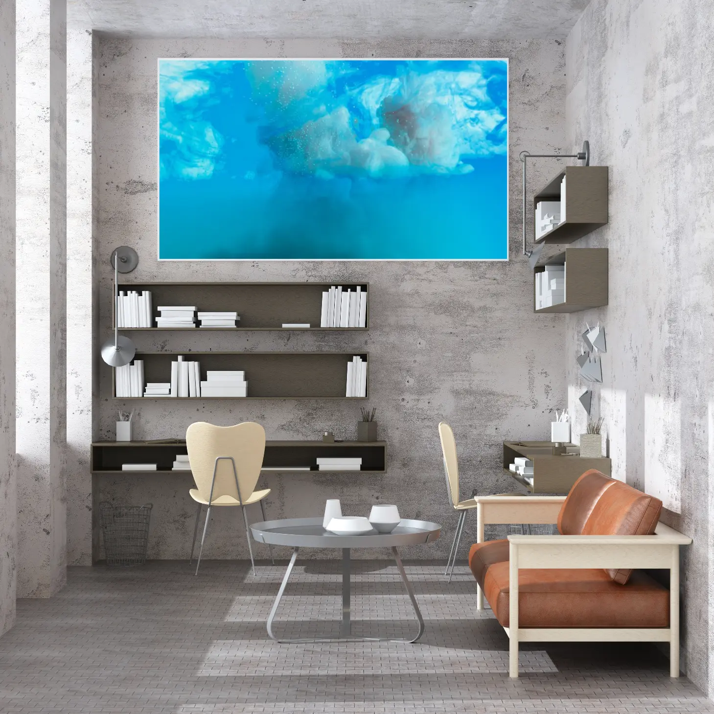 لوحات فن عصري بألوان زرقاء مبهجة مع تأثيرات سحابية، جو مائي هادئ، لوحات جدارية للمنزل، لوحات فنية عصرية.