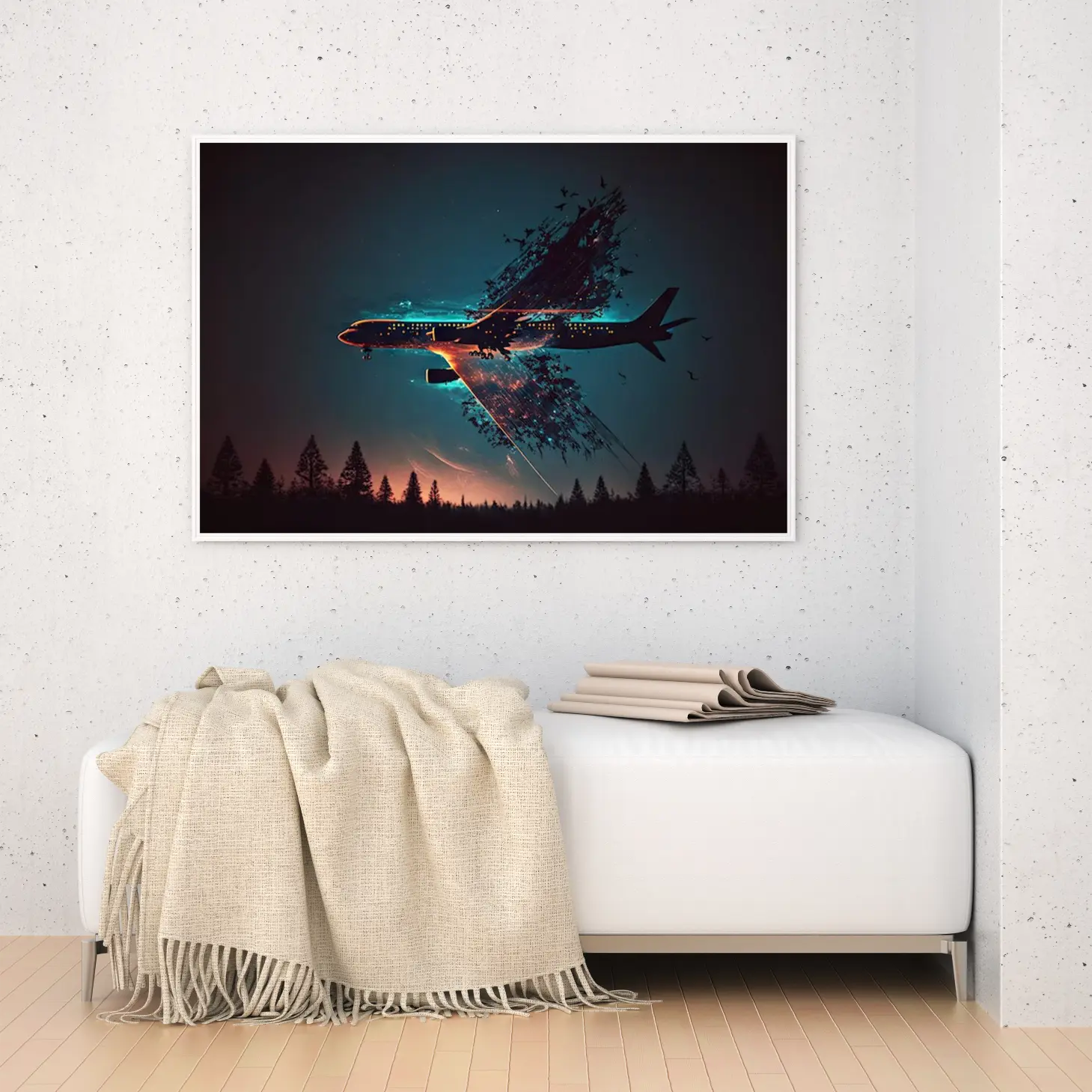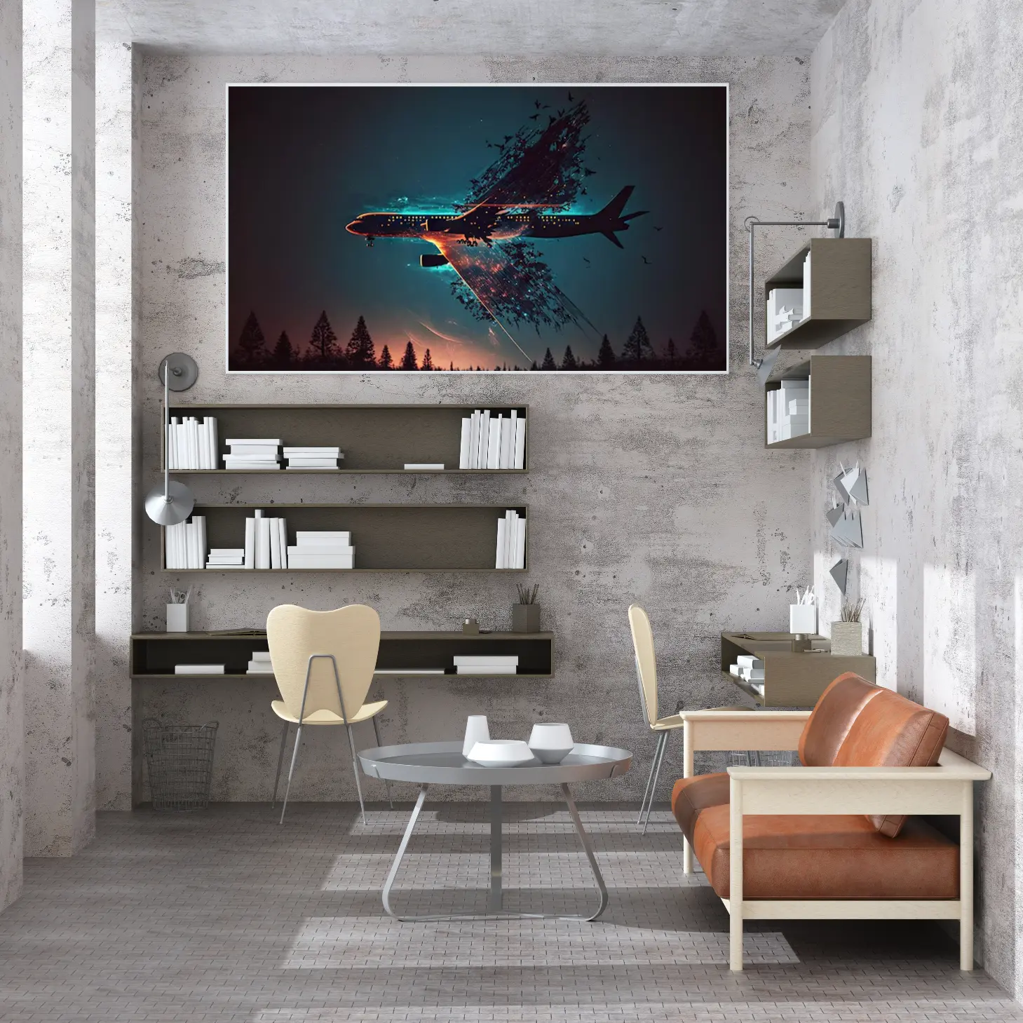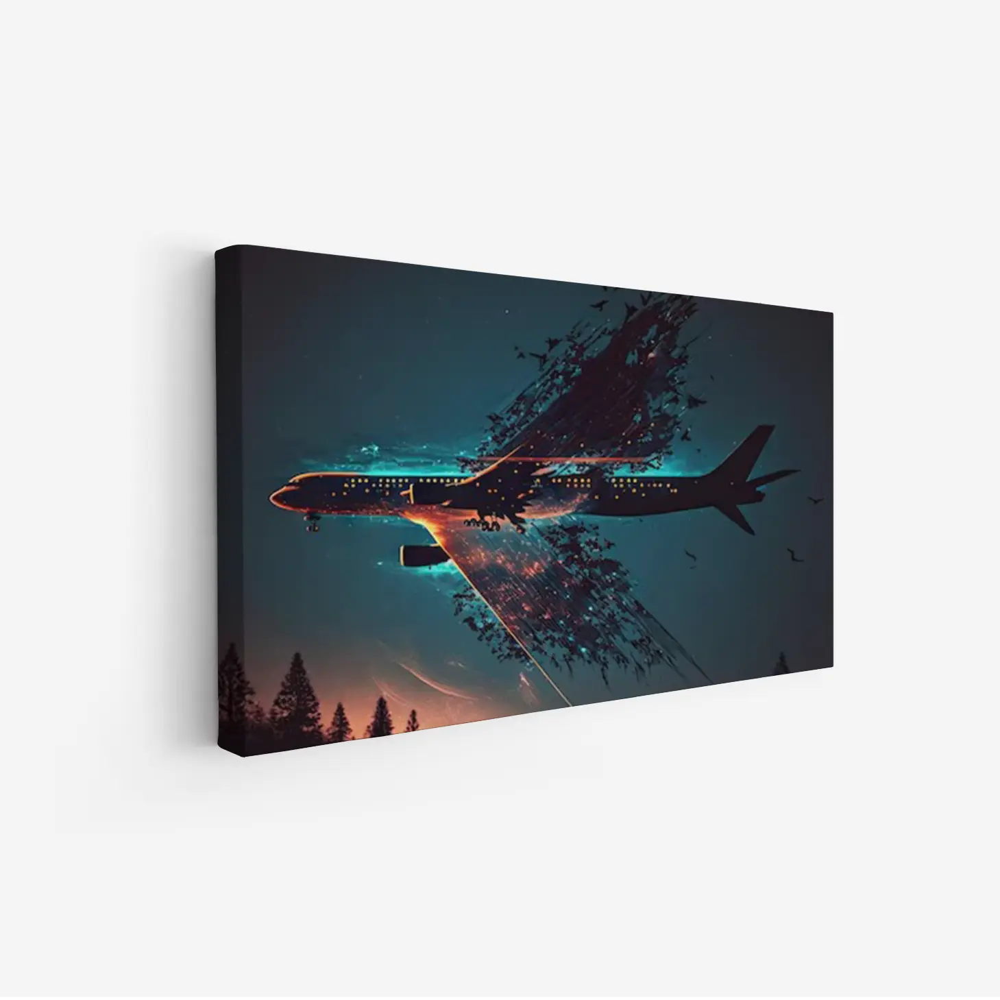 تجسد هذه اللوحات كانفاس رؤية فنية مدهشة تجمع بين عناصر الطبيعة والحداثة، حيث يظهر الطائرة في مشهد ساحر يتداخل فيه الواقع مع الخيال. الألوان الداكنة والخلفية الزرقاء تضفي عمقًا على العمل، مما يجعله قطعة فنية مثالية تضفي لمسة من الغموض والجاذبية على أي مساحة.