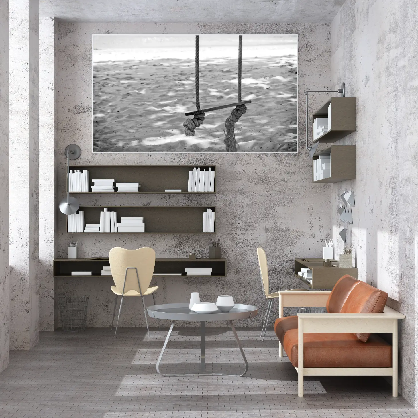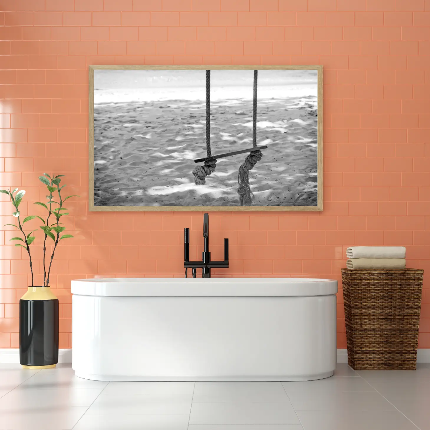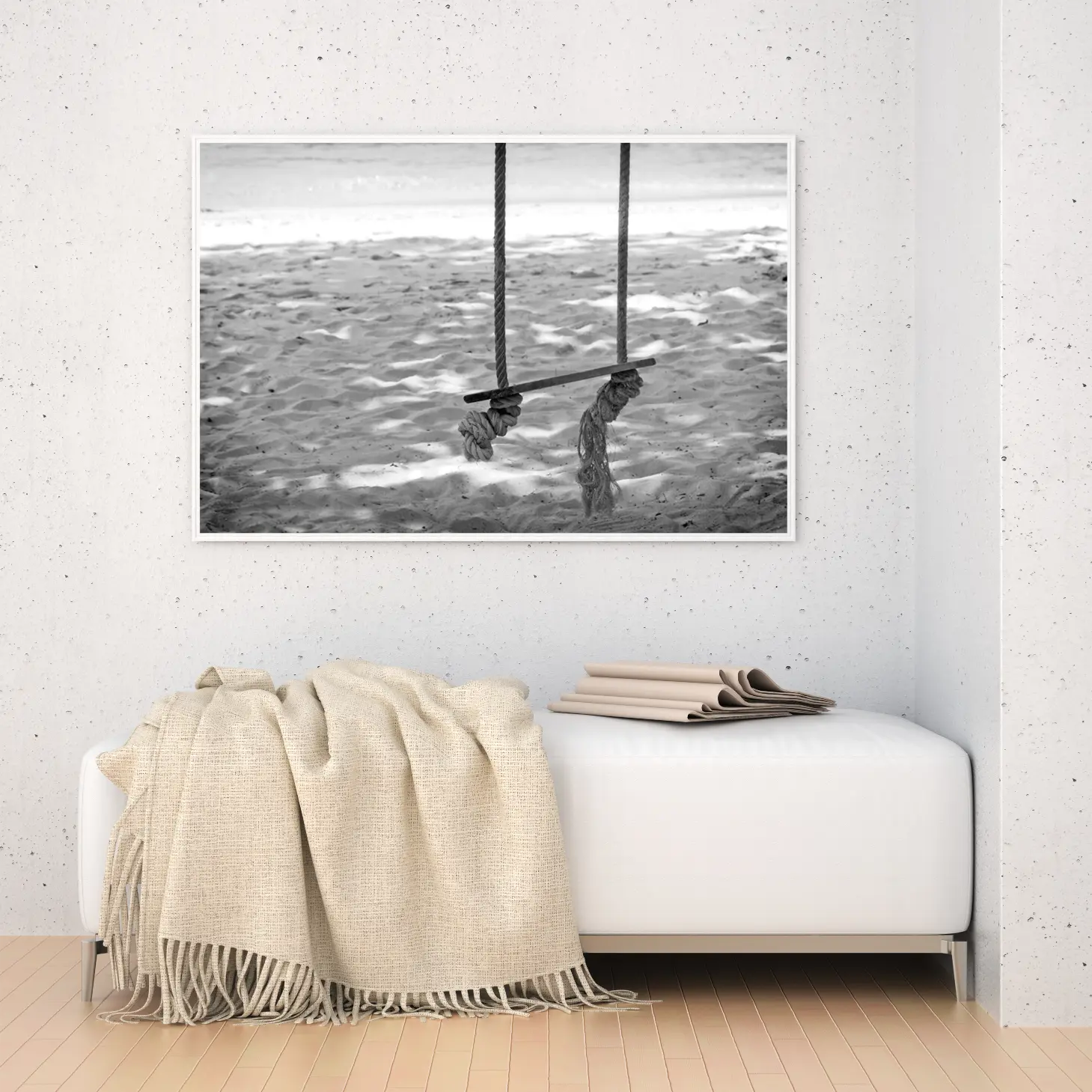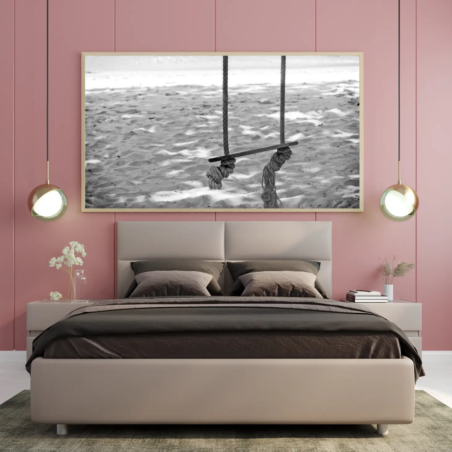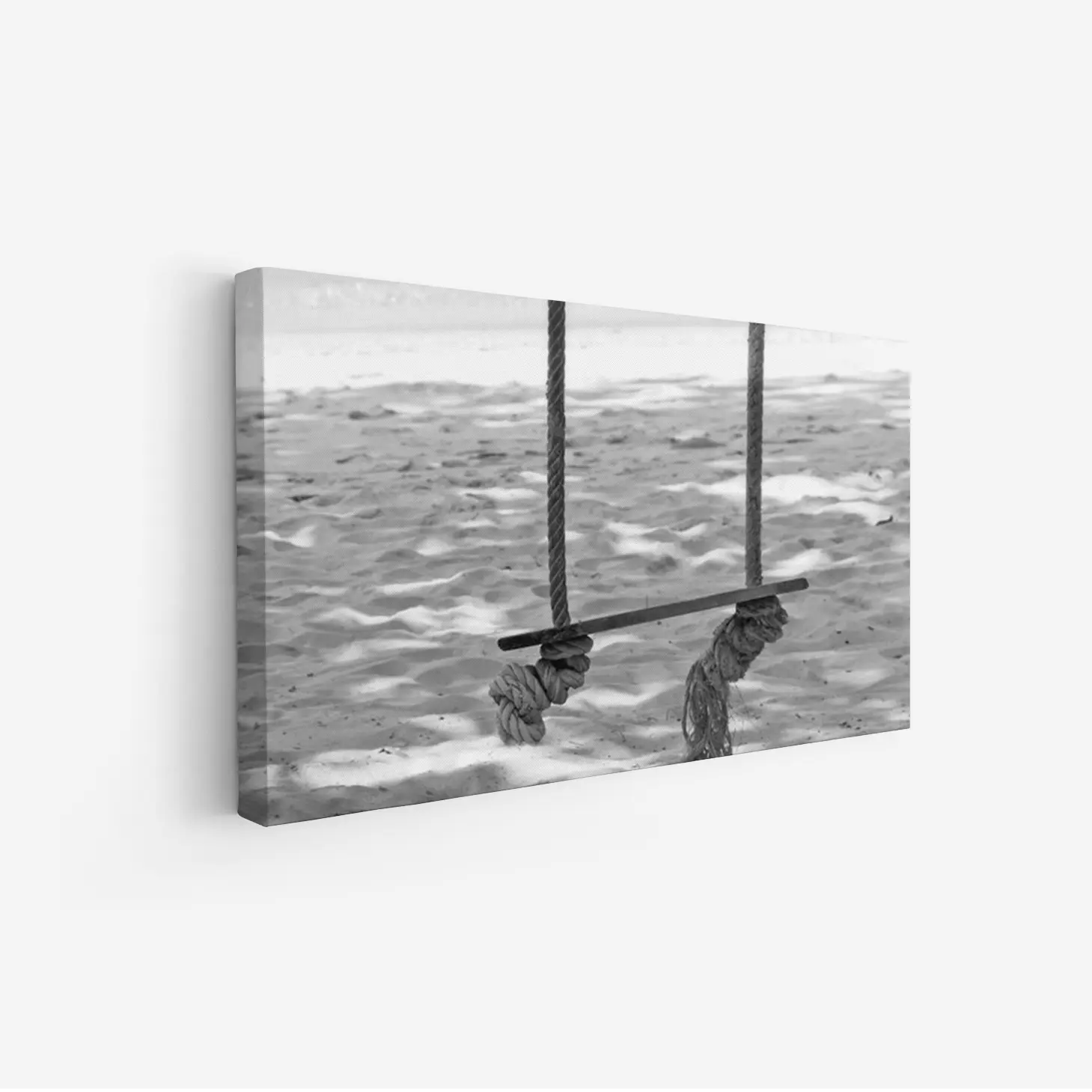 تجسد هذه اللوحات كانفاس روح البساطة والجمال الطبيعي، حيث تلتقي عناصر الطبيعة مع لمسة من الحنين. يظهر في العمل مشهد ساحر لكرسي معلق، يتدلى من حبال متينة، مما يضفي إحساسًا بالاسترخاء والهدوء. الرمال الناعمة التي تحت الكرسي تعكس ضوء الشمس بطريقة تخلق تباينًا جميلًا بين الألوان، مما يجعل المشهد ينبض بالحياة رغم استخدام الألوان الأحادية.