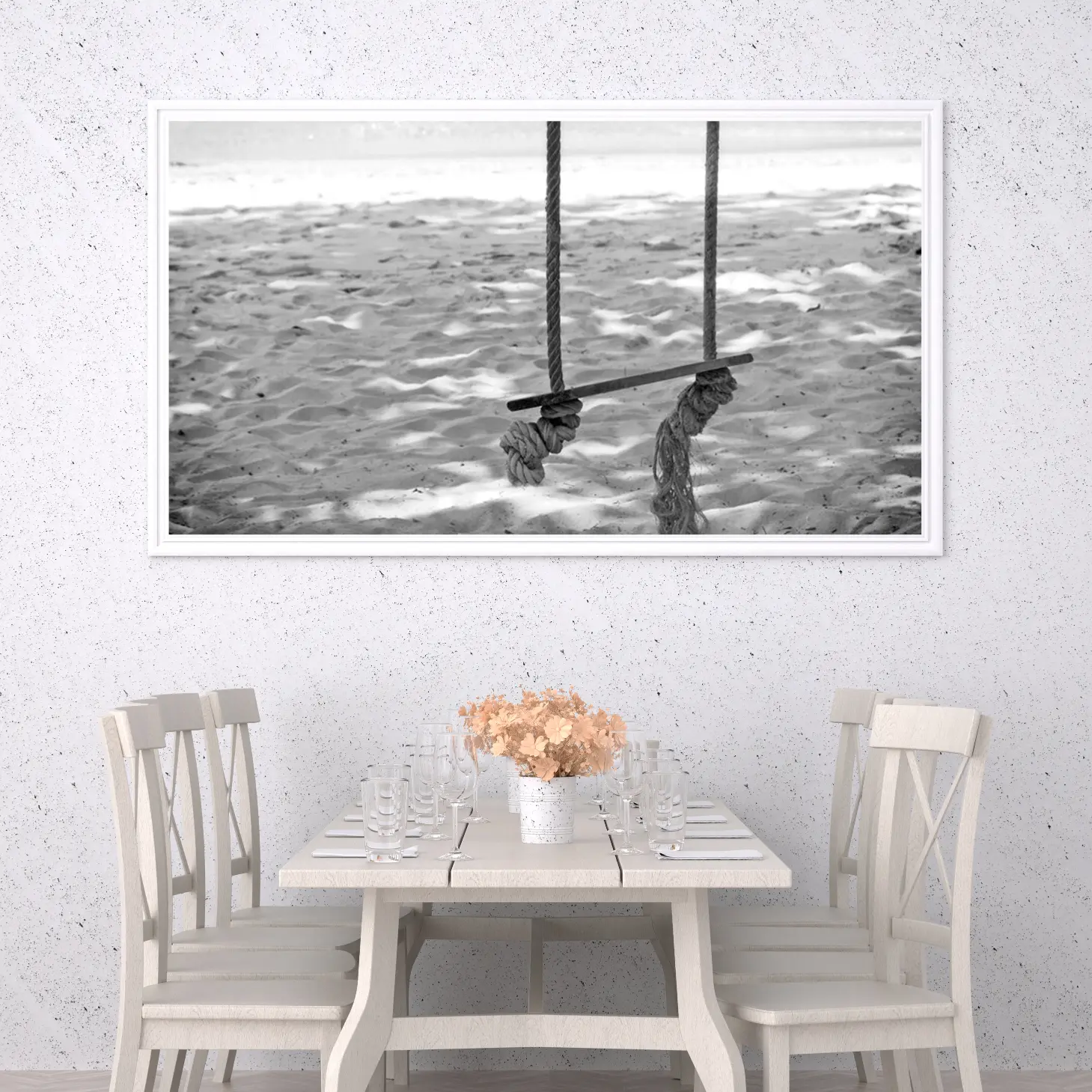 لوحات فن عصري لكرسي معلق على الشاطئ بلونين رمادي وأبيض، جو هادئ ومريح. لوحات جدارية للمنزل، لوحات فخمة، لوحات أنيقة.