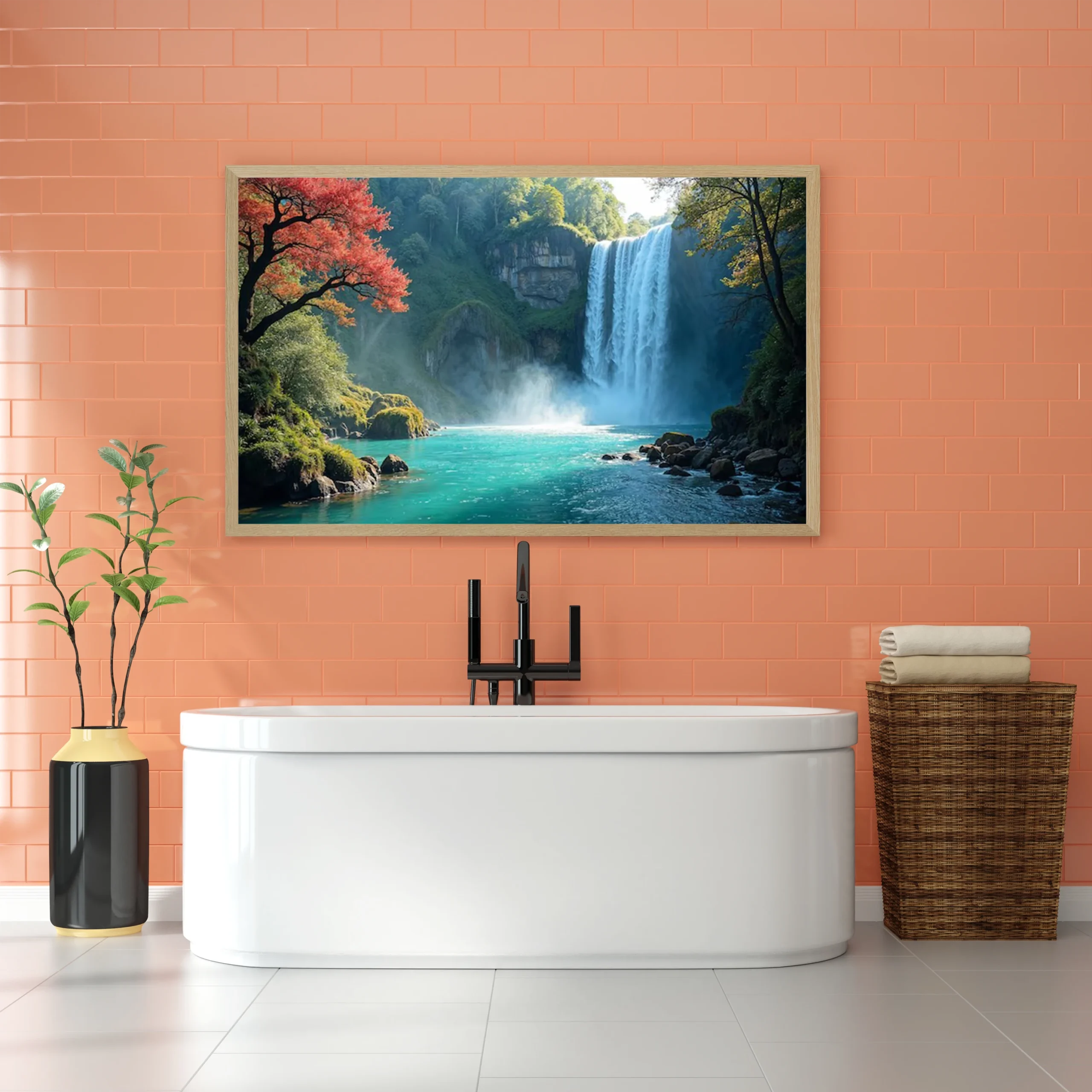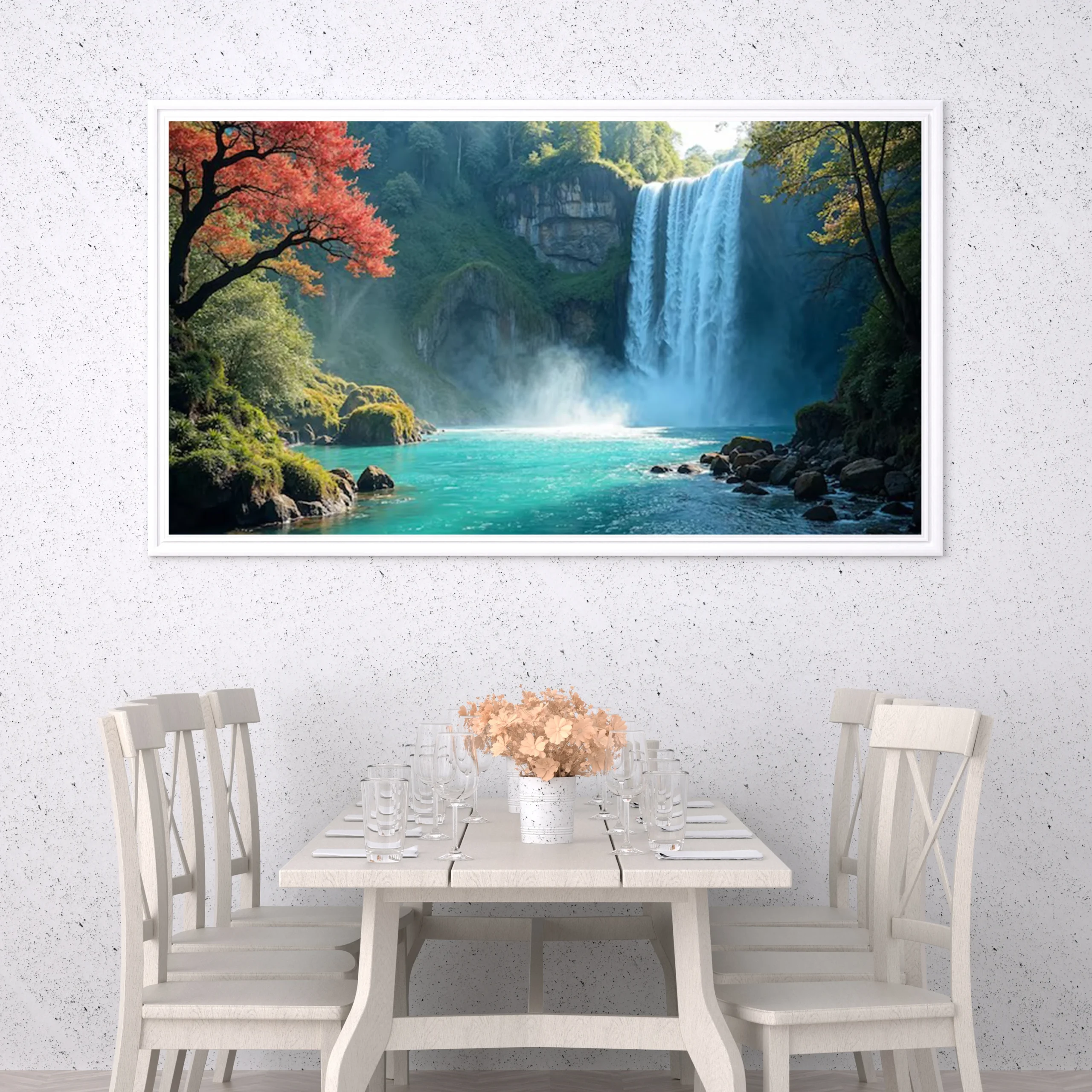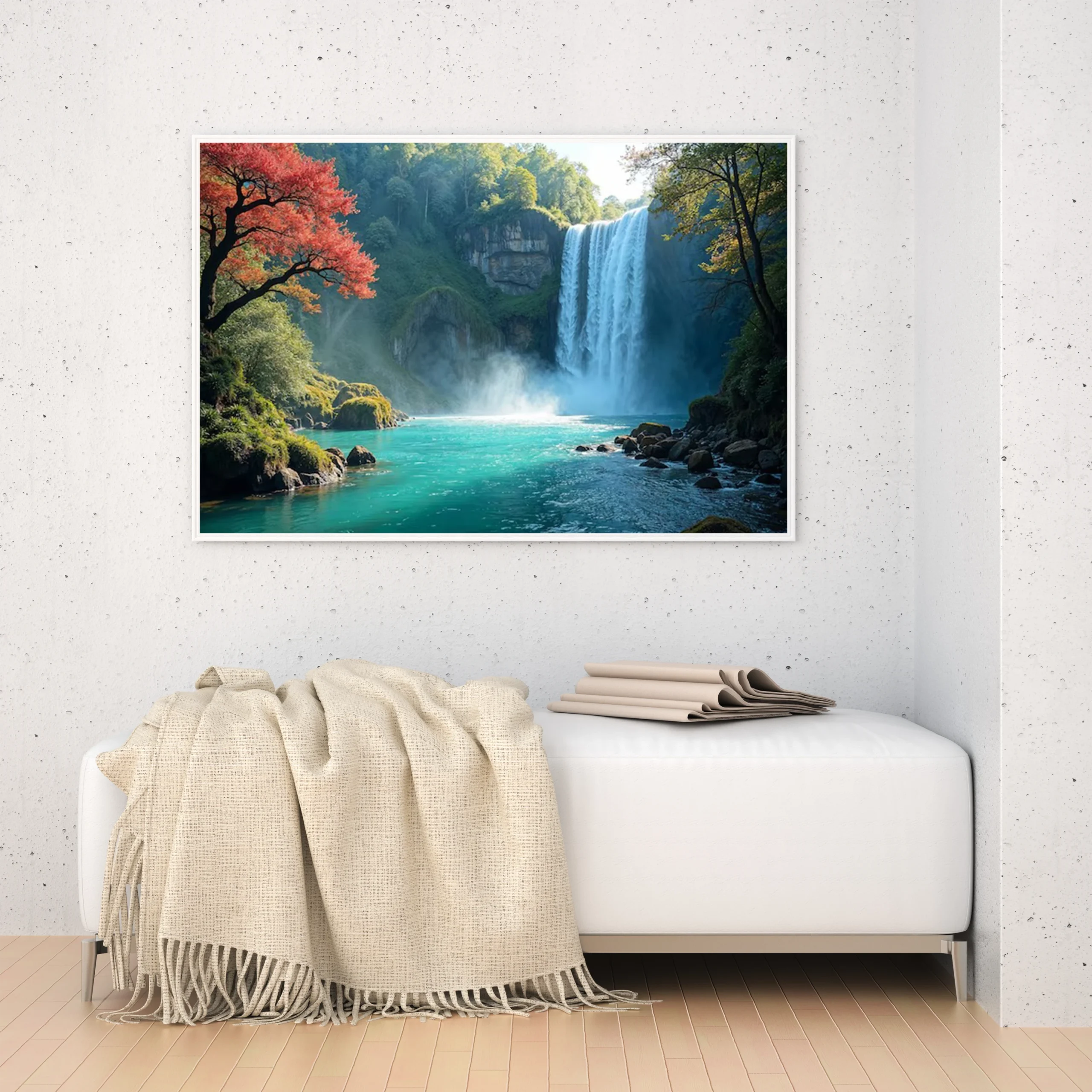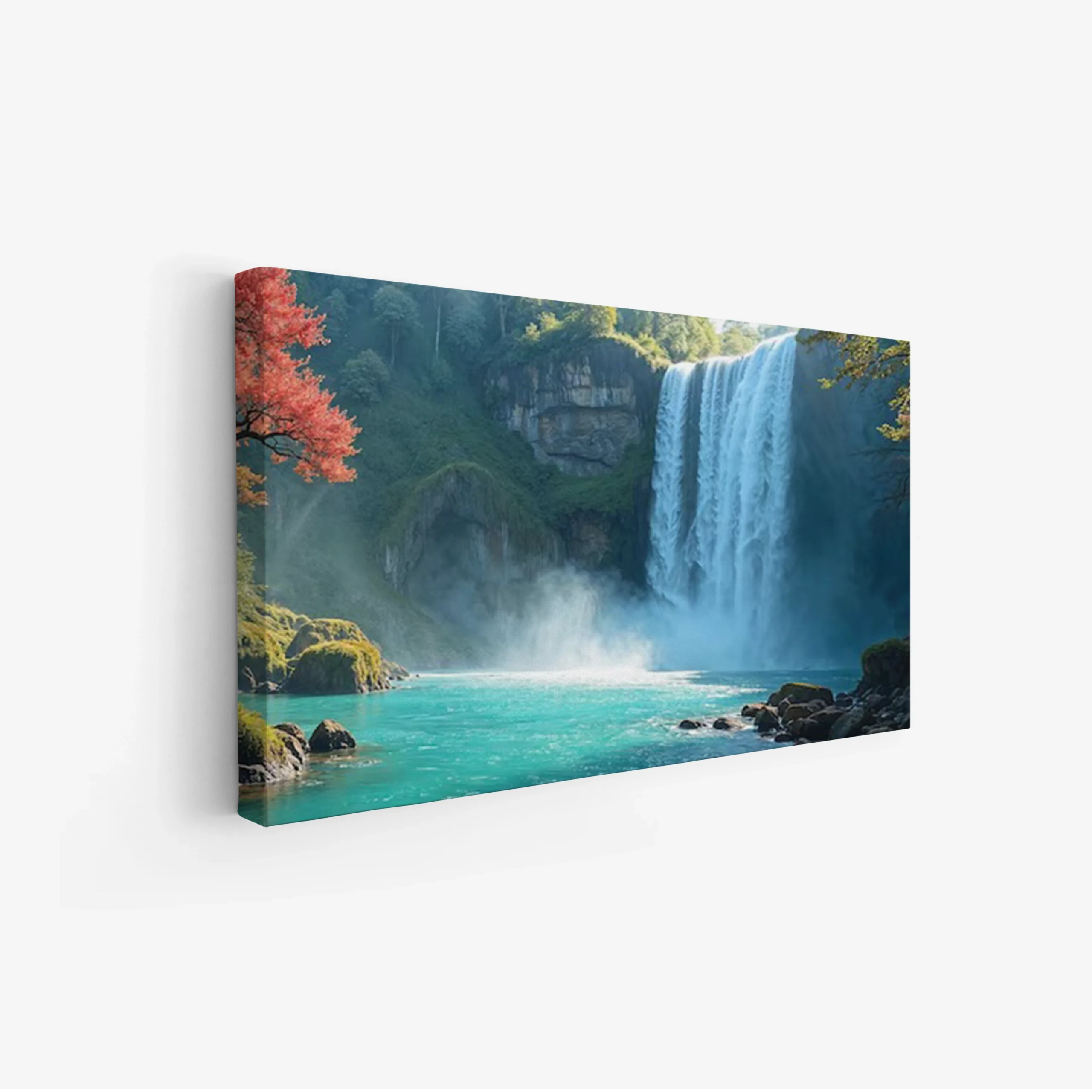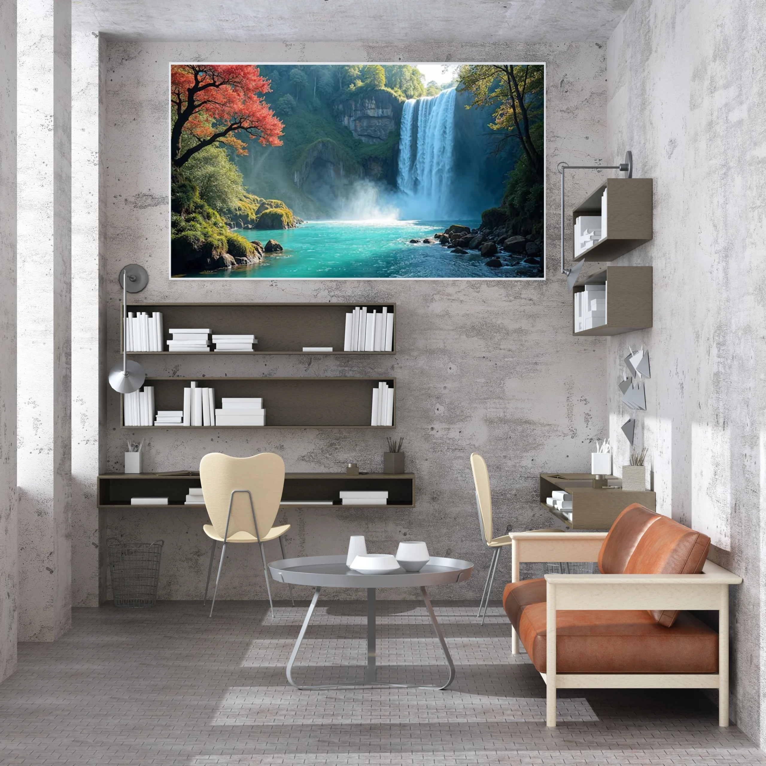 استمتع بجمال الطبيعة الخلابة مع هذه اللوحة الفنية التي تجسد شلالات مهيبة تتدفق برشاقة فوق مياه زرقاء صافية. تضفي الألوان الزاهية للأشجار المحيطة لمسة من السحر والهدوء، مما يجعلها إضافة مثالية لأي مساحة تبحث عن لمسة من الإلهام والجمال.