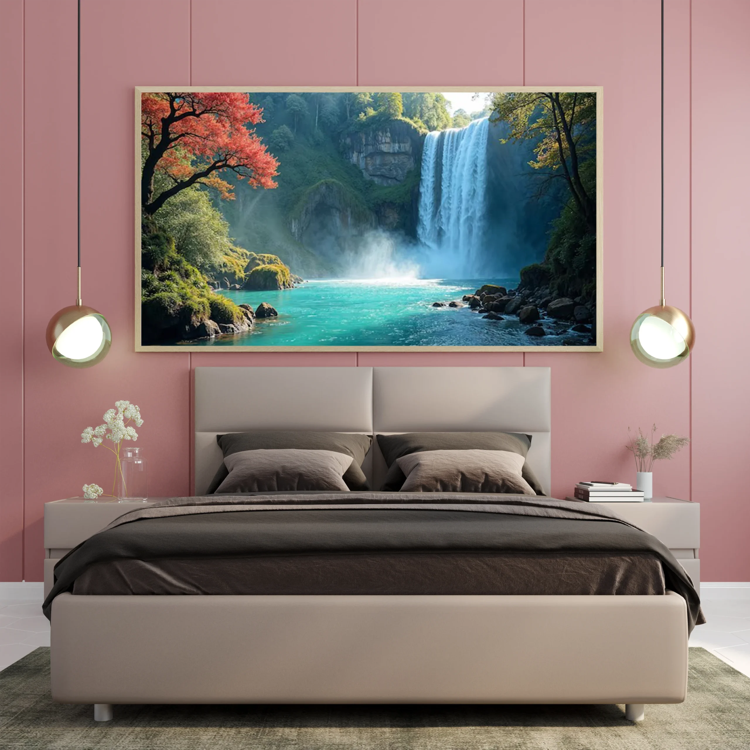 لوحات مناظر طبيعية تتضمن شلالات مائية وزرقة البحر مع أشجار حمراء، جو هادئ ومريح. لوحات فنية عصرية، لوحات جدارية للمنزل، لوحات أنيقة.