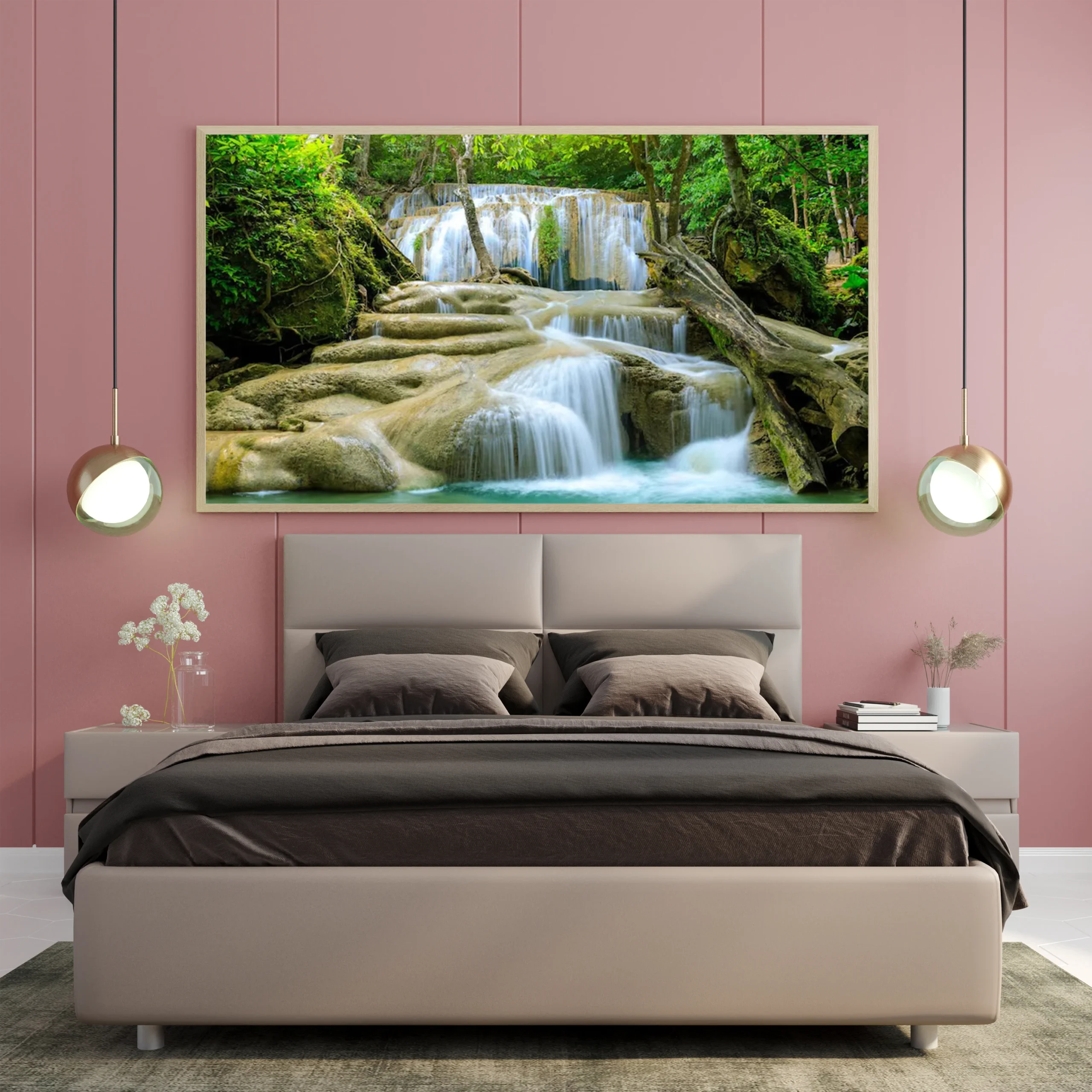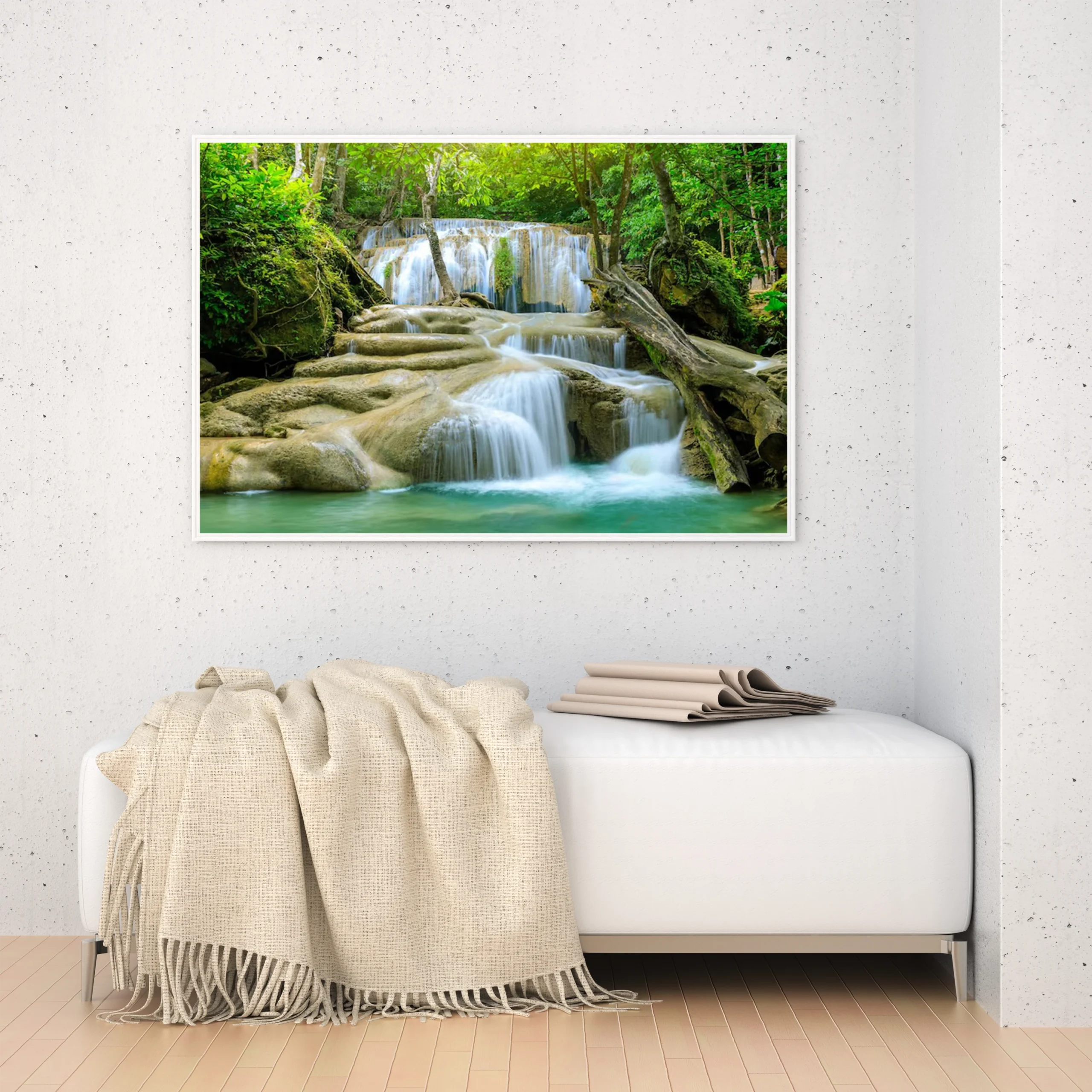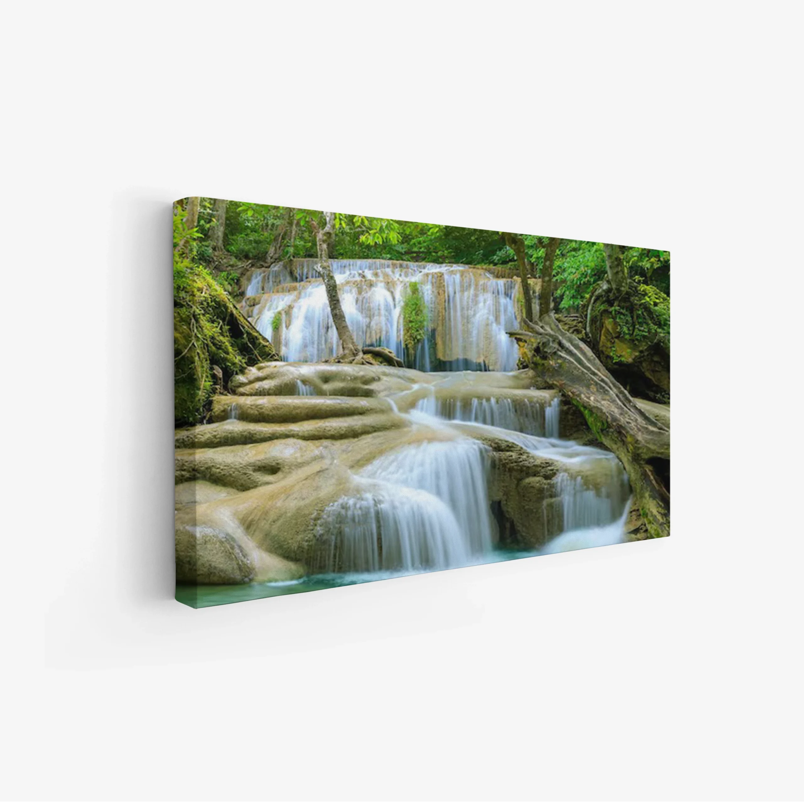 استمتع بجمال الطبيعة الخلابة مع هذه اللوحة التي تجسد شلالات المياه المتدفقة بين الصخور الملساء والأشجار الوارفة. تضفي الألوان الزاهية والهدوء المنبعث من المشهد لمسة من السكينة على أي مساحة، مما يجعلها خيارًا مثاليًا لإثراء ديكور منزلك.