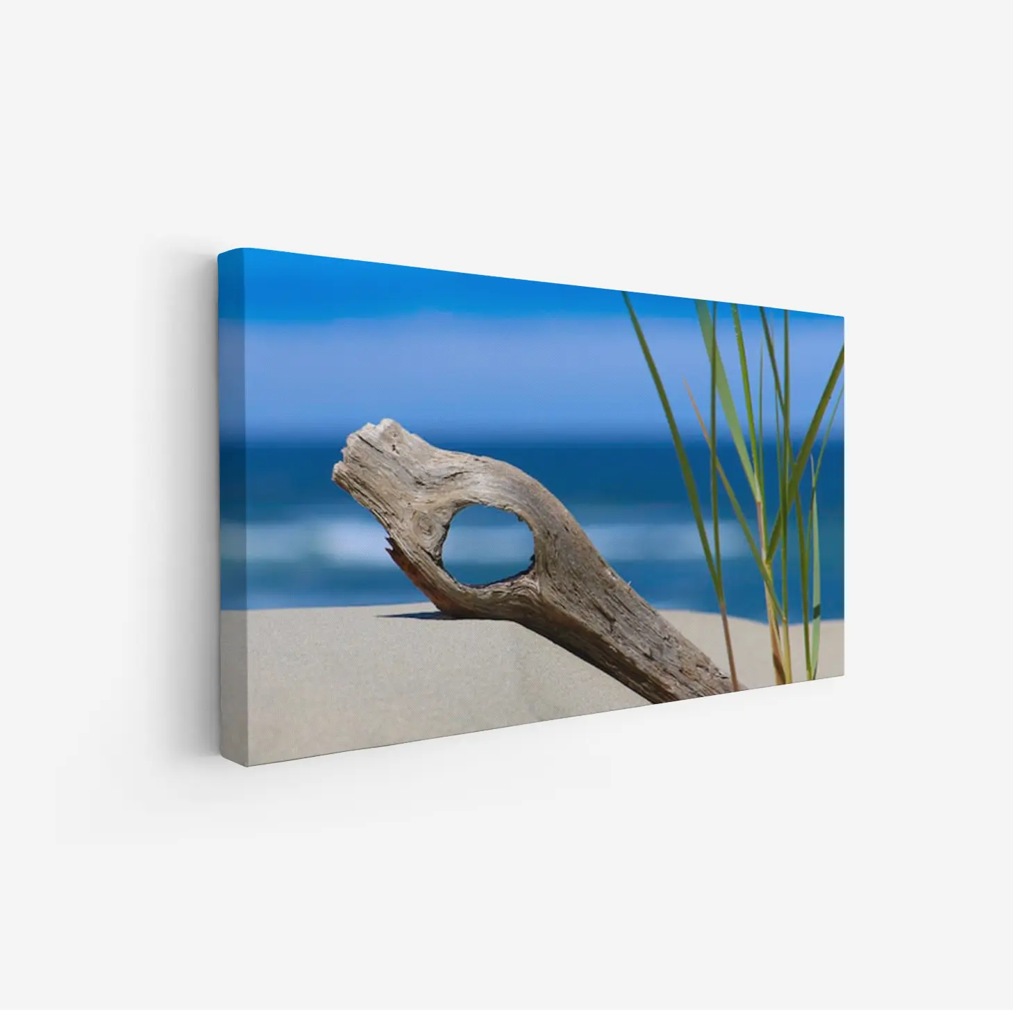 لوحات مناظر طبيعية تجسد خشبة جافة على شاطئ رملي مع خلفية بحر زرقاء، أجواء هادئة ومريحة. لوحات فنية عصرية، لوحات جدارية للمنزل، لوحات أنيقة.