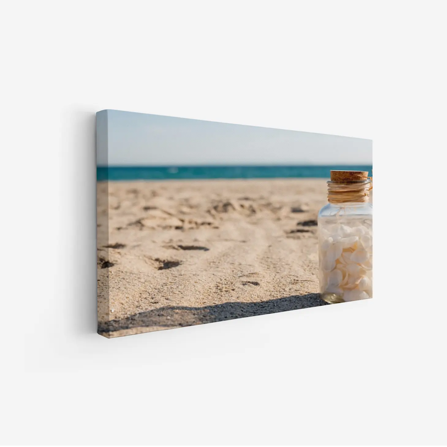 استمتع بجمال الطبيعة مع هذه اللوحة الفنية التي تلتقط لحظة هادئة على الشاطئ، حيث تتناغم الرمال الذهبية مع مياه البحر الزرقاء. زجاجة مليئة بالأصداف تضيف لمسة من السحر والذكريات، مما يجعلها خيارًا مثاليًا لإضفاء لمسة من الأناقة على أي مساحة.
