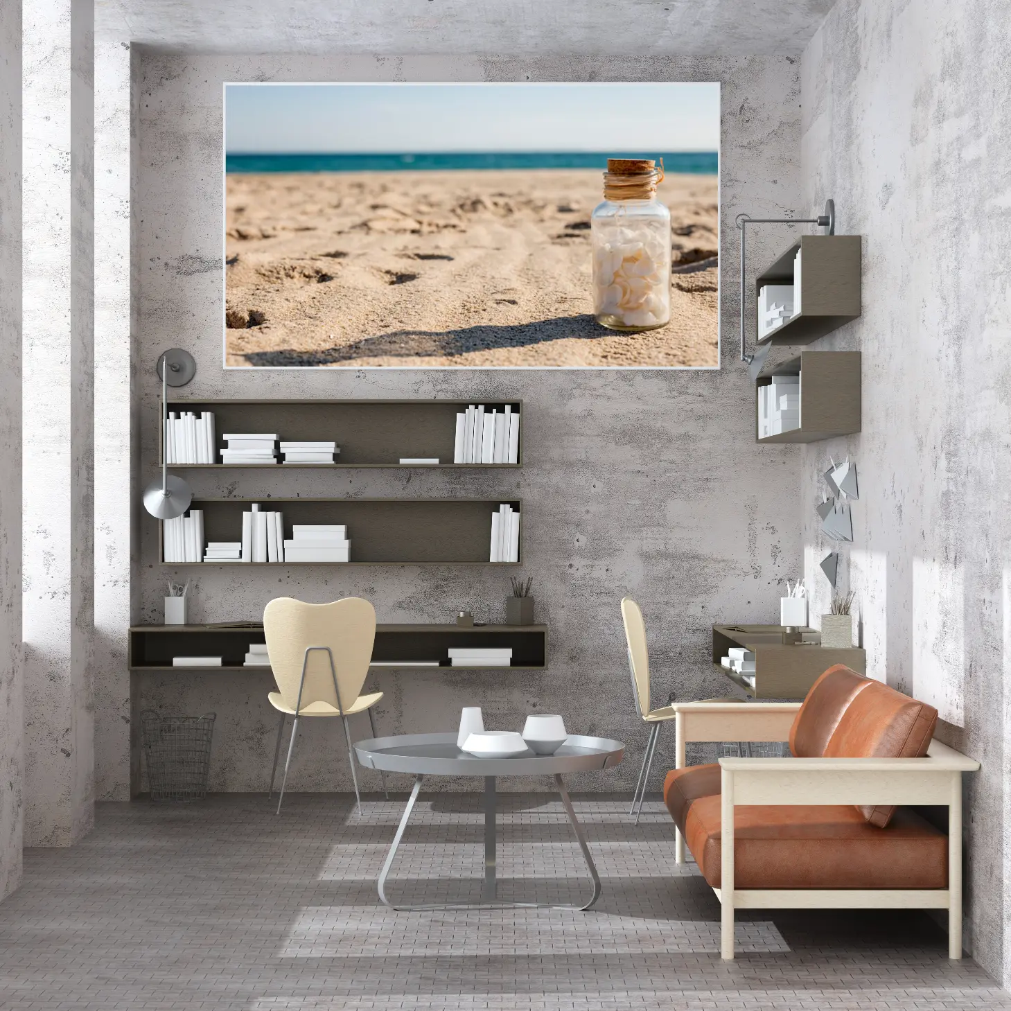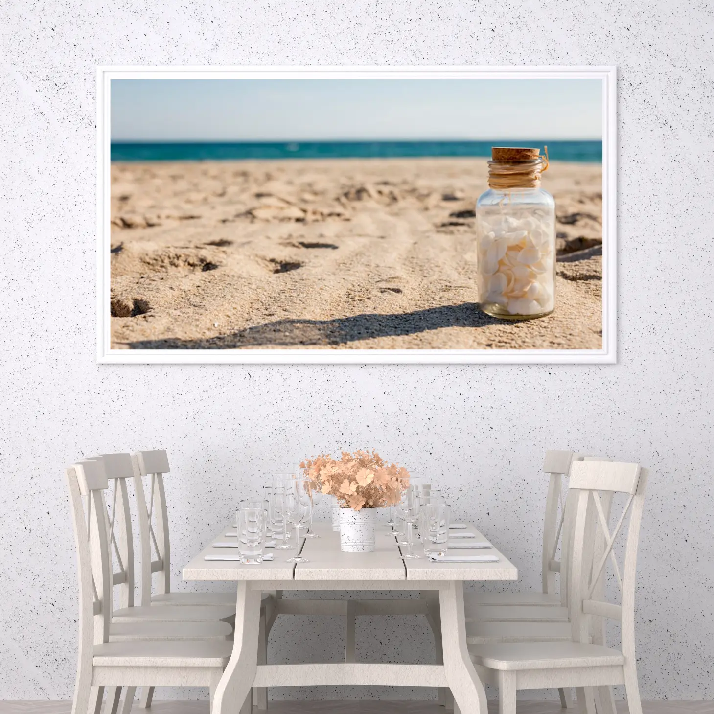 تتوسط اللوحة زجاجة شفافة تحتوي على قواقع بحرية، مما يضفي لمسة من السحر والغموض. هذه العناصر الطبيعية تعكس روح البحر وتعيد إلى الأذهان ذكريات العطلات الصيفية، مما يجعلها مثالية كديكور جداري في المنازل أو المكاتب. إن وجود هذه الزجاجة يضيف بعدًا فنيًا، حيث يمكن اعتبارها رمزًا للذكريات الثمينة التي نحتفظ بها من رحلاتنا.