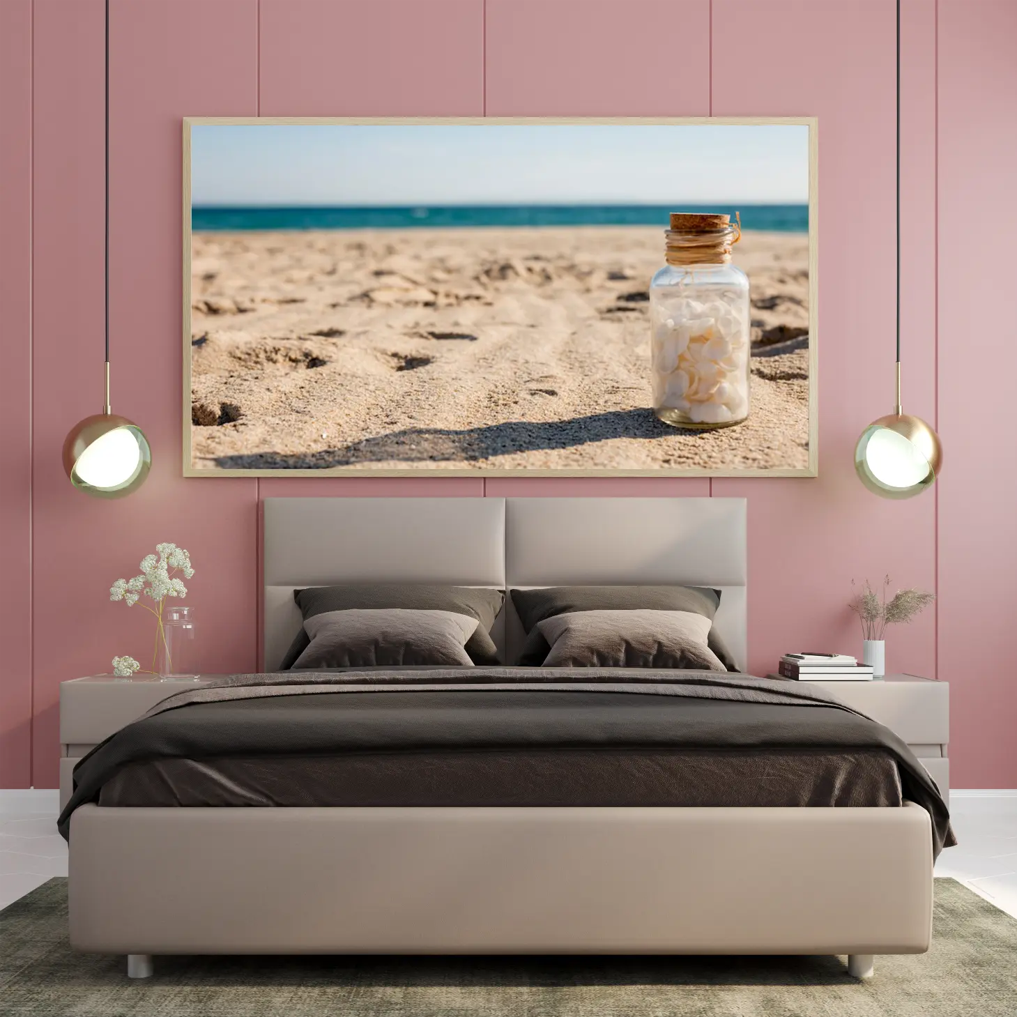 لوحات مناظر طبيعية تحتوي على رمال شاطئية وزجاجة مليئة بالأصداف، بألوان دافئة وجو هادئ. لوحات مودرن، لوحات فنية عصرية، لوحات جدارية للمنزل.