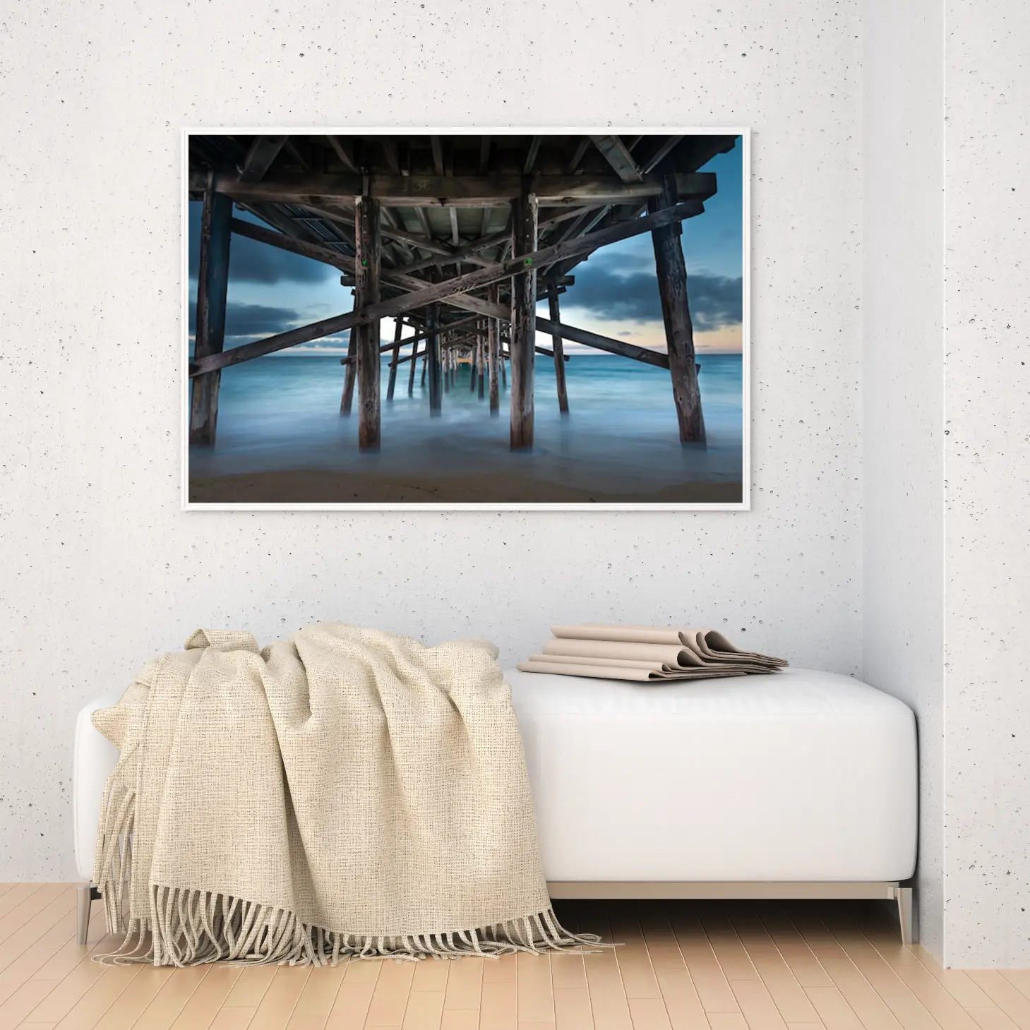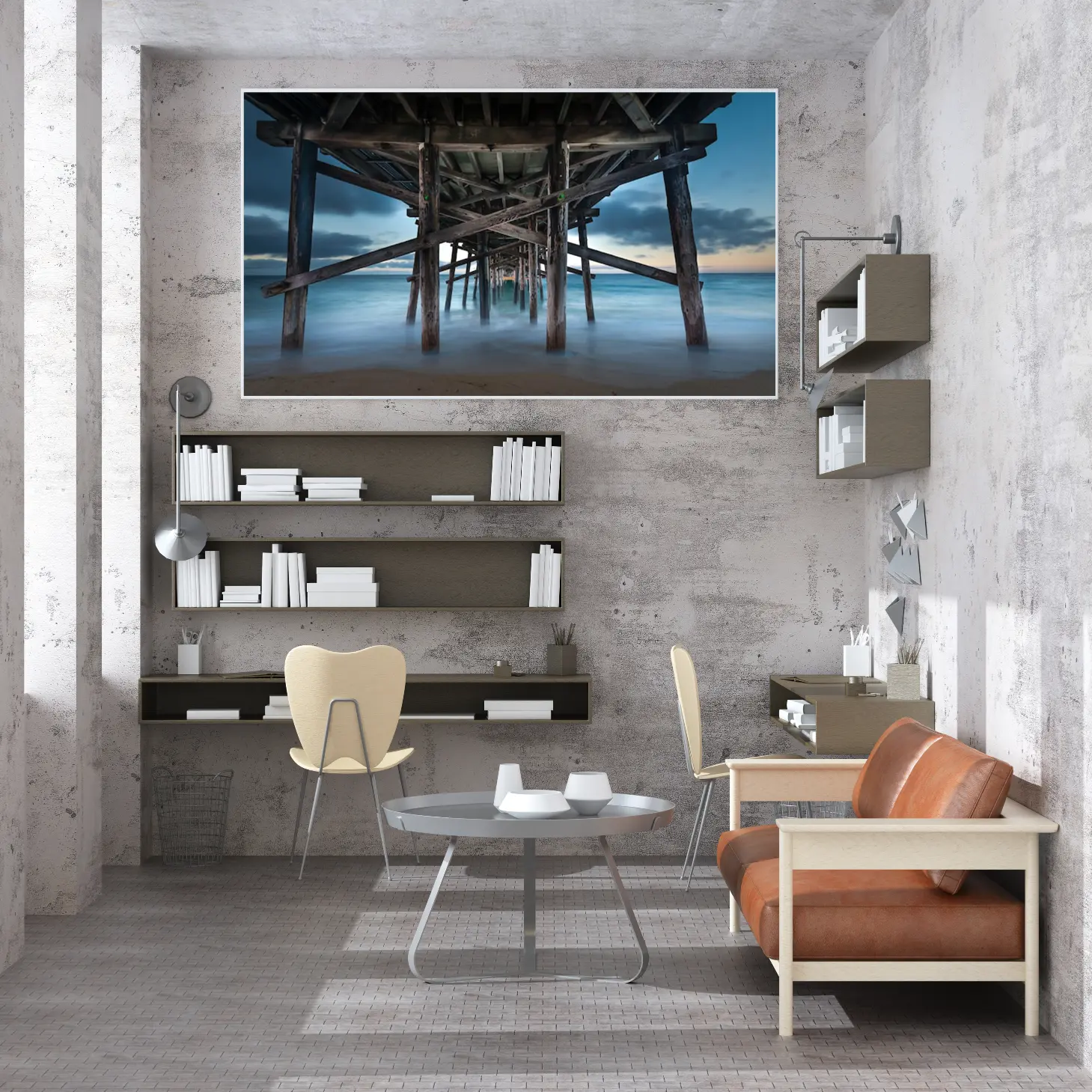 لوحات مناظر طبيعية تحت جسر خشبي يطل على بحر هادئ، ألوان زرقاء ورمادية، جو مريح. لوحات فنية عصرية، لوحات جدارية للمنزل، لوحات أنيقة.