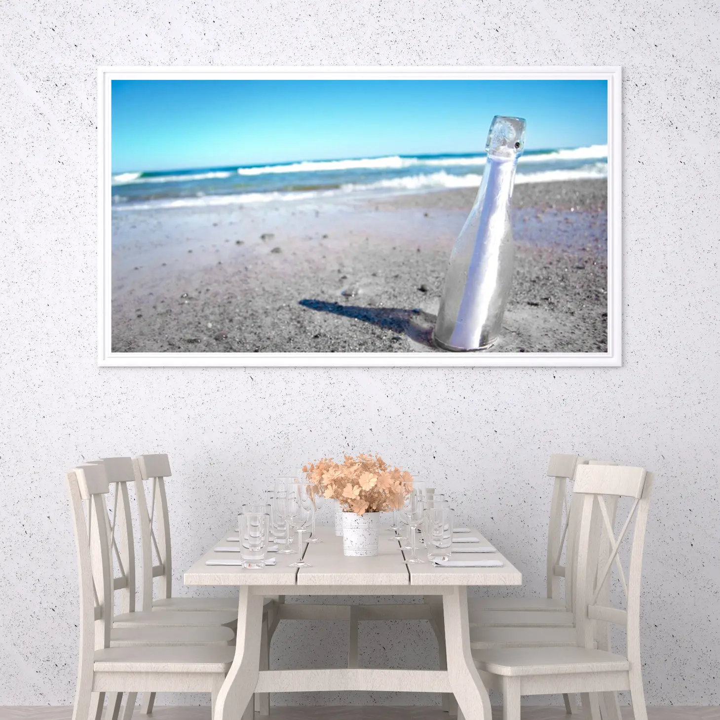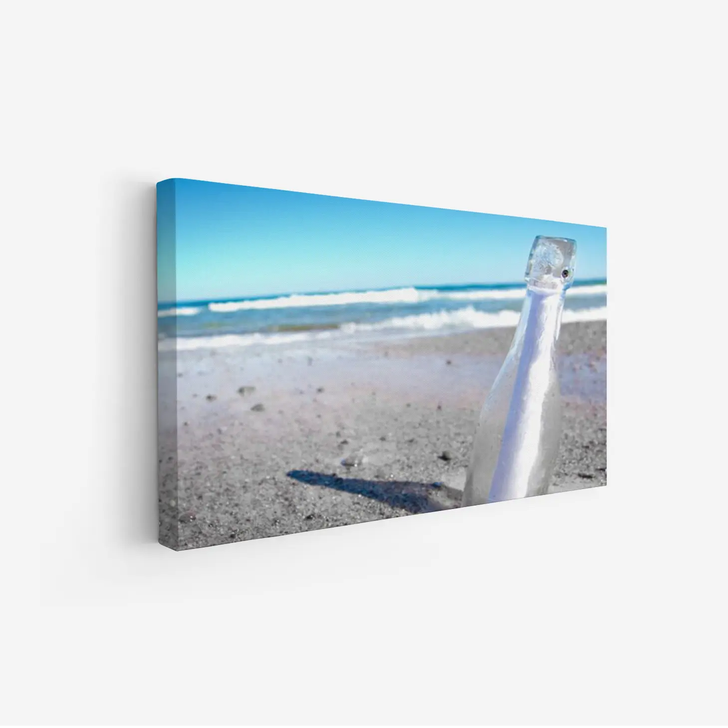 استمتع بجمال الطبيعة مع هذه اللوحة الفنية التي تلتقط لحظة ساحرة على شاطئ البحر. زجاجة شفافة تتلألأ تحت أشعة الشمس، محاطة برمال ناعمة ومياه زرقاء، تعكس روح المغامرة والهدوء. أضف لمسة من السحر إلى مساحتك مع هذه التحفة الفنية الفريدة.