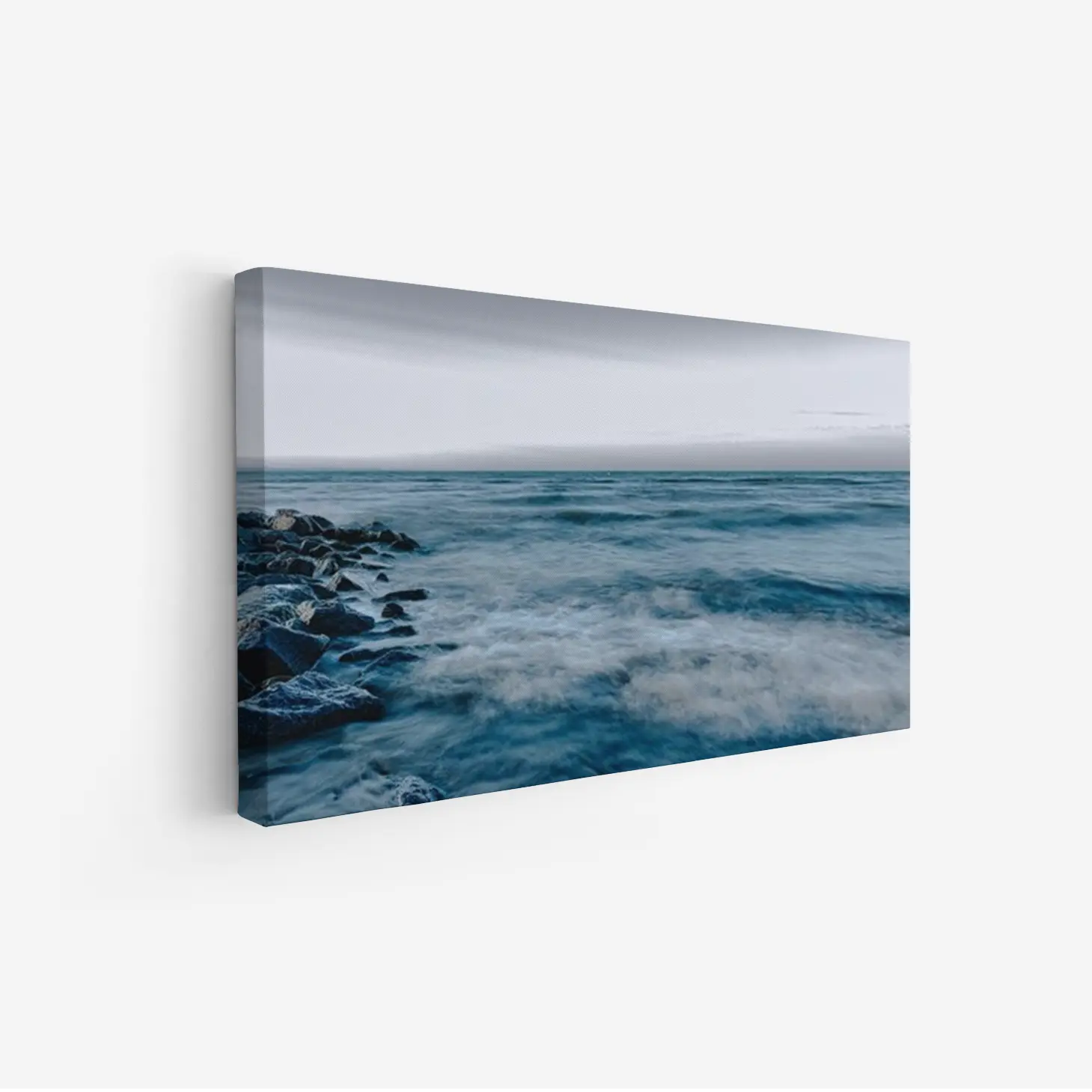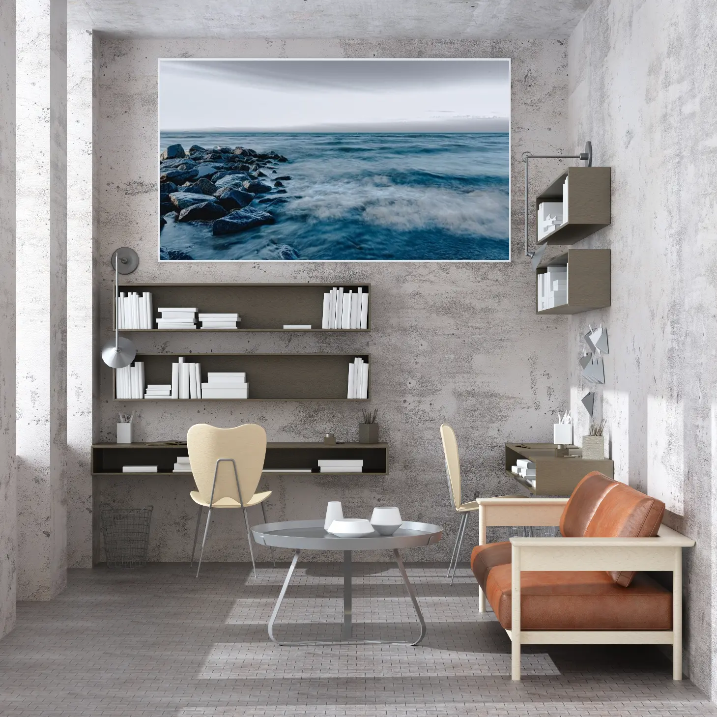استمتع بجمال البحر الهادئ مع هذه اللوحة الفنية التي تجسد تناغم الألوان الزرقاء. تعكس الأمواج المتلاطمة على الصخور إحساسًا بالسكينة والهدوء، مما يجعلها إضافة مثالية لأي مساحة تبحث عن لمسة من الأناقة والراحة.