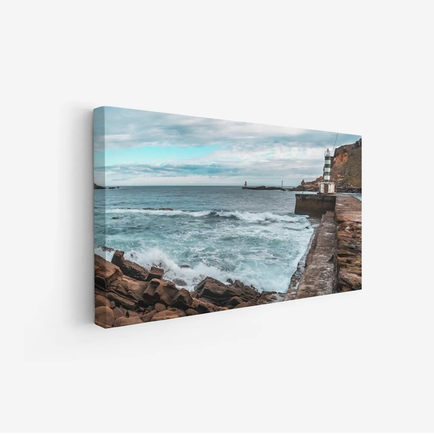 لوحات مناظر طبيعية تعكس أمواج البحر الزرقاء وصخور الشاطئ تحت سماء غائمة، لوحات فخمة، لوحات جدارية للمنزل.
