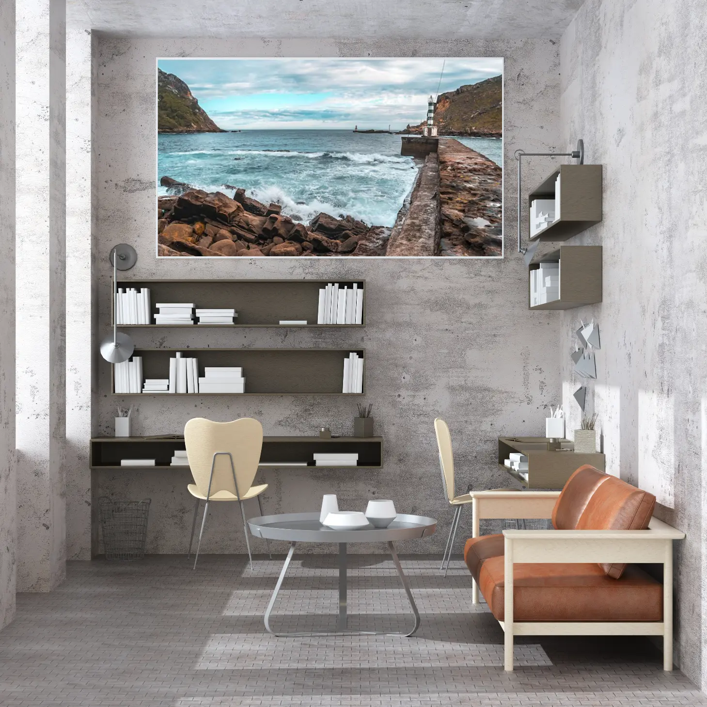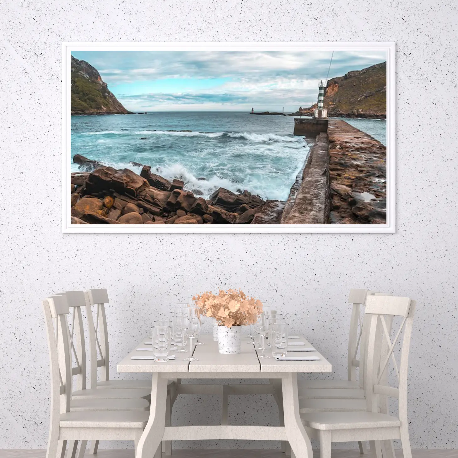 تجسد هذه اللوحات الفنية جمال الطبيعة البحرية بأسلوب عصري يجذب الأنظار ويضفي لمسة من السحر على أي مساحة داخلية. تتناغم الألوان الزرقاء الهادئة مع تدرجات السماء الرمادية، مما يخلق توازنًا بصريًا يبعث على الاسترخاء والسكينة. إن تداخل الأمواج المتلاطمة مع الصخور يضيف بعدًا ديناميكيًا، مما يجعل المشاهد يشعر وكأنه جزء من هذه اللحظة الخلابة.