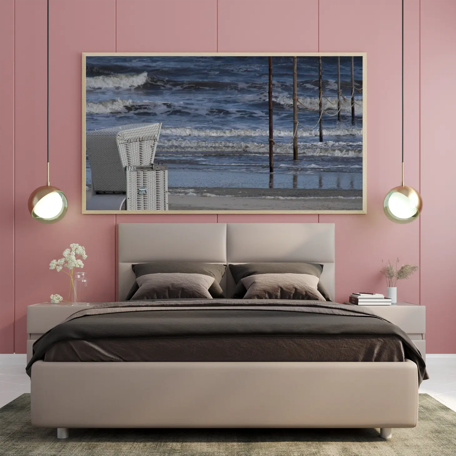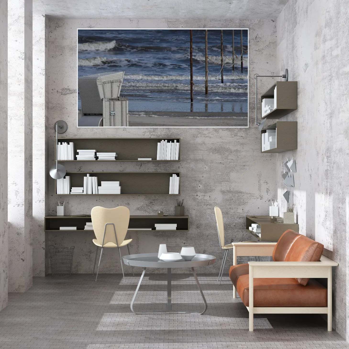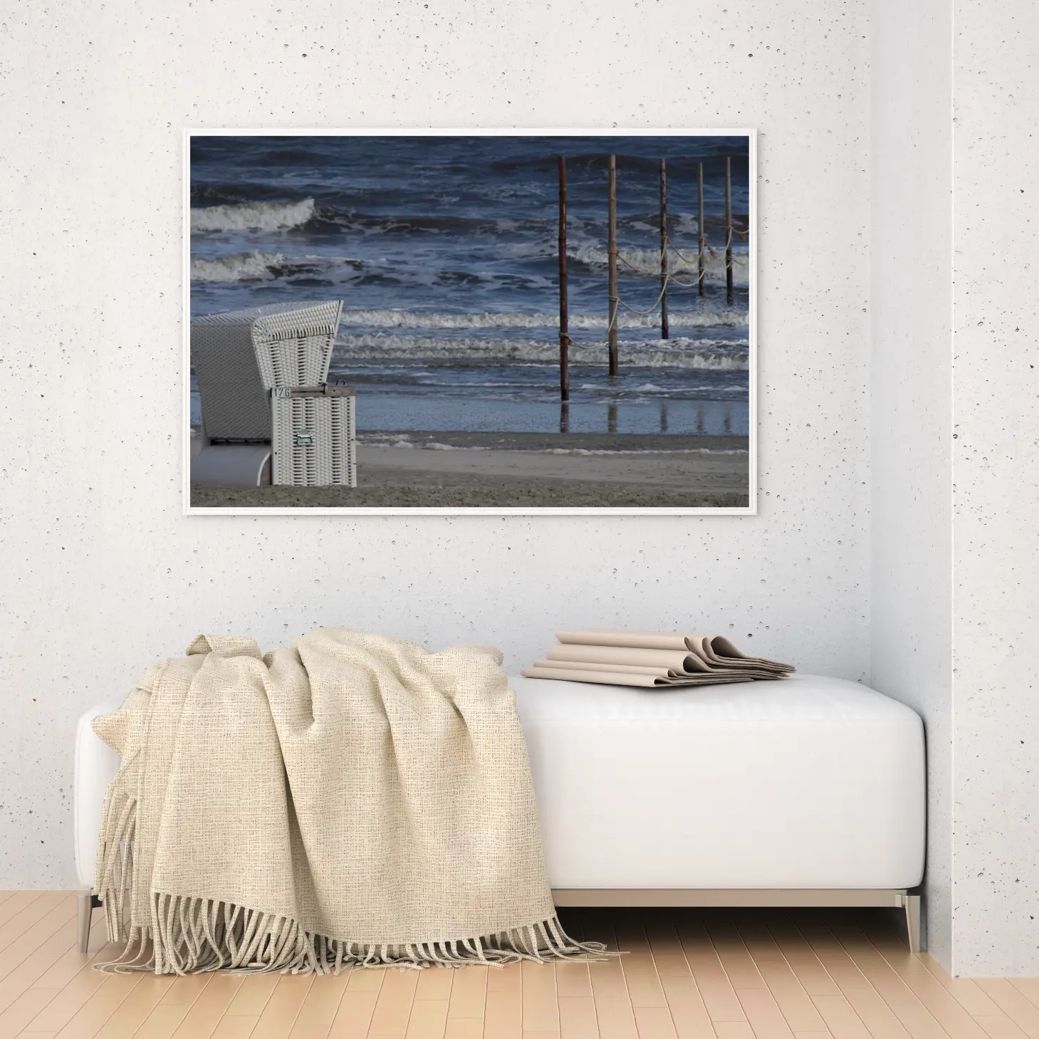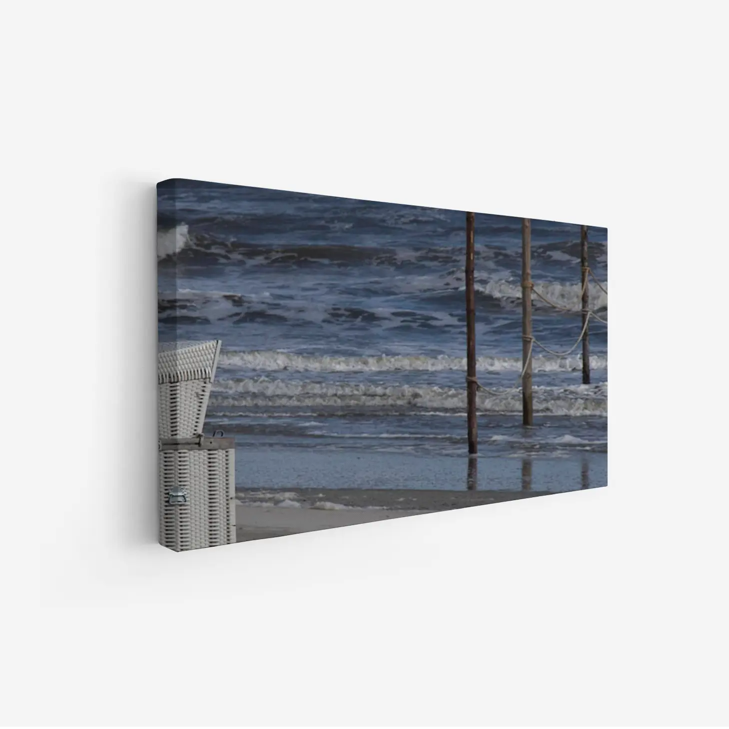 تتجلى في هذه اللوحات كانفاس جماليات الطبيعة البحرية، حيث تتناغم الأمواج المتلاطمة مع أعمدة خشبية تعكس روح الشاطئ. يُظهر المشهد تباينًا رائعًا بين الألوان الزرقاء العميقة للمياه والرمادي الدافئ للرمال، مما يخلق إحساسًا بالهدوء والاسترخاء. هذه العناصر تجسد جمال البحر وتدعوك للغوص في عمق التجربة الحسية التي يقدمها.