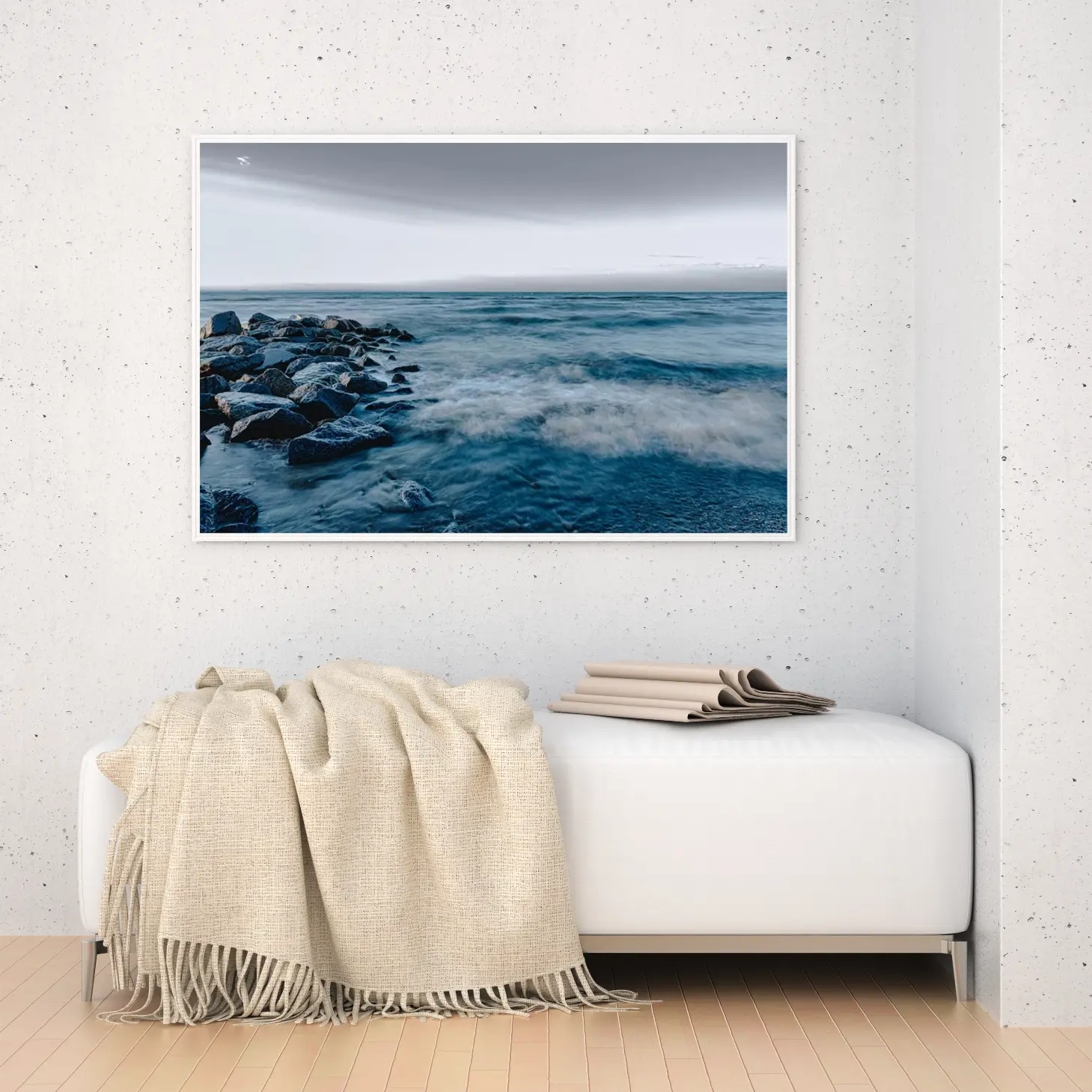 لوحات مناظر طبيعية تعكس أمواج البحر الزرقاء تحت سماء غائمة، جو هادئ ومريح. لوحات فخمة، لوحات جدارية للمنزل، لوحات أنيقة.