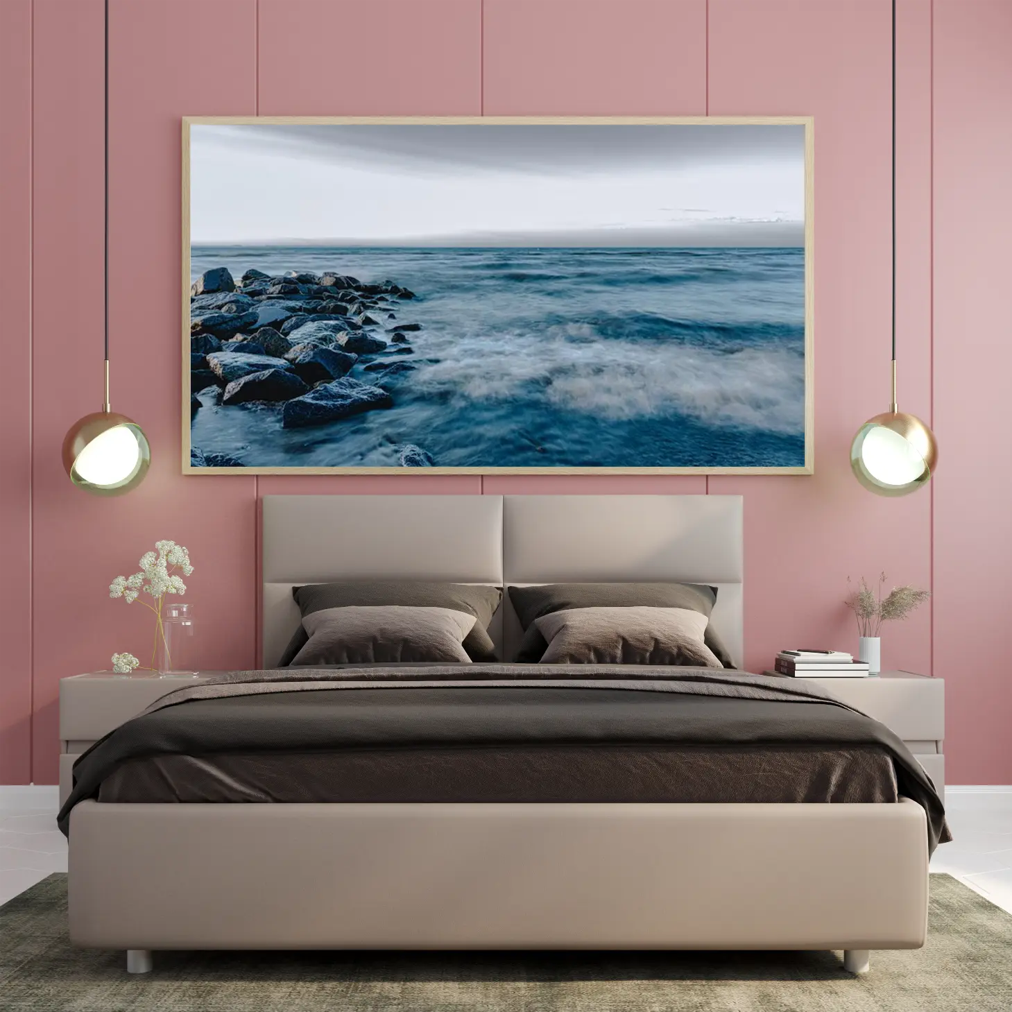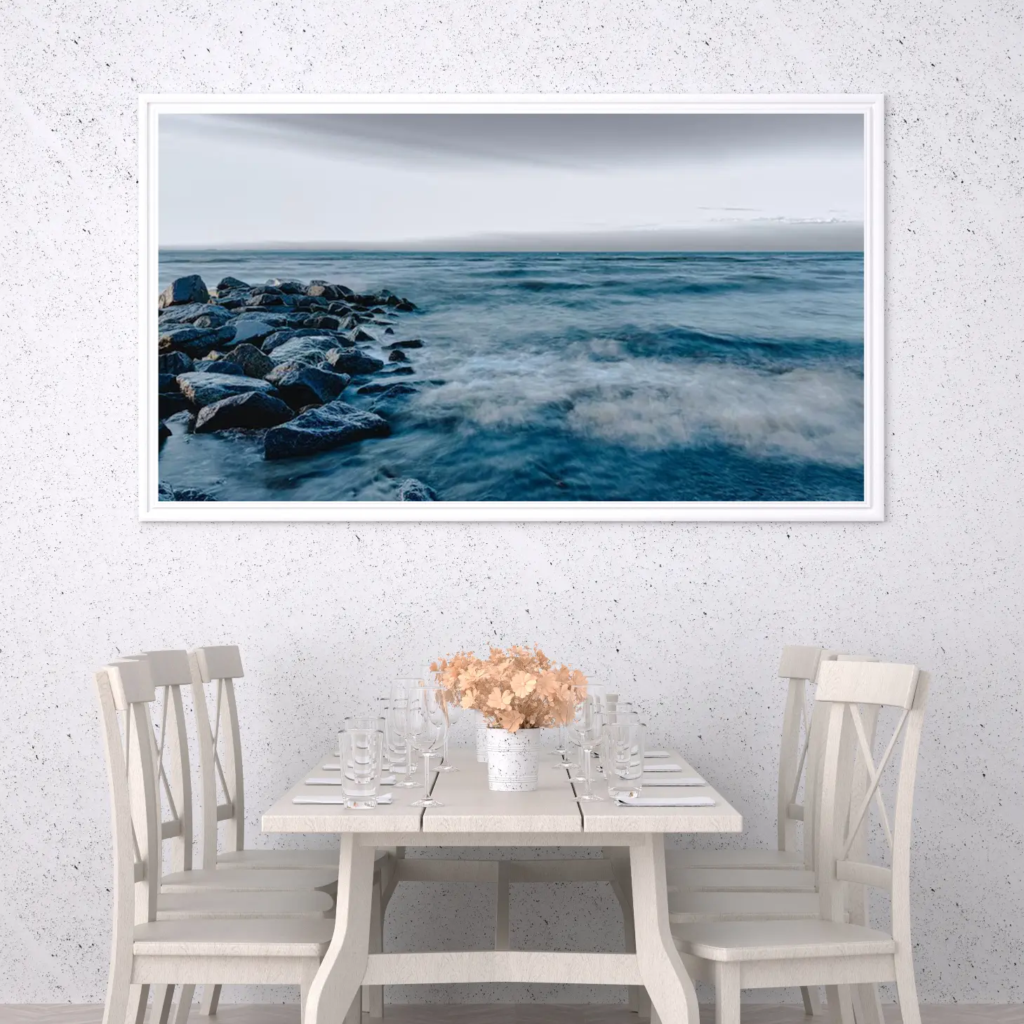 تساهم التفاصيل الدقيقة في الصخور والأمواج في إضافة عمق بصري، مما يجعل المشاهد يشعر وكأنه جزء من المشهد. هذا النوع من الديكور الجداري لا يقتصر فقط على الجمال، بل يعكس أيضًا ذوقًا رفيعًا واهتمامًا بالتفاصيل، مما يجعله خيارًا مثاليًا لمن يسعون لإضفاء لمسة فنية على منازلهم.