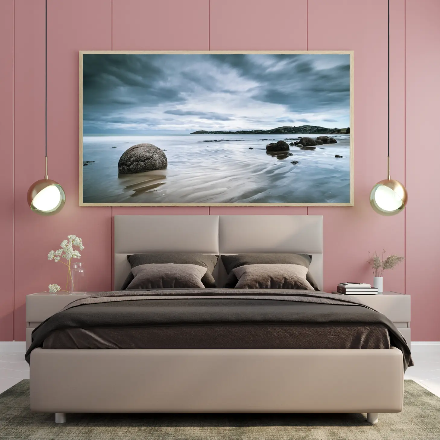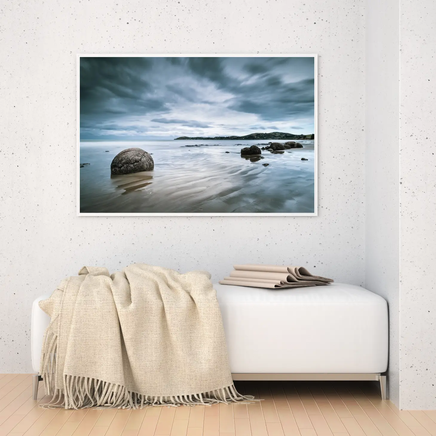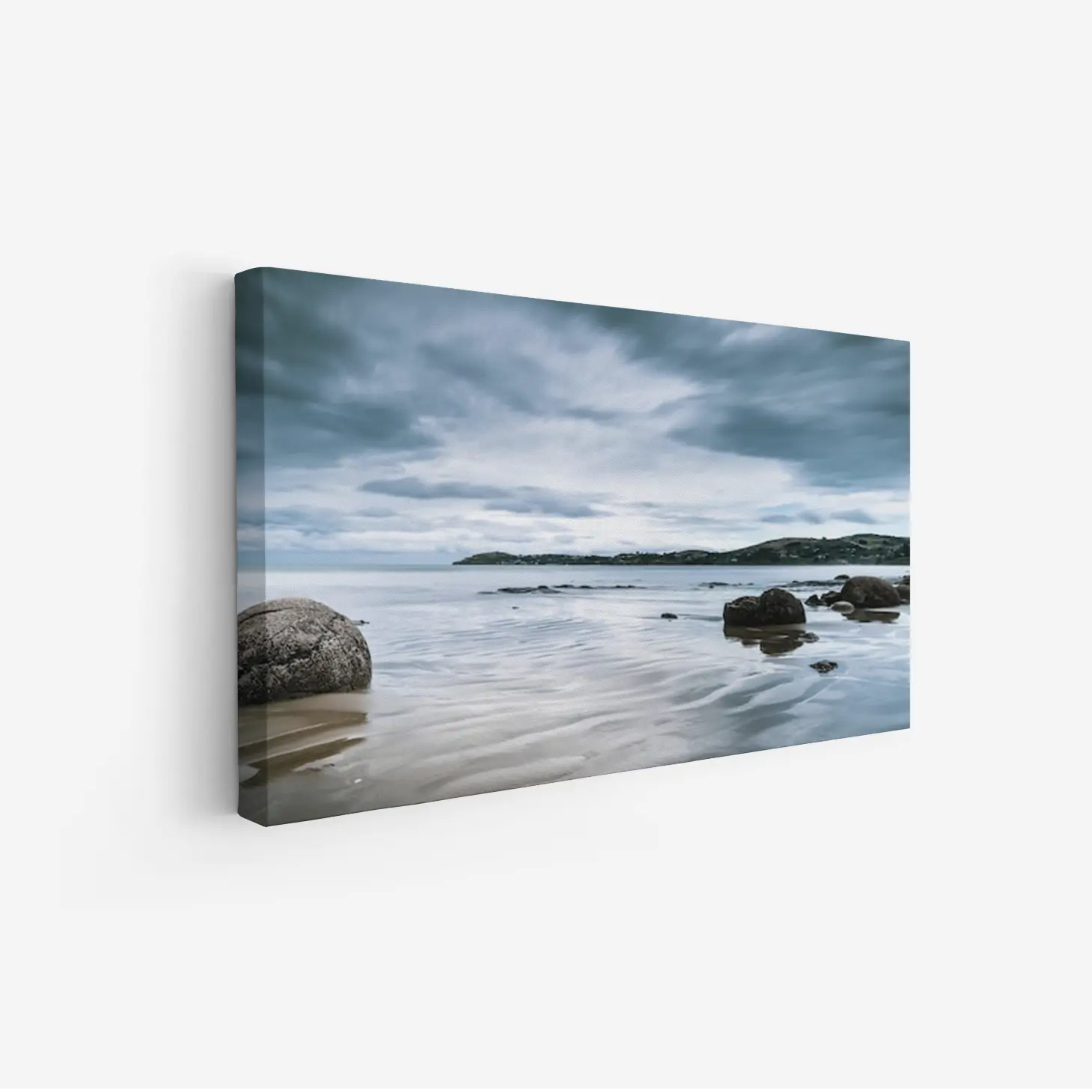 لوحات مناظر طبيعية تعكس سكون البحر تحت سماء غائمة، مع صخور تتناثر على الشاطئ. لوحات فخمة، لوحات جدارية للمنزل، لوحات أنيقة.