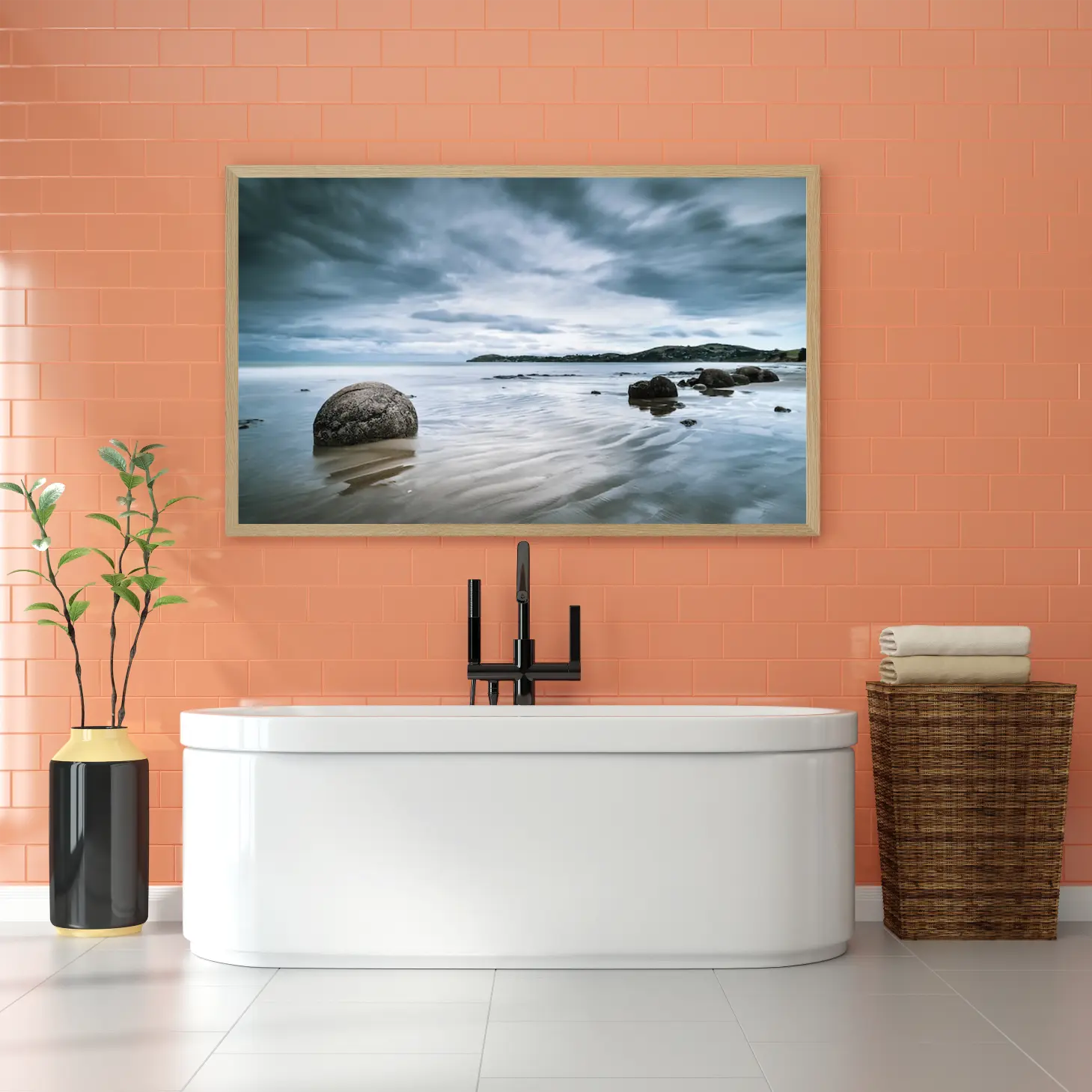 تجسد هذه اللوحات الفنية جمال الطبيعة الخلابة، حيث تتناغم الألوان الهادئة مع المشهد الساحلي الرائع. تعكس الأجواء الساكنة والسماء الملبدة بالغيوم إحساسًا بالهدوء والسكينة، مما يجعلها خيارًا مثاليًا لإضفاء لمسة من الصفاء على أي مساحة داخلية. إن التفاصيل الدقيقة للصخور الموزعة على الشاطئ تضيف عمقًا وثراءً بصريًا، مما يجعل المشاهد يشعر وكأنه جزء من هذا المشهد الطبيعي.