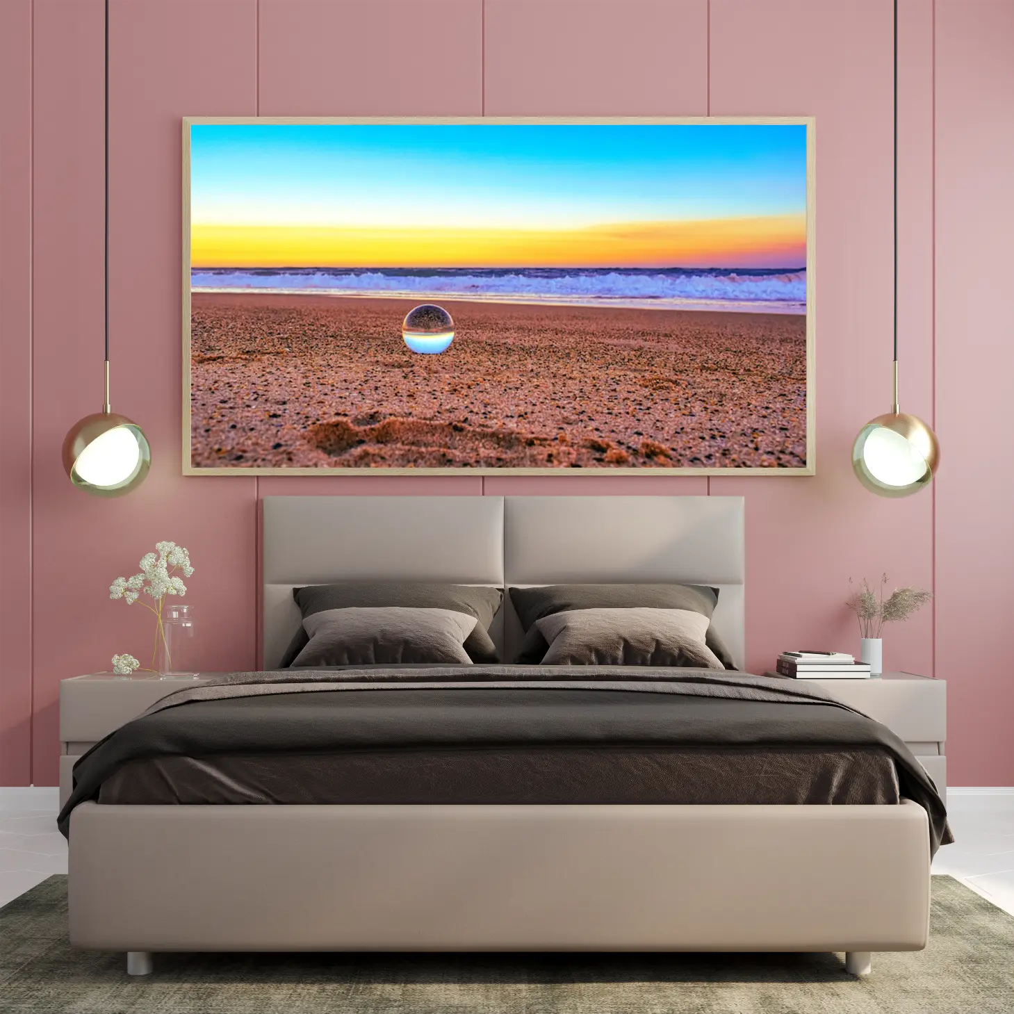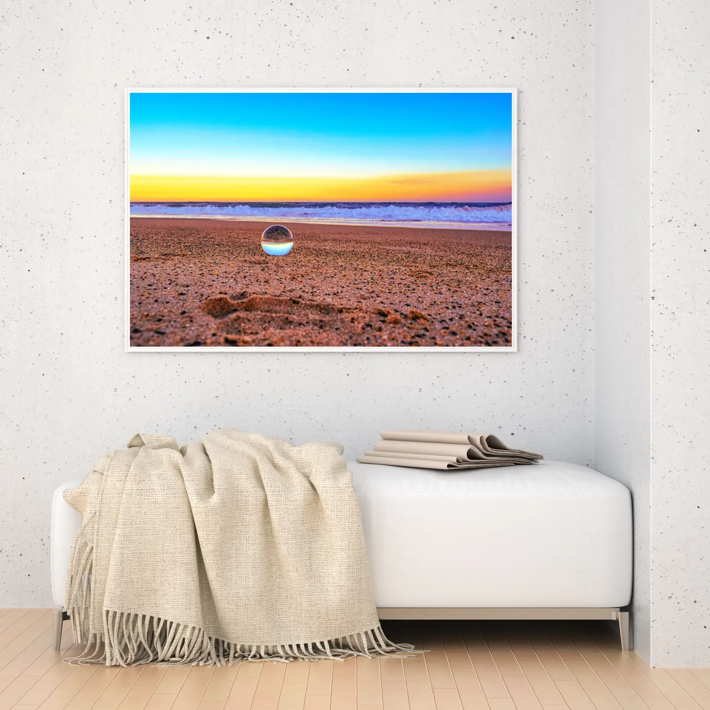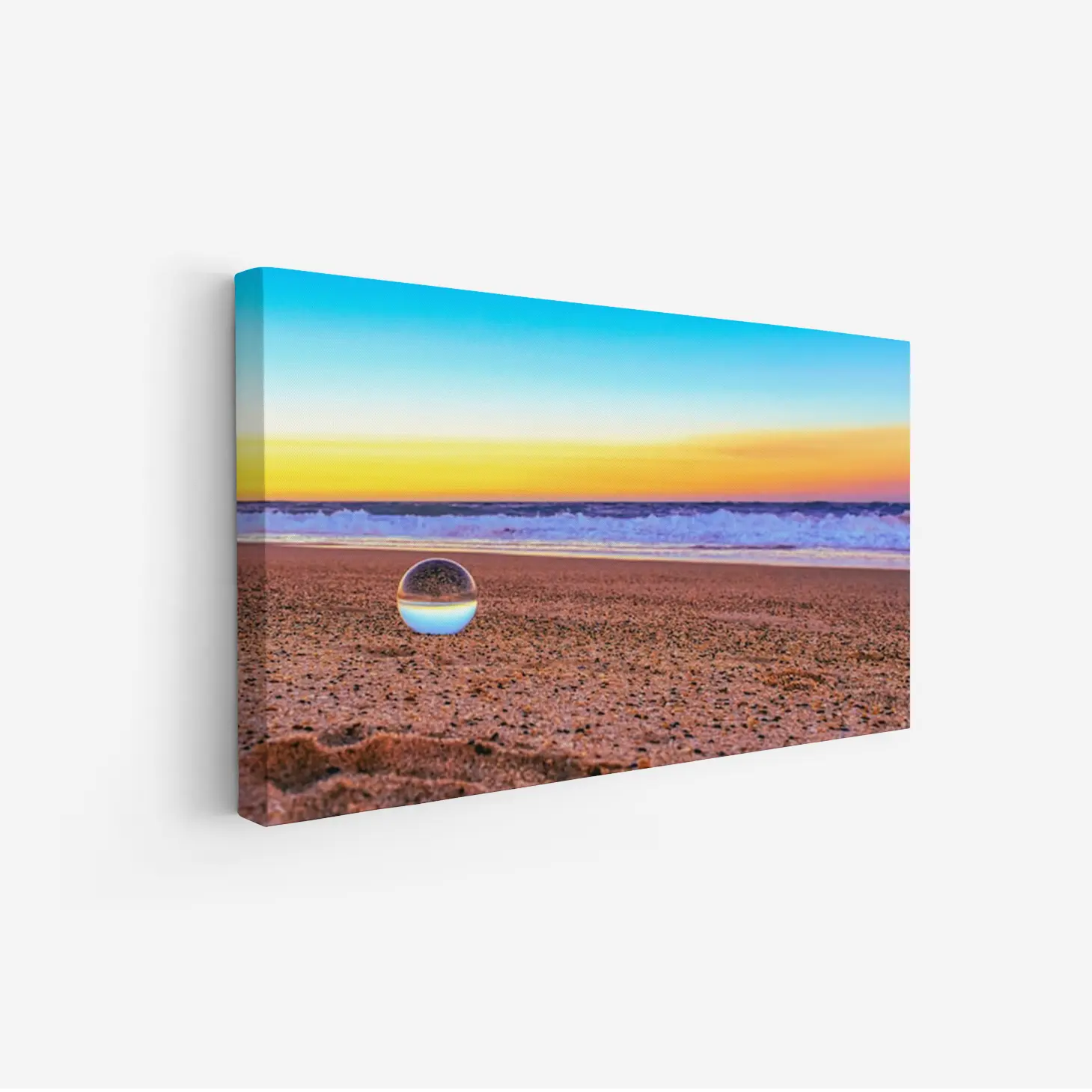 لوحات مناظر طبيعية تعكس شاطئًا هادئًا مع كرة زجاجية تعكس السماء الزرقاء وألوان الغروب الدافئة، لوحات فنية عصرية، لوحات جدارية للمنزل.