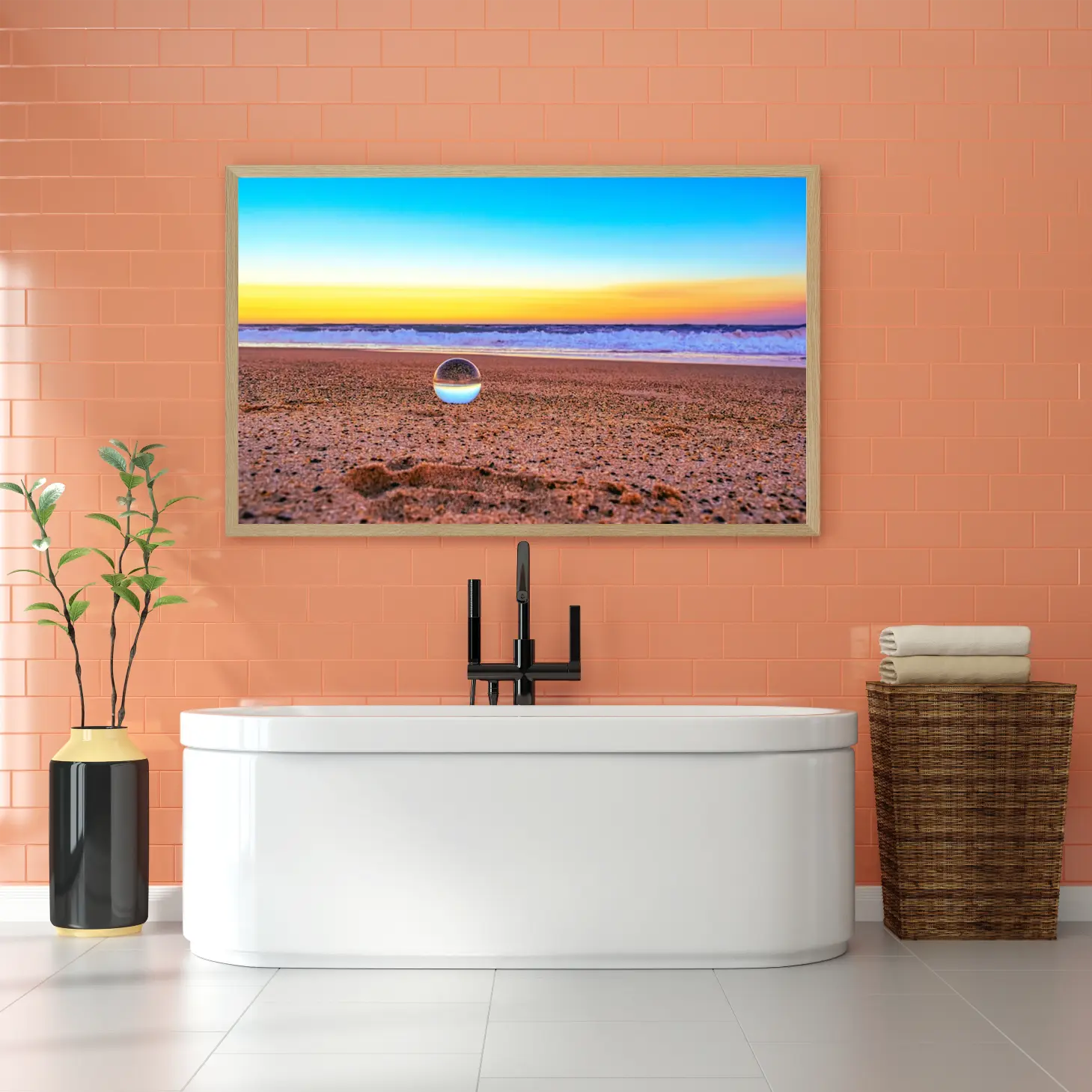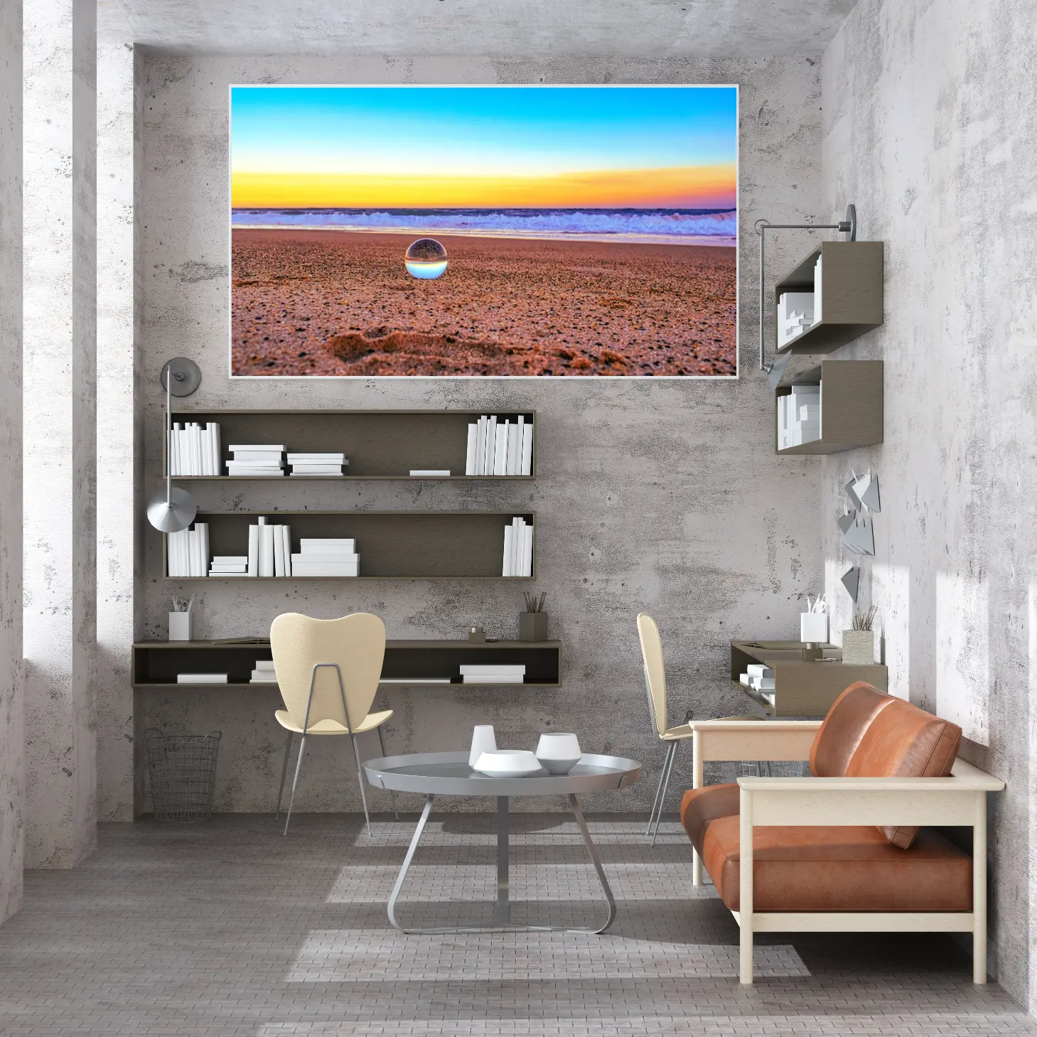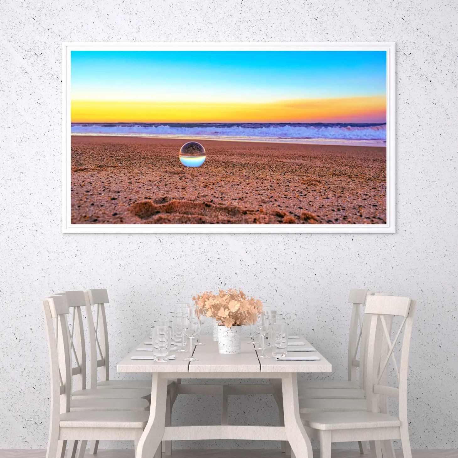 تتوسط اللوحة كرة زجاجية تعكس مشهد البحر والرمال، مما يضيف بعدًا إضافيًا للديكور الجداري. هذه الكرة ليست مجرد عنصر زينة، بل هي رمز للتأمل والتفكير في جمال الحياة. تعكس الكرة الزجاجية تفاصيل دقيقة من المشهد المحيط، مما يجعلها نقطة جذب للعين وتثير الفضول لدى المشاهدين.