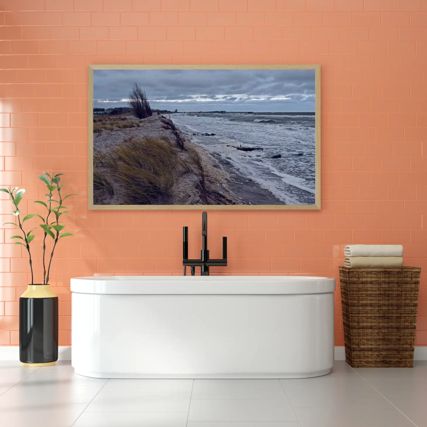 استمتع بجمال الطبيعة الخلابة مع هذه اللوحة التي تجسد سحر الشاطئ في لحظة هادئة. تبرز الأمواج المتلاطمة والأجواء الغائمة جمال البحر، مما يضفي لمسة من الهدوء والرومانسية على أي مساحة. أضف لمسة فنية إلى منزلك مع هذه التحفة التي تأسر الأنفاس.