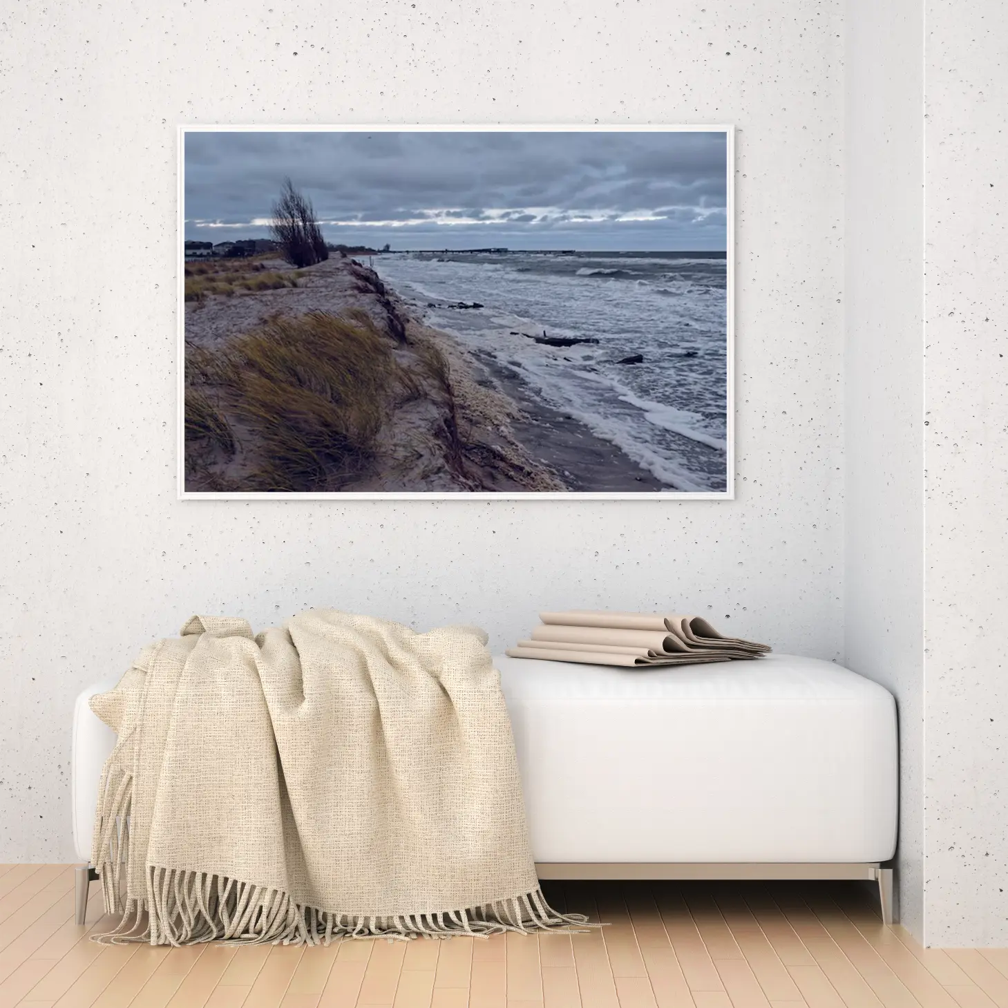 لوحات مناظر طبيعية تعكس شاطئًا هادئًا مع أمواج متلاطمة وأجواء غائمة، ألوان رمادية وزرقاء. لوحات فخمة، لوحات جدارية للمنزل، لوحات أنيقة.