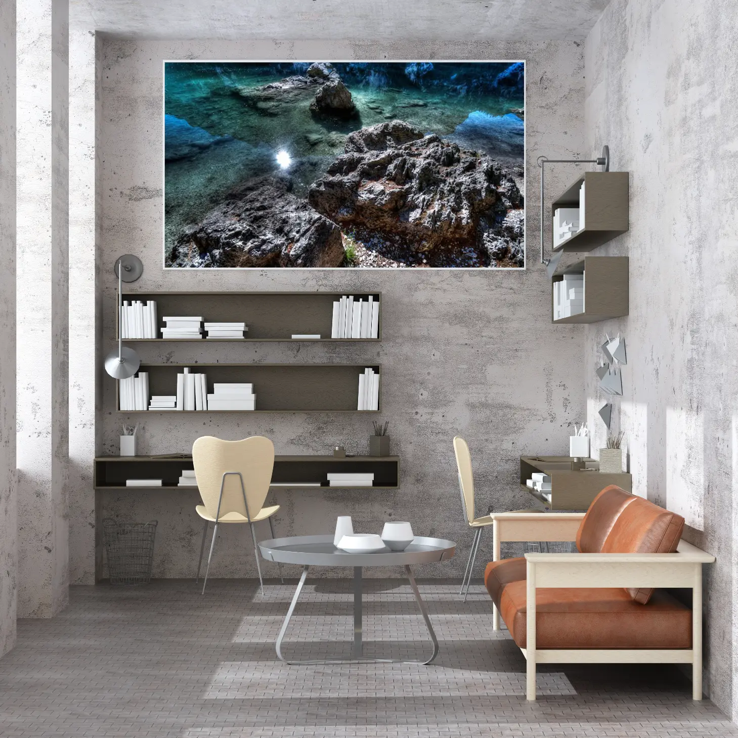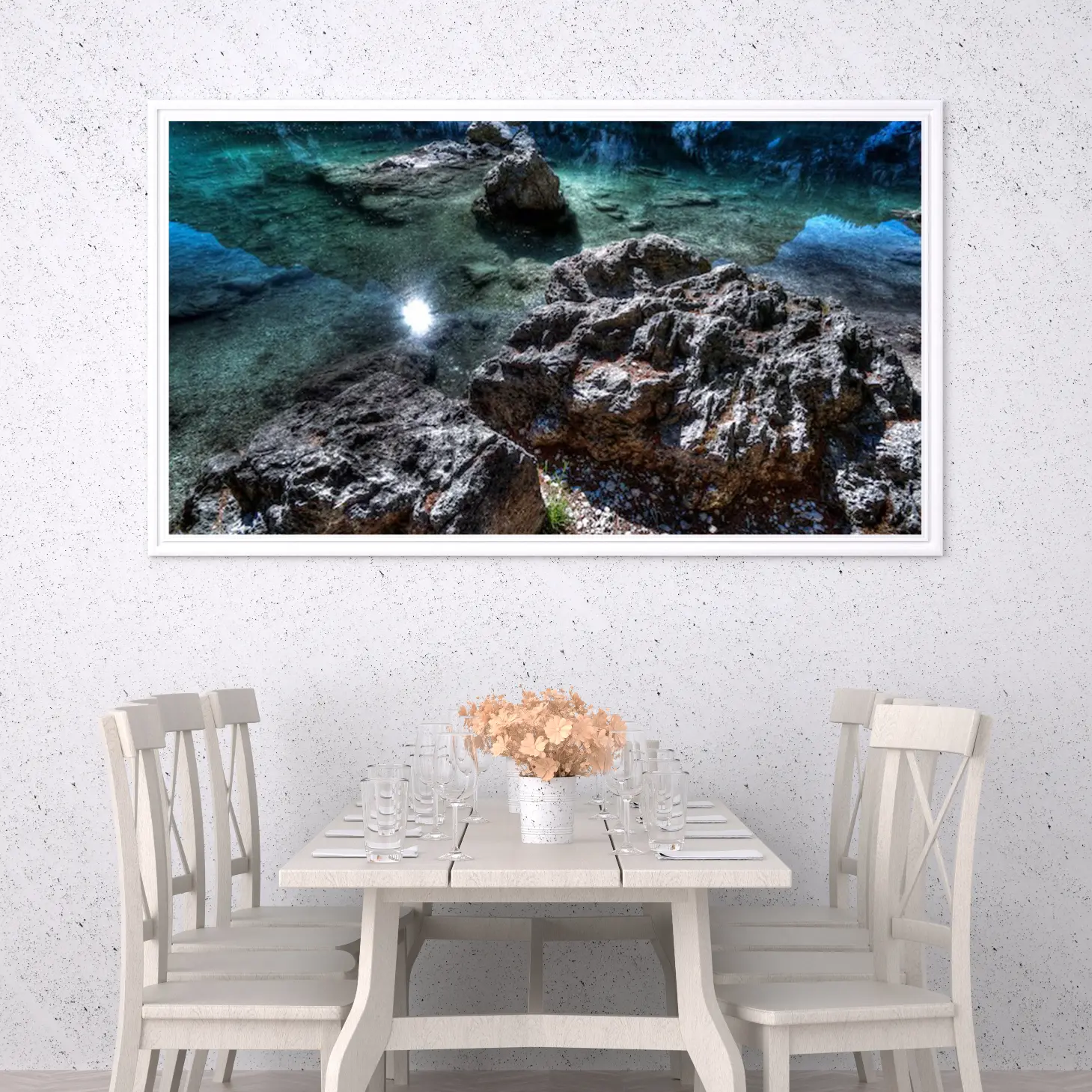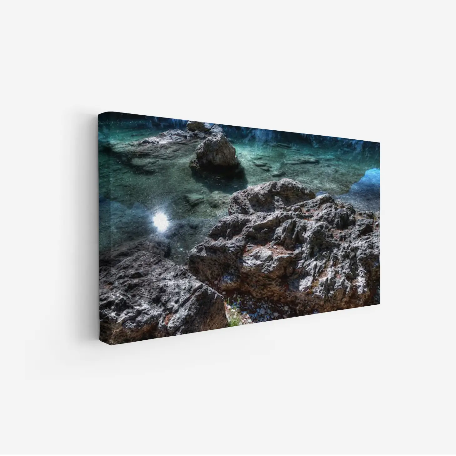 لوحات مناظر طبيعية تعكس صفاء المياه الزرقاء وصخور طبيعية، جو هادئ ومريح. لوحات فخمة، لوحات جدارية للمنزل، لوحات أنيقة.