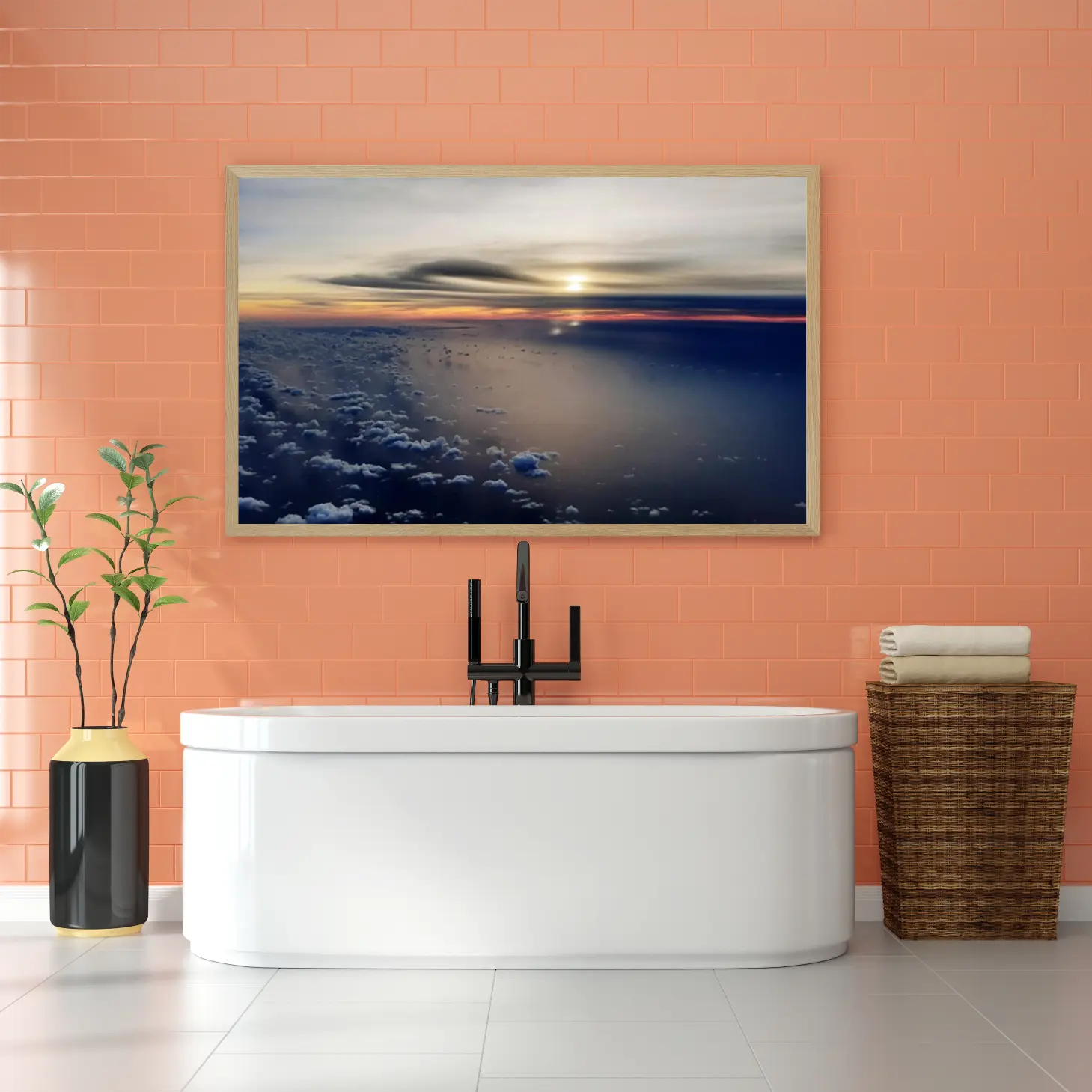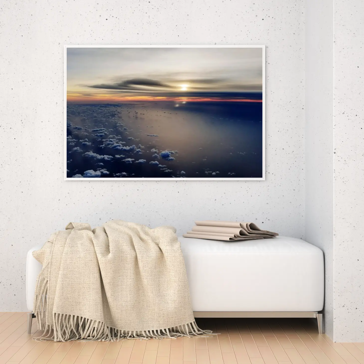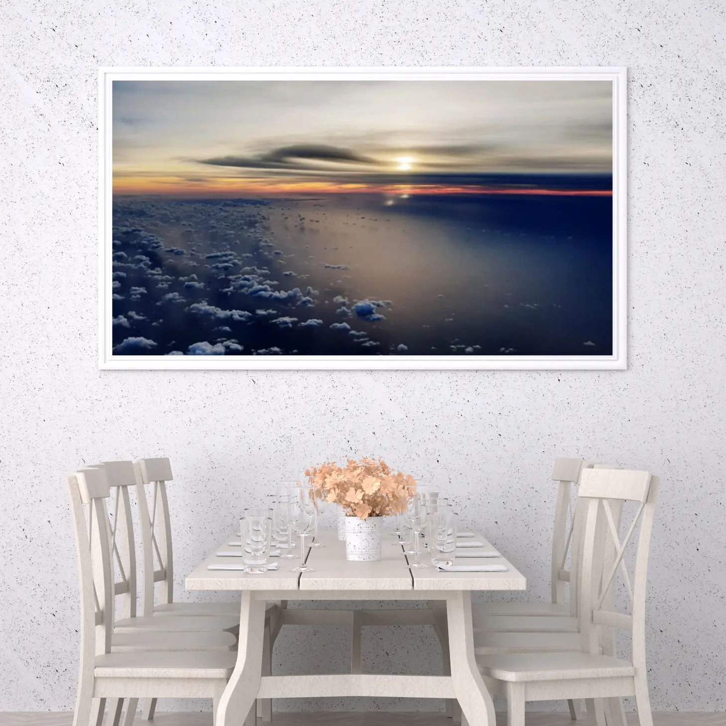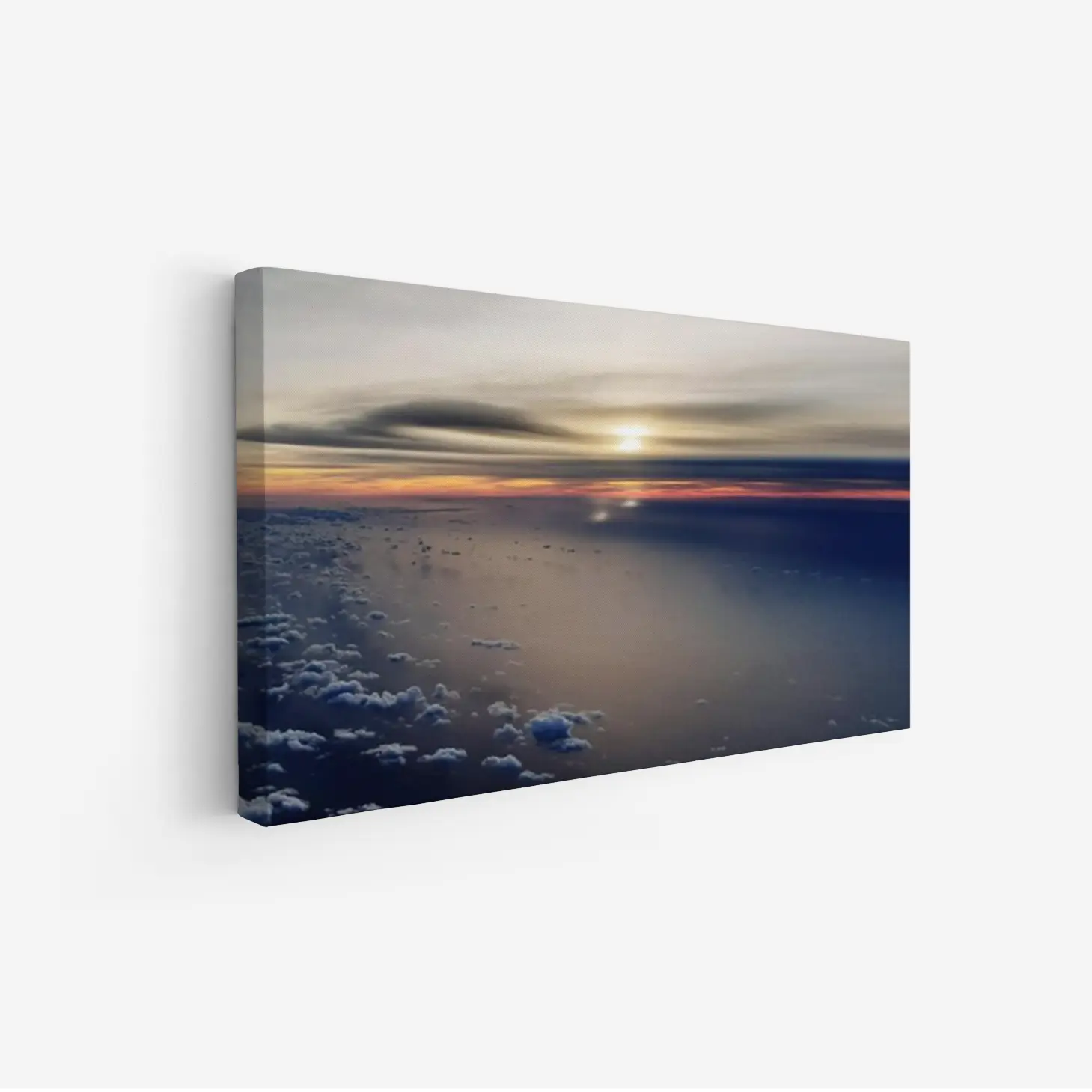 استمتع بجمال الطبيعة الخلاب مع هذه اللوحة التي تلتقط لحظة غروب الشمس الساحرة فوق المحيط. ألوان دافئة تتناغم مع سكون السماء، مما يضفي لمسة من الهدوء والرقي على أي مساحة. اجعل من جدران منزلك لوحة فنية تعكس ذوقك الرفيع.