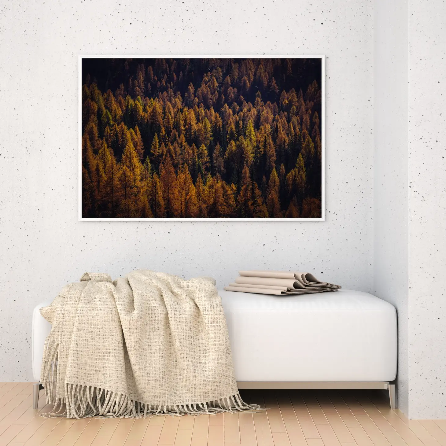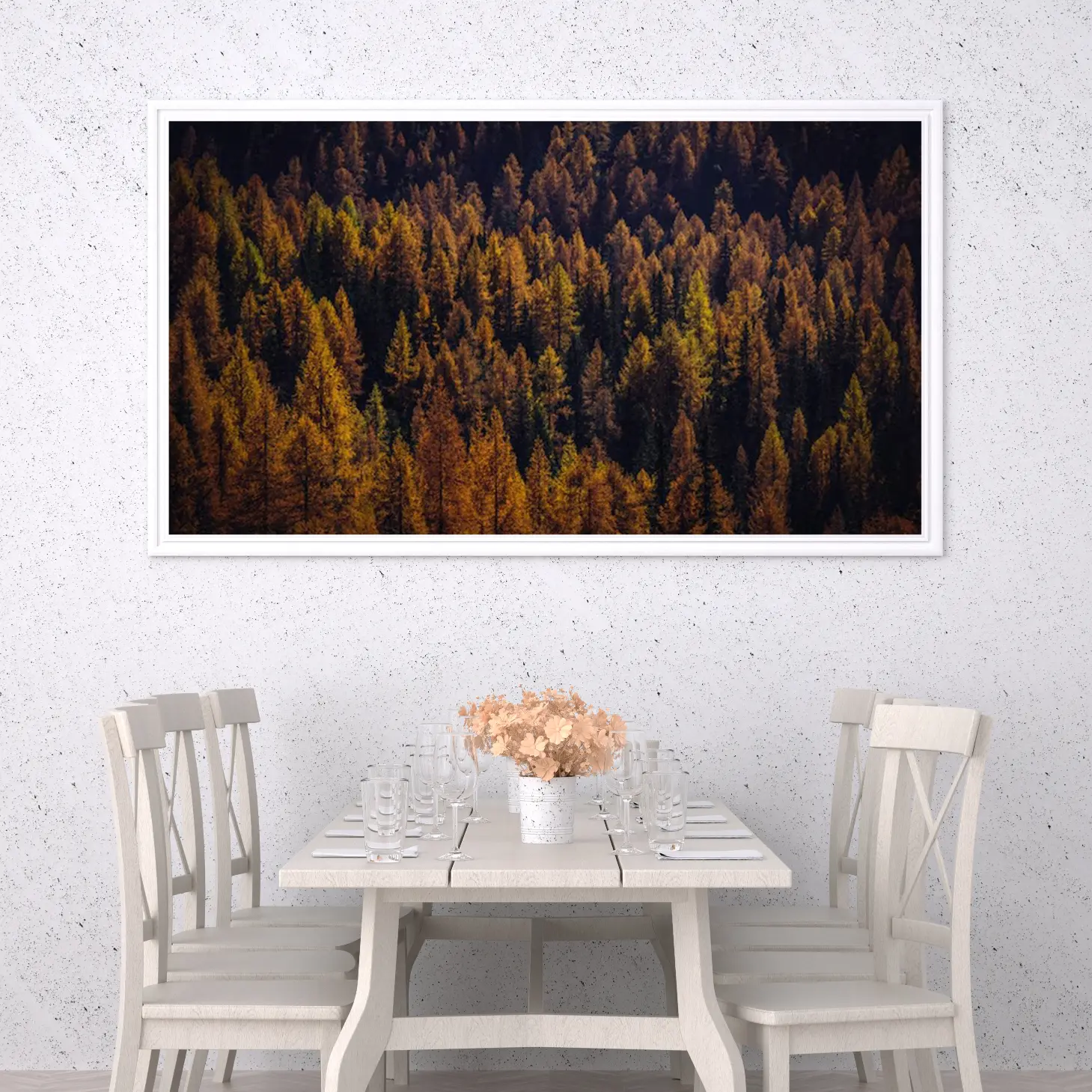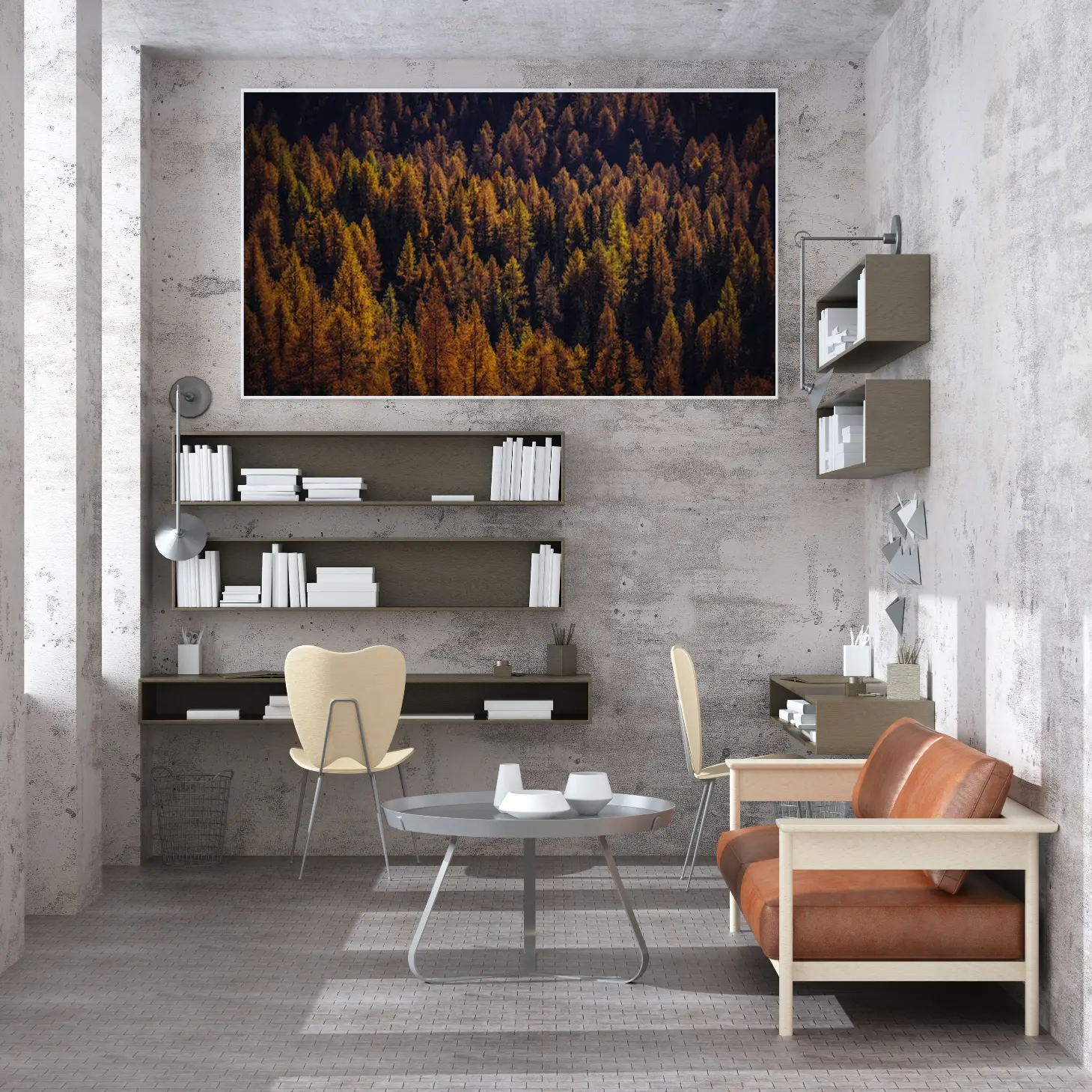 تجسد هذه اللوحات الفنية جمال الطبيعة الخلابة، حيث تتناغم الألوان الدافئة مع تفاصيل الغابة الكثيفة. تتألق الأشجار بألوانها المتنوعة، من الأخضر الزاهي إلى الأصفر والبرتقالي، مما يخلق مشهدًا ساحرًا يجذب الأنظار ويعكس روح الحياة البرية. إن هذا العمل الفني يعكس التوازن المثالي بين الألوان، مما يجعله إضافة مثالية لأي مساحة داخلية.