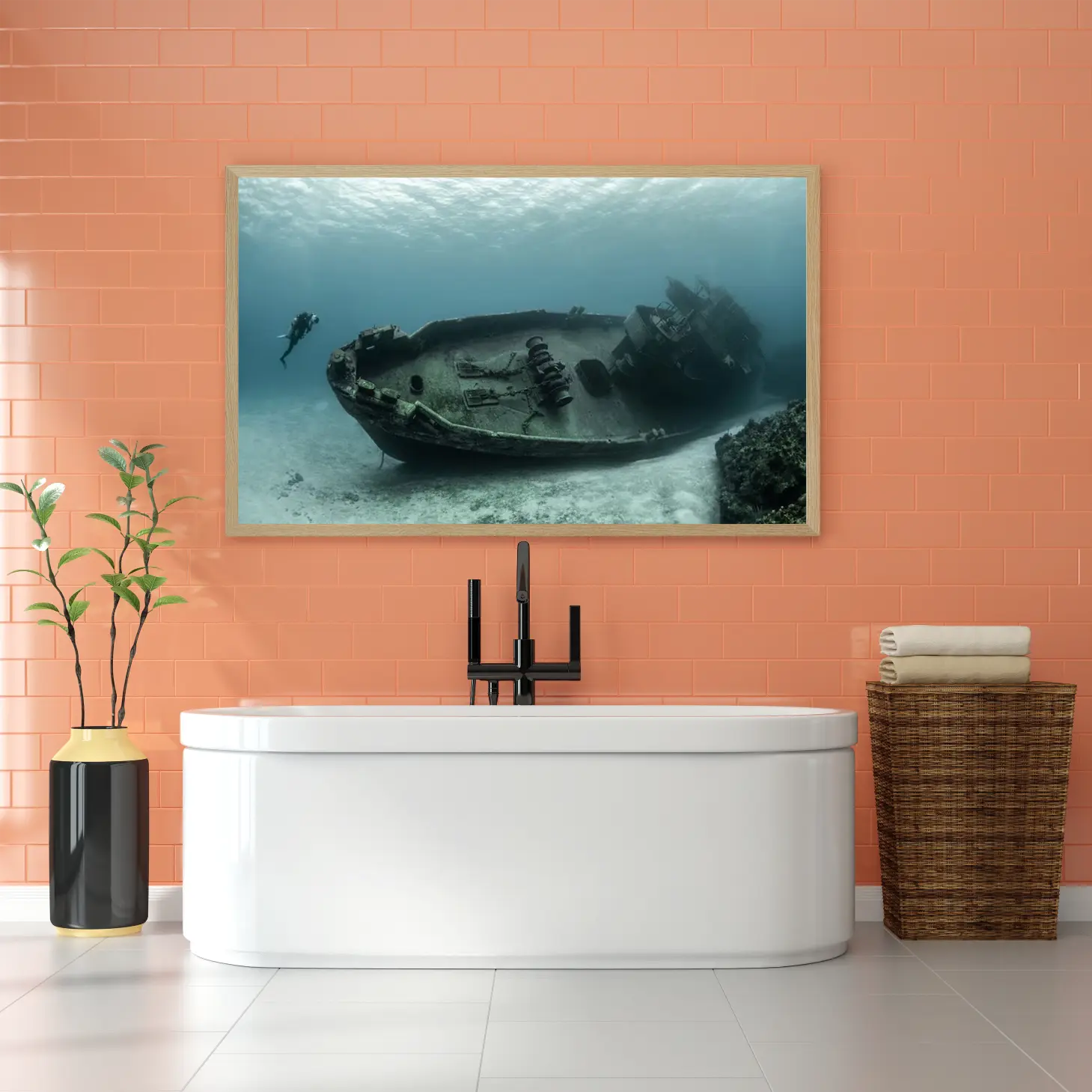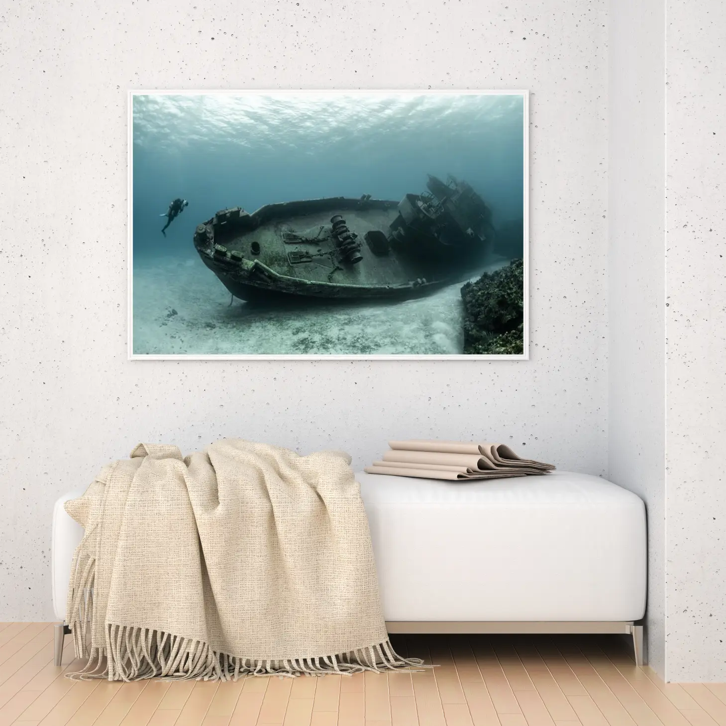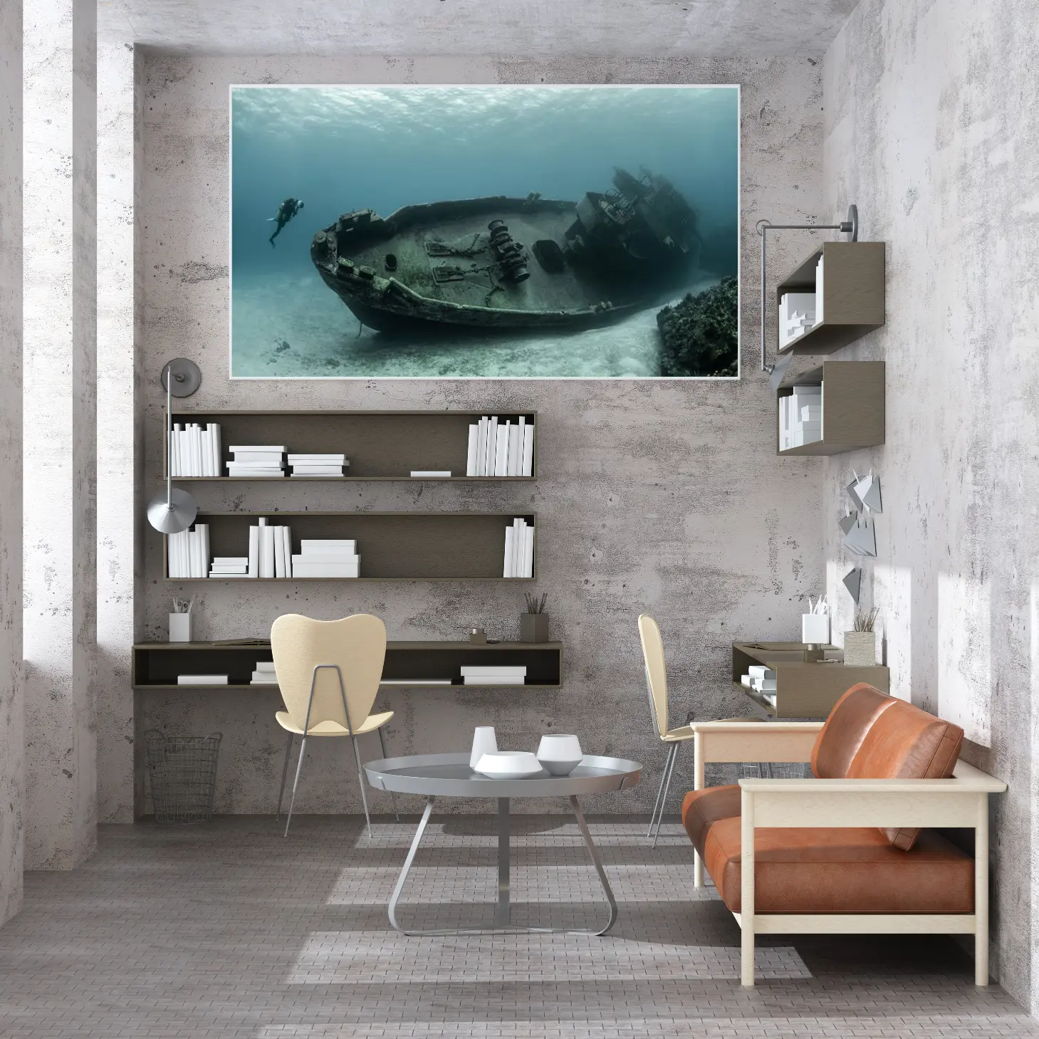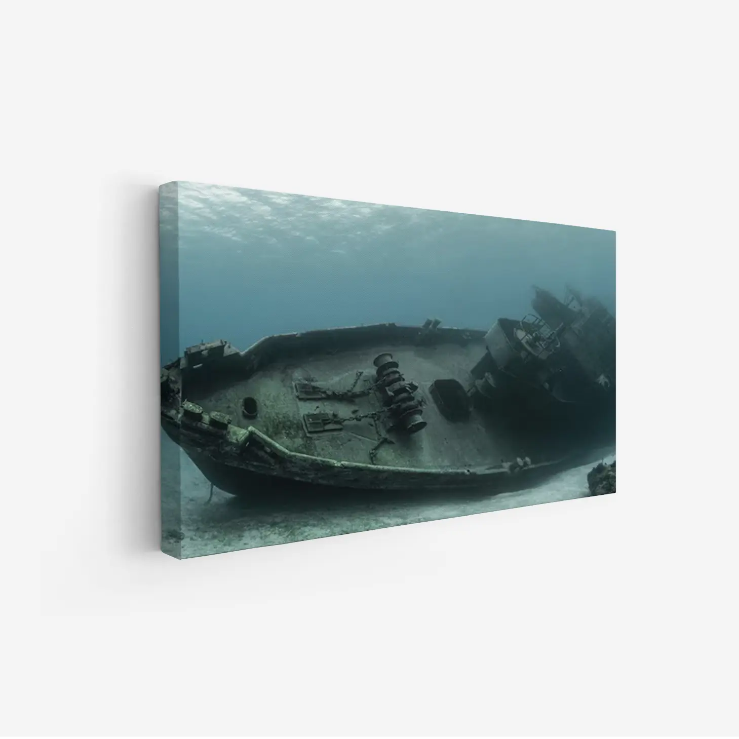 تجسد هذه اللوحات كانفاس عمق المحيطات وغموضها، حيث تعرض مشهدًا فريدًا لسفينة غارقة تحت سطح الماء. يبرز التصميم الأنيق تفاصيل السفينة التي تآكلت بفعل الزمن، مما يضفي طابعًا تاريخيًا على المساحة التي تزينها. الألوان الهادئة والمائية تعكس جمال المحيط، مما يجعلها خيارًا مثاليًا لعشاق البحر والطبيعة.