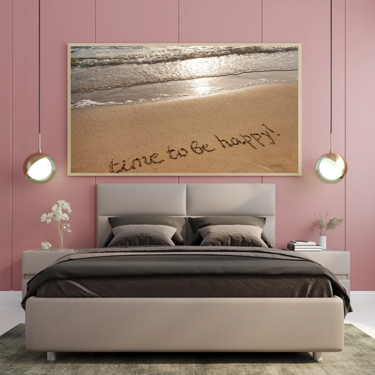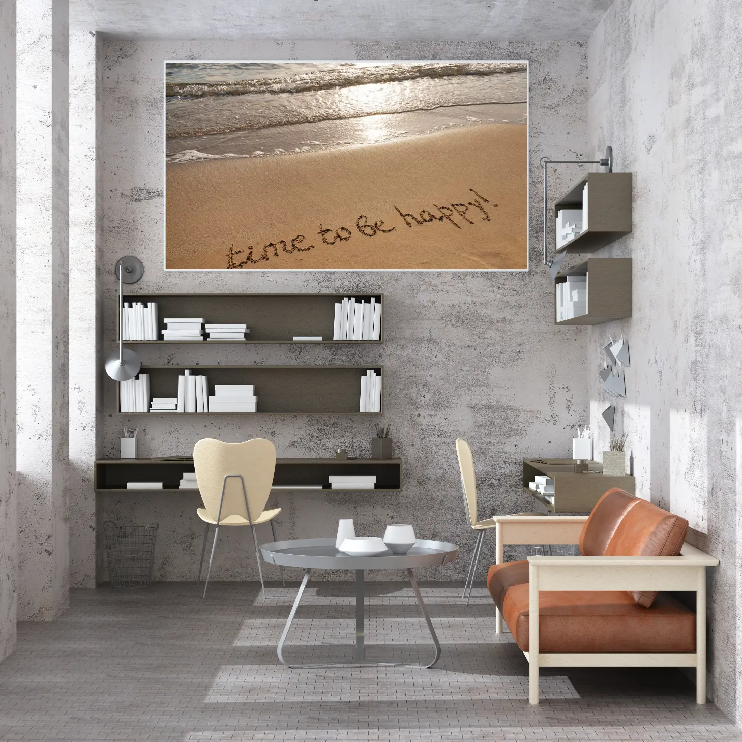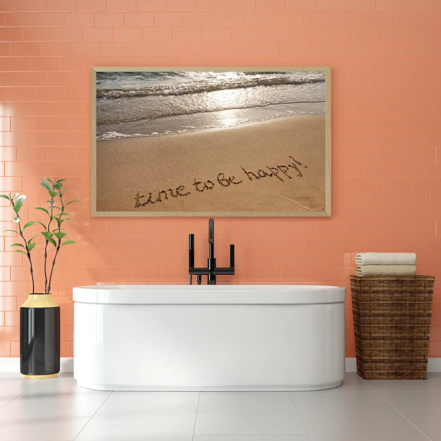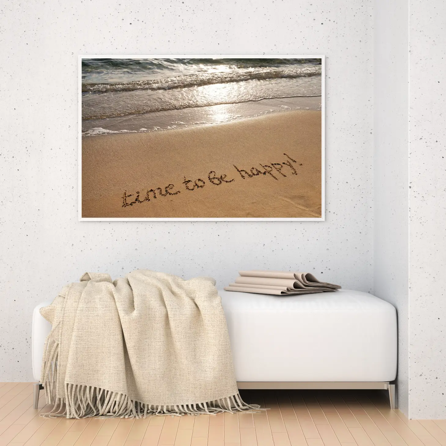 لوحات مناظر طبيعية لشاطئ رملي مع عبارة “time to be happy” بألوان دافئة وجو مريح، لوحات جدارية للمنزل، لوحات فنية عصرية.