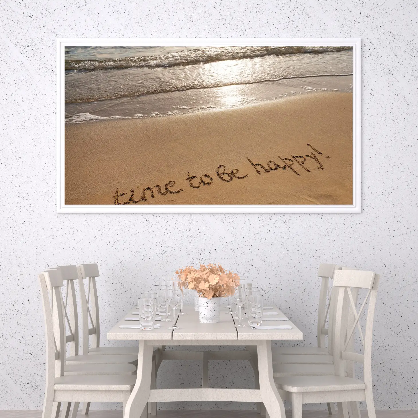 تجسد هذه اللوحة الفنية روح السعادة والهدوء من خلال مشهد ساحر يجمع بين الرمال الذهبية والمياه المتلألئة. تعكس الألوان الدافئة للوحة إحساسًا بالراحة والسكينة، مما يجعلها خيارًا مثاليًا لإضفاء لمسة من الجمال الطبيعي على أي مساحة داخلية. إن وجود عبارة “time to be happy!” مكتوبة برقة على الرمال يضيف بعدًا عاطفيًا، مما يشجع على التفاؤل والإيجابية في الحياة اليومية.
