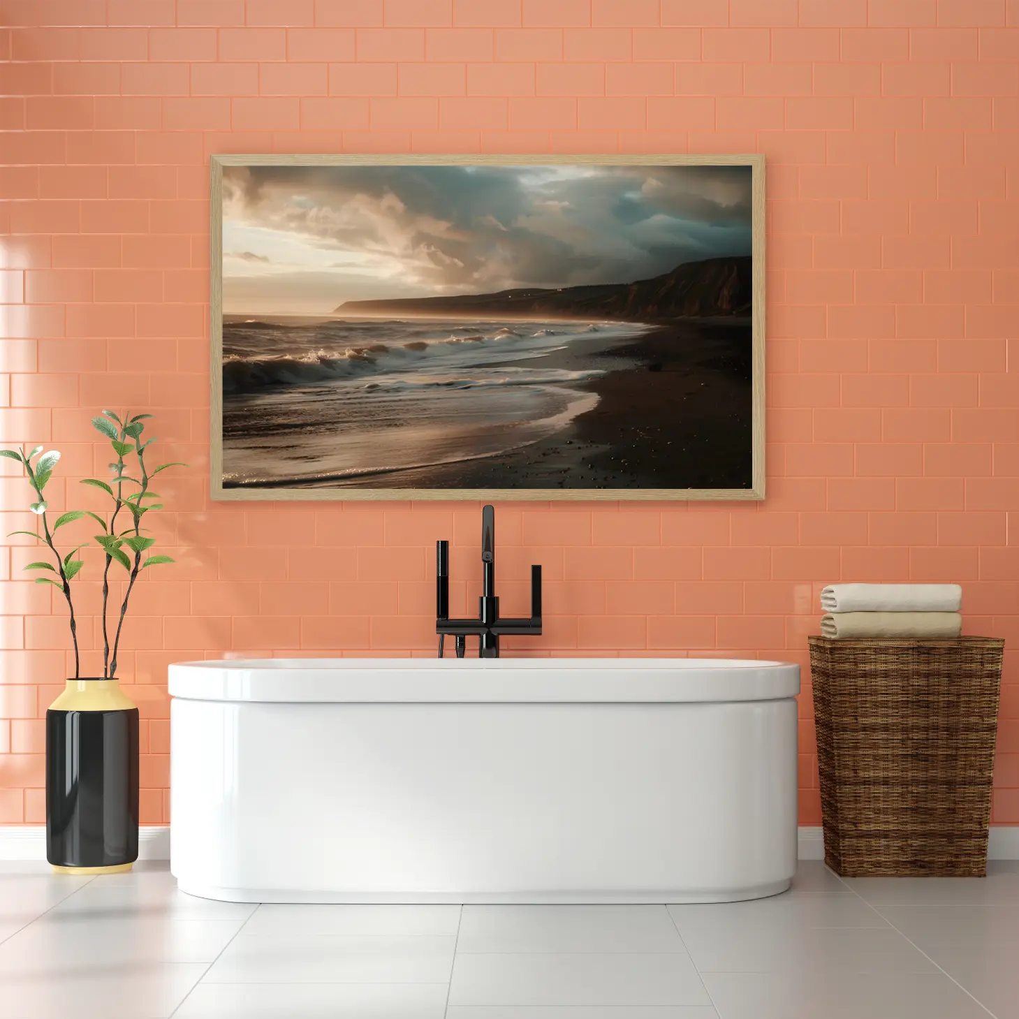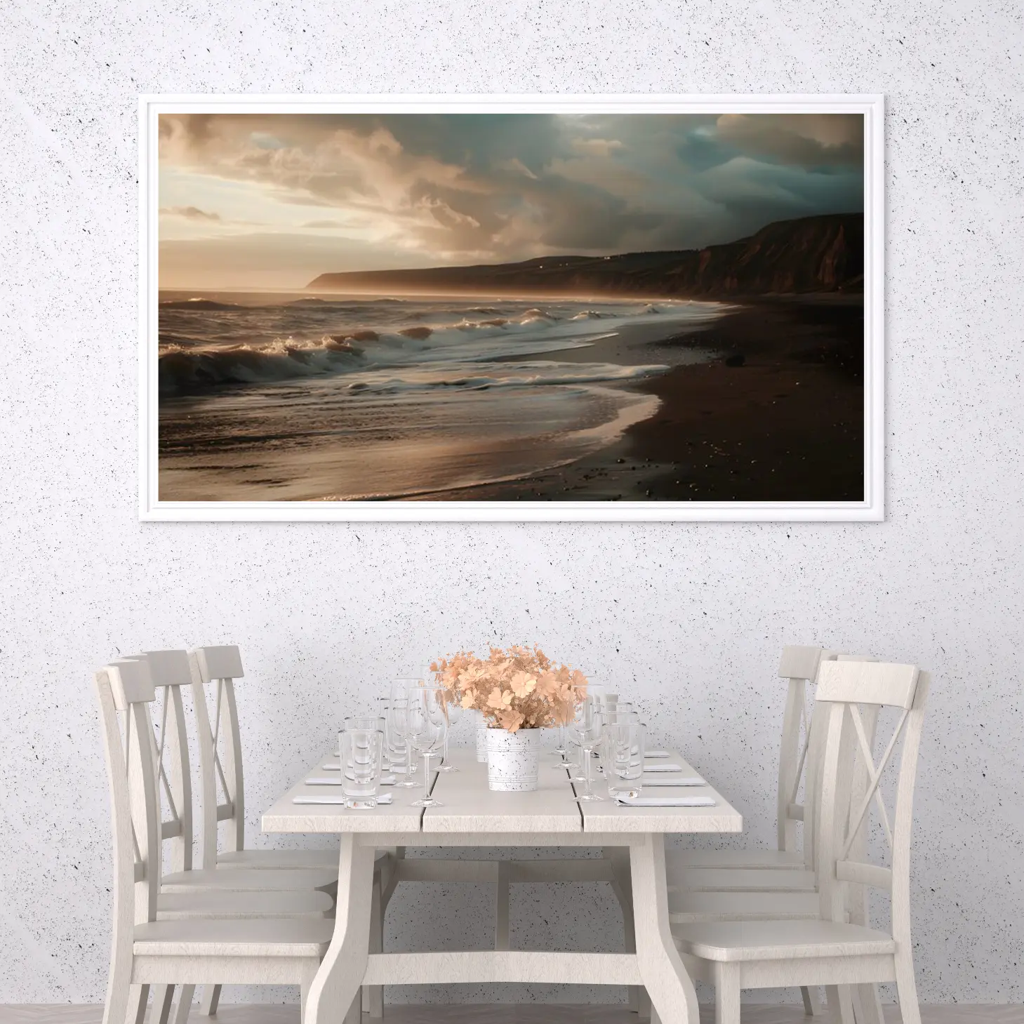 استمتع بجمال الطبيعة الخلابة مع هذه اللوحة التي تجسد سحر الشاطئ تحت ضوء الغروب. تعكس الأمواج المتلاطمة والألوان الدافئة لحظات من الهدوء والسكينة، مما يجعلها إضافة مثالية لأي مساحة تبحث عن لمسة من الأناقة والراحة.