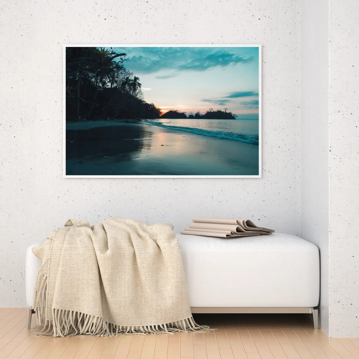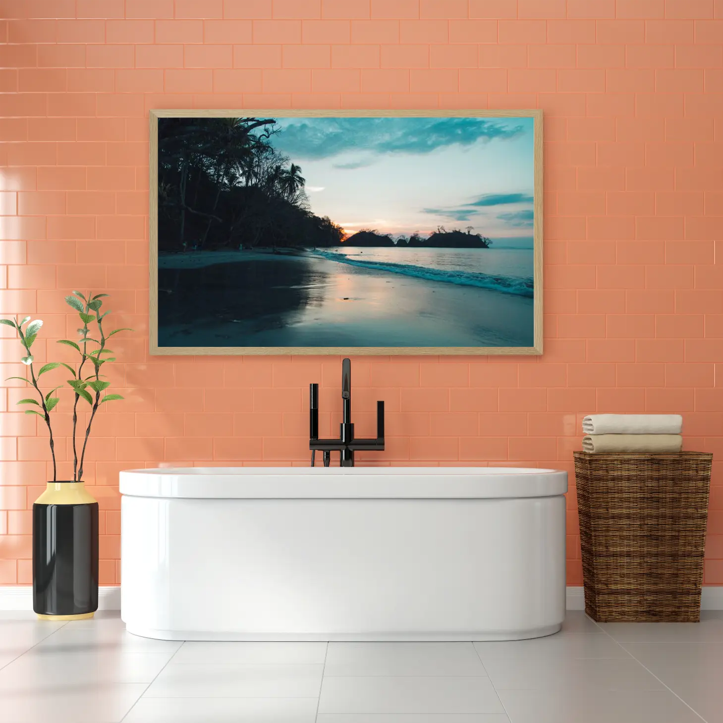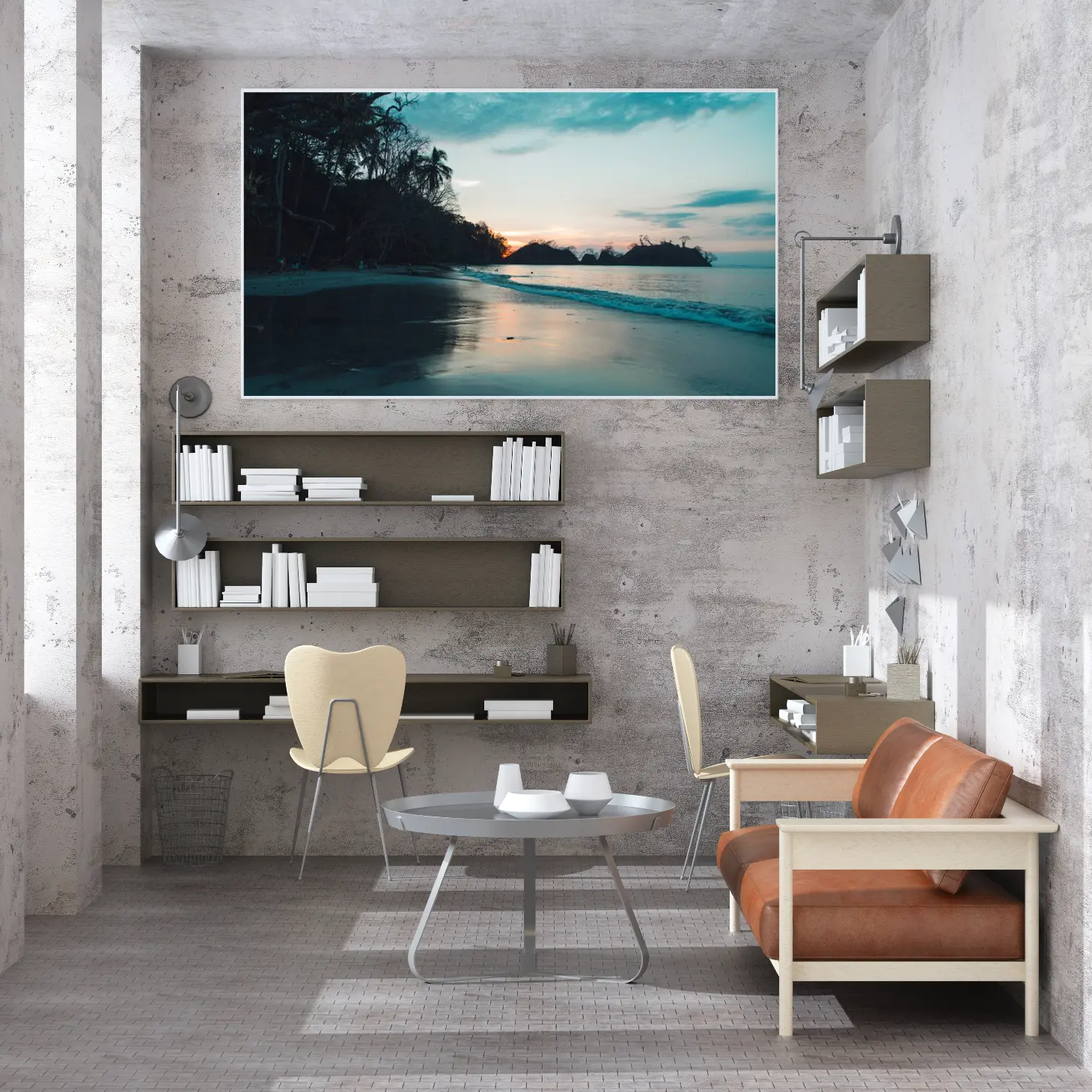 لوحات مناظر طبيعية لشاطئ هادئ عند غروب الشمس، ألوان زرقاء ووردية، جو مريح. لوحات جدارية للمنزل، لوحات فخمة، لوحات أنيقة.