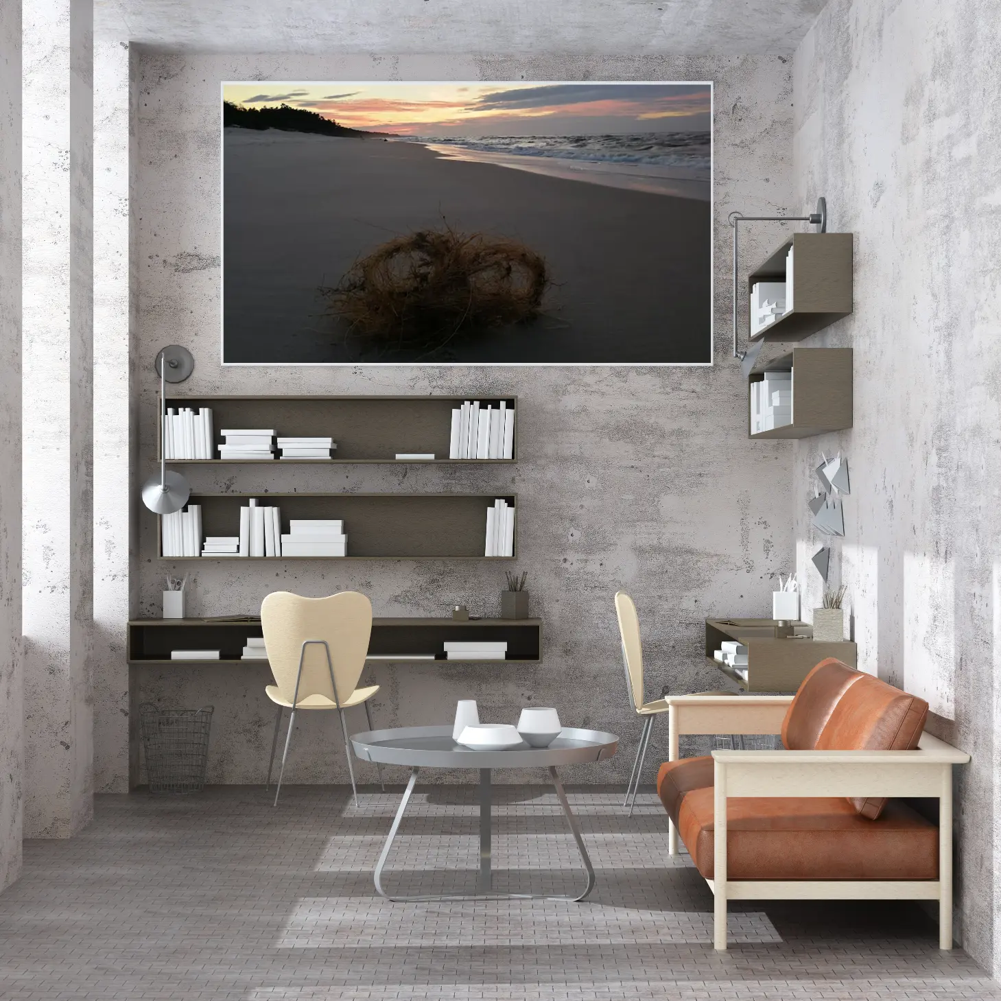 تجسد هذه اللوحات الفنية جمال الطبيعة الخلابة، حيث تلتقي الرمال الذهبية بمياه البحر الزرقاء في مشهد ساحر. يظهر في المقدمة كائن طبيعي يتناغم مع البيئة المحيطة، مما يضيف لمسة من الأصالة والعمق إلى العمل الفني. الألوان الدافئة التي تزين السماء في لحظات الغروب تعكس شعورًا بالهدوء والسكينة، مما يجعلها خيارًا مثاليًا لتزيين المساحات الداخلية.