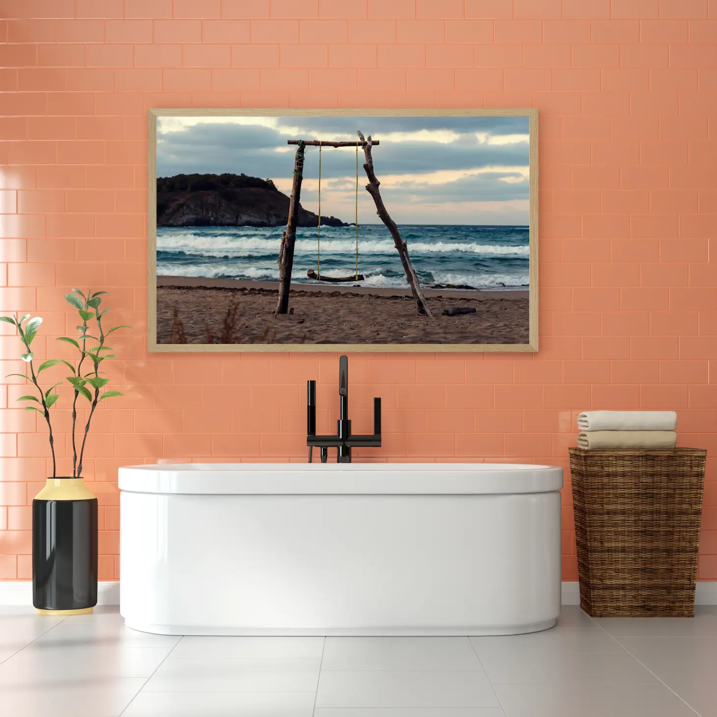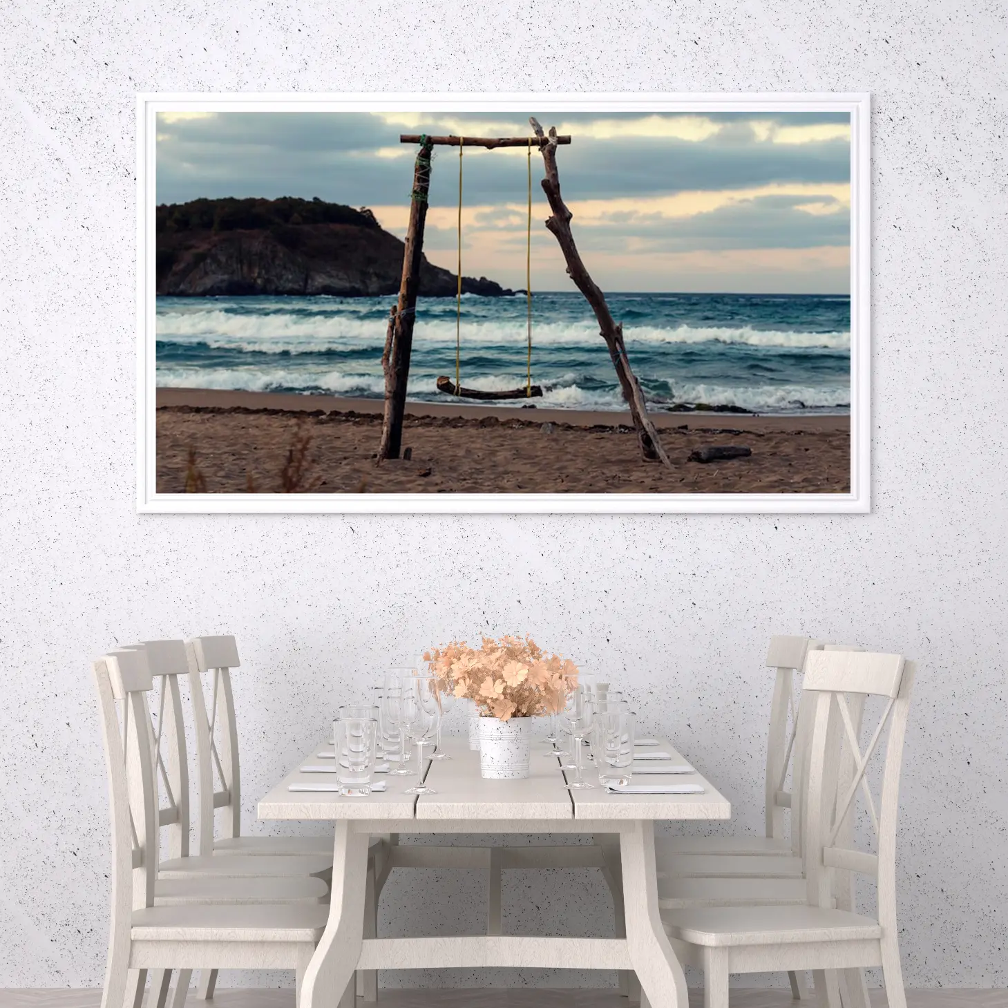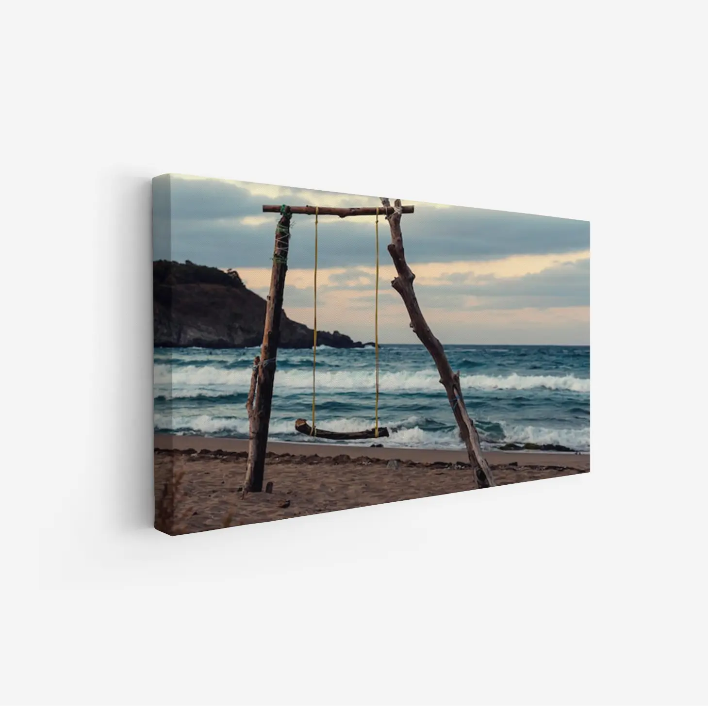 تجسد هذه اللوحات كانفاس جمال الطبيعة وهدوء البحر، حيث تتناغم الألوان الدافئة مع الأجواء الهادئة. يظهر في المشهد أرجوحة مصنوعة من الخشب، معلقة بين عمودين خشبيين، مما يضفي لمسة من البساطة والأصالة. تتلاعب الأمواج بلطف على الشاطئ، مما يخلق إحساسًا بالسكينة والراحة، ويعكس جمال اللحظات البسيطة في الحياة.