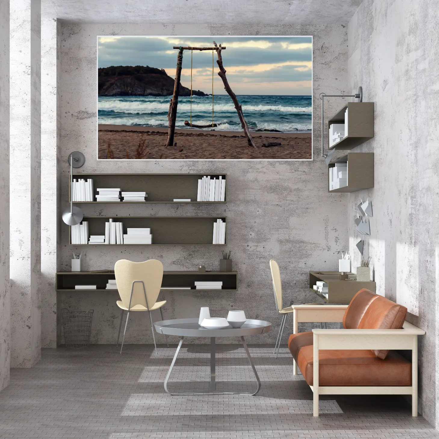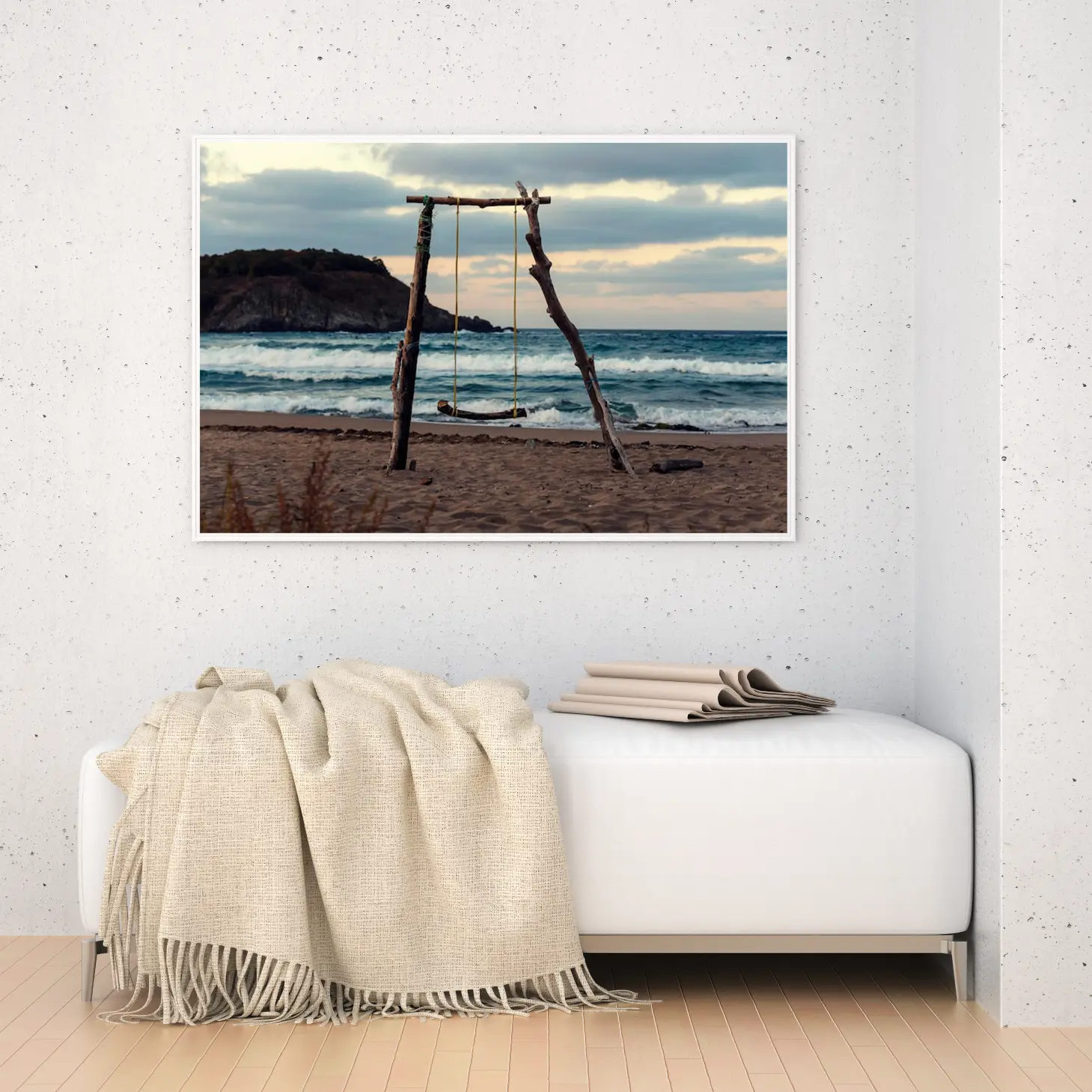 لوحات مناظر طبيعية لشاطئ هادئ مع أرجوحة خشبية، ألوان البحر الزرقاء والسماء الرمادية، جو مريح. لوحات فنية عصرية، لوحات جدارية للمنزل، لوحات أنيقة.