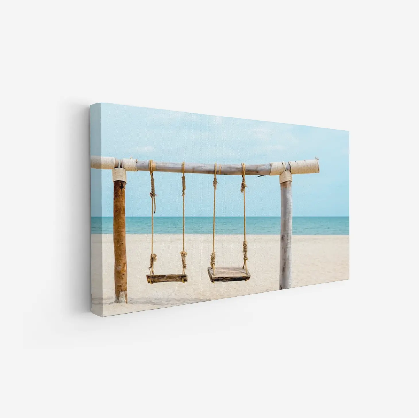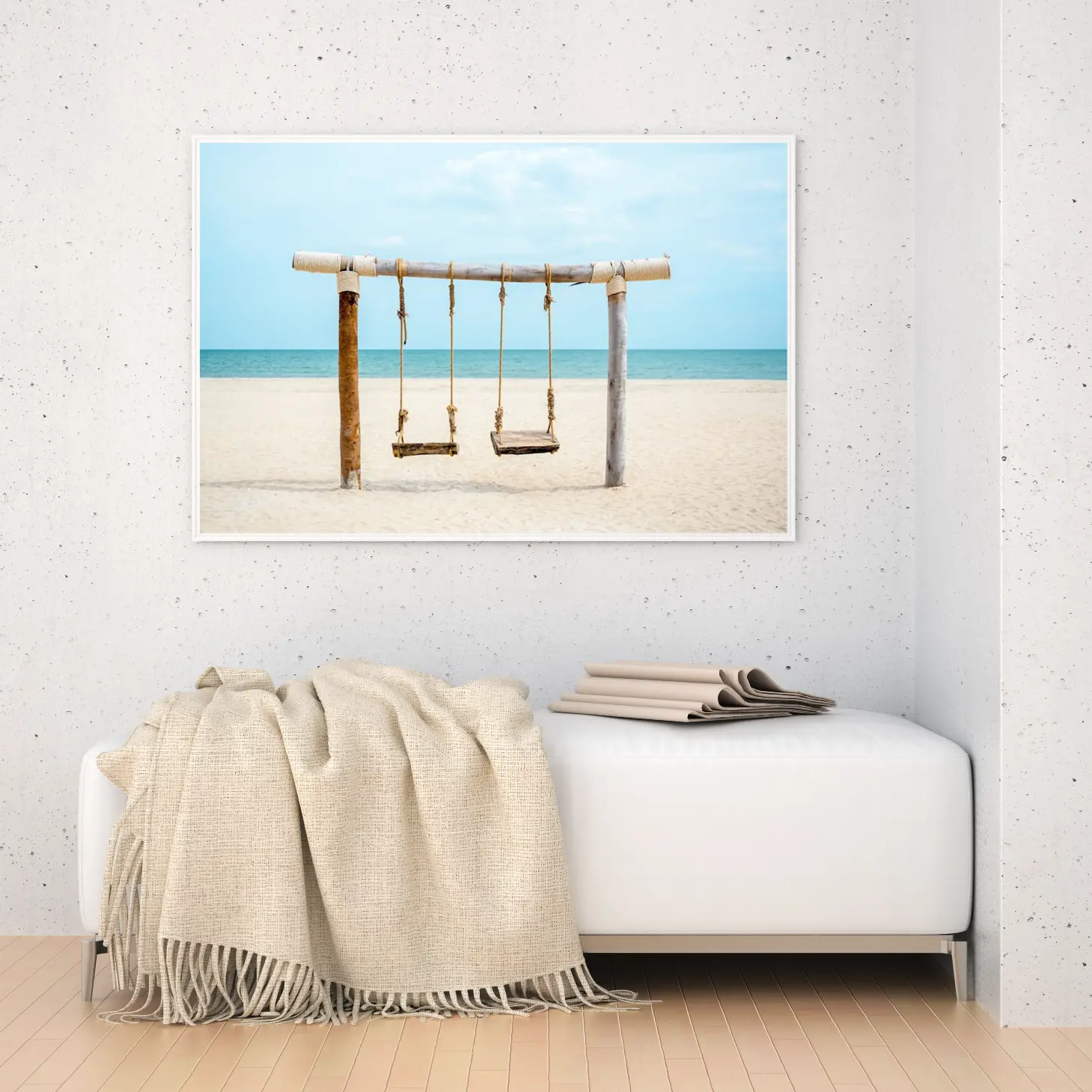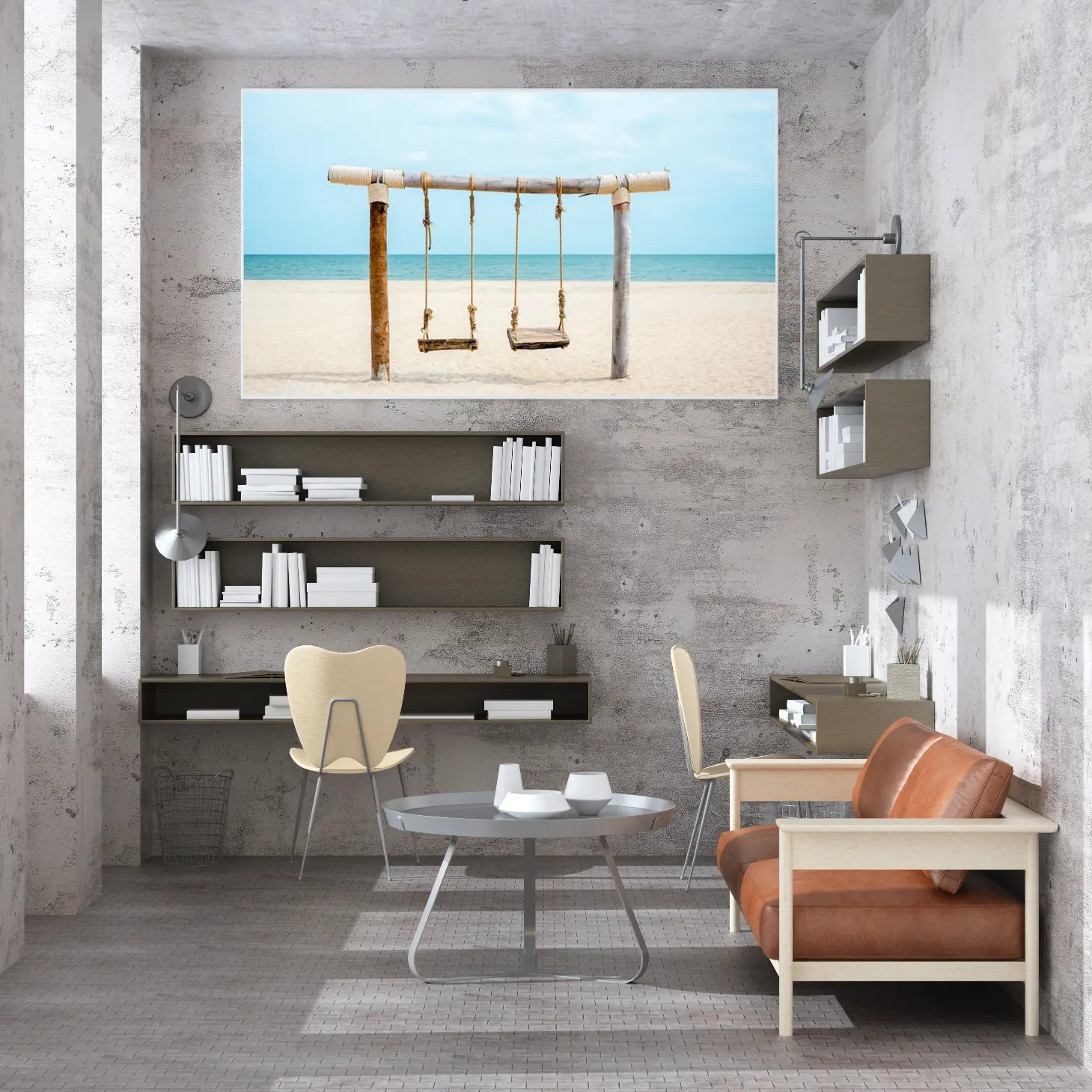 لوحات مناظر طبيعية لشاطئ هادئ مع أرجوحة خشبية، ألوان زرقاء ورملية، جو مريح. لوحات جدارية للمنزل، لوحات فنية عصرية، لوحات أنيقة.