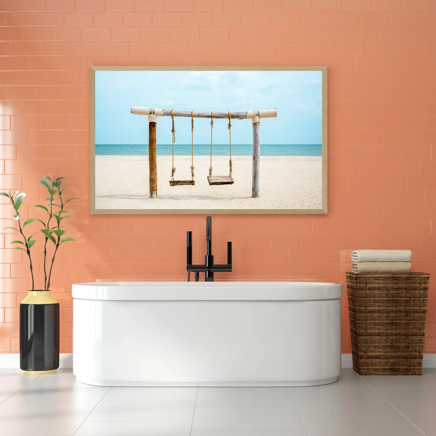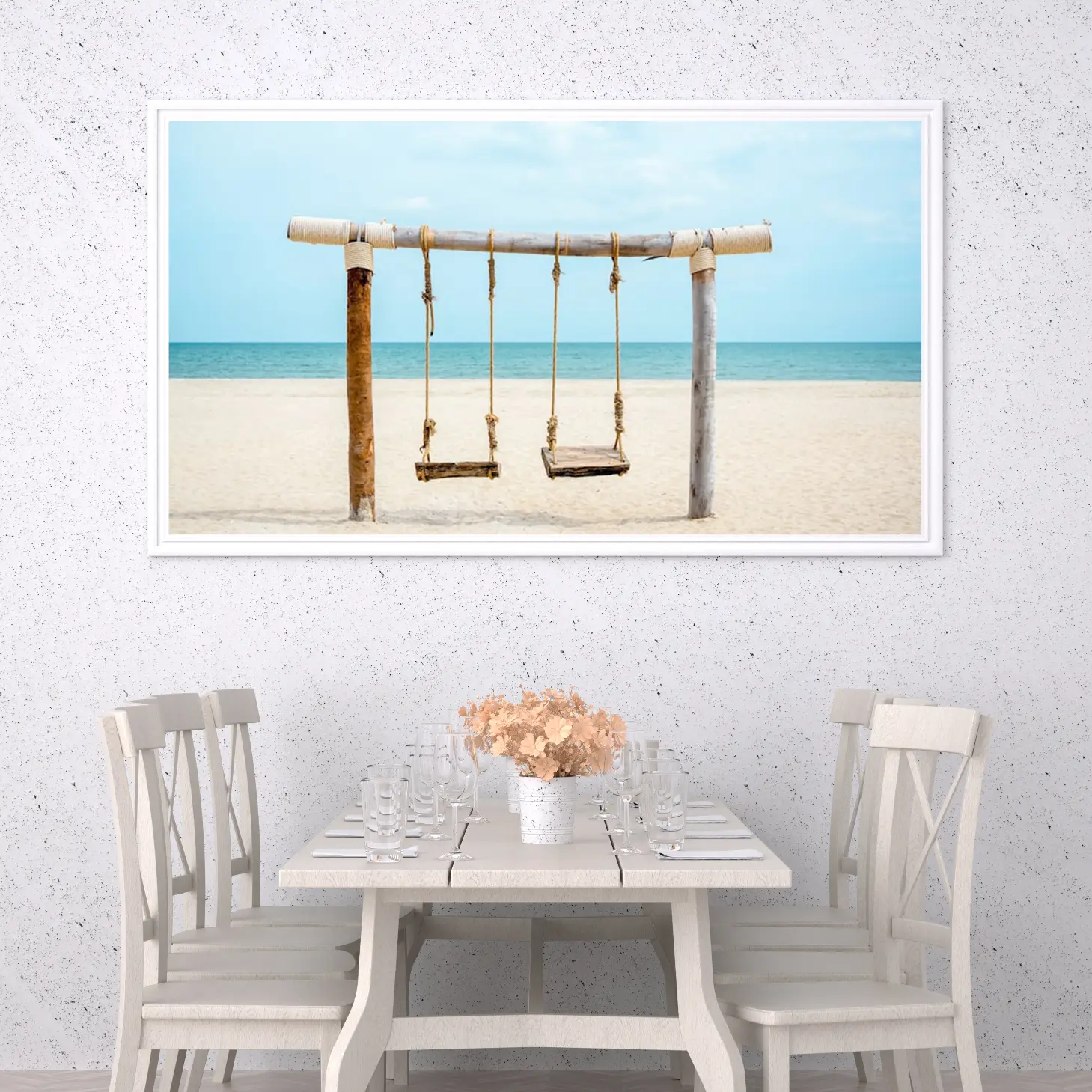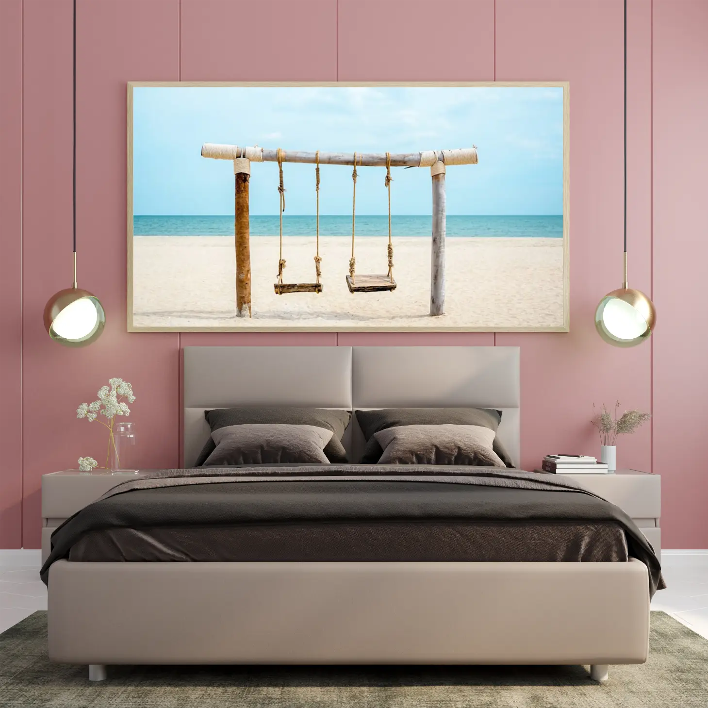 لوحات مناظر طبيعية لشاطئ هادئ مع أرجوحة خشبية، ألوان زرقاء ورملية، جو مريح. لوحات جدارية للمنزل، لوحات فنية عصرية، لوحات أنيقة.